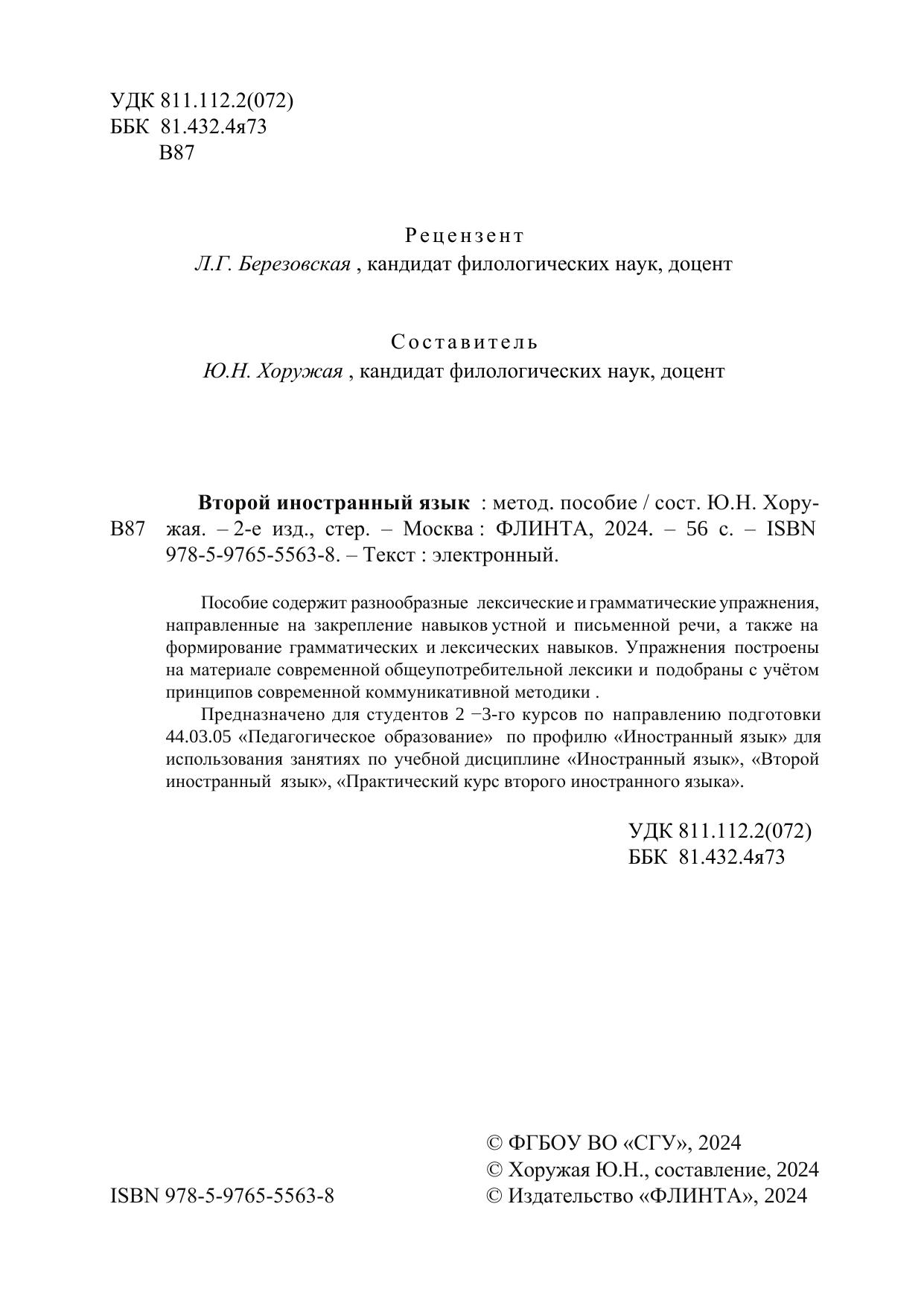 Пособие содержит разнообразные лексические и грамматические упражнения, направленные на закрепление навыков устной и письменной речи, а также на формирование грамматических и лексических навыков. Упражнения построены на материале современной общеупотребительной лексики и подобраны с учётом принципов современной коммуникативной методики. Предназначено для студентов 2−3-го курсов по направлению подготовки 44.03.05 «Педагогическое образование» по профилю «Иностранный язык и Иностранный язык» для использования занятиях по учебной дисциплине «Иностранный язык», «Второй иностранный язык», «Практический курс второго иностранного языка».