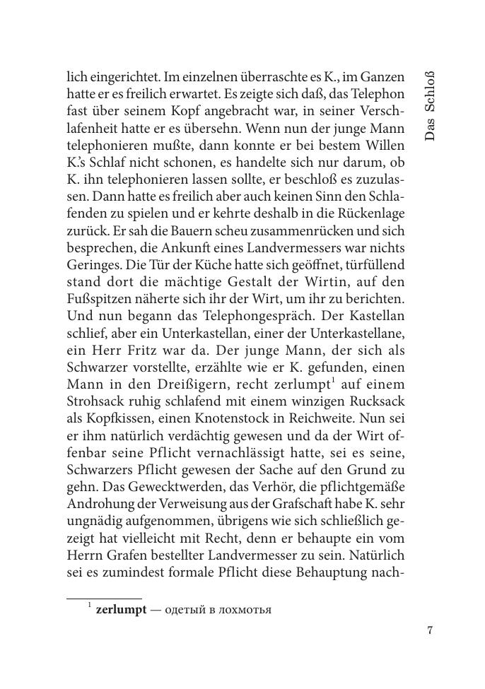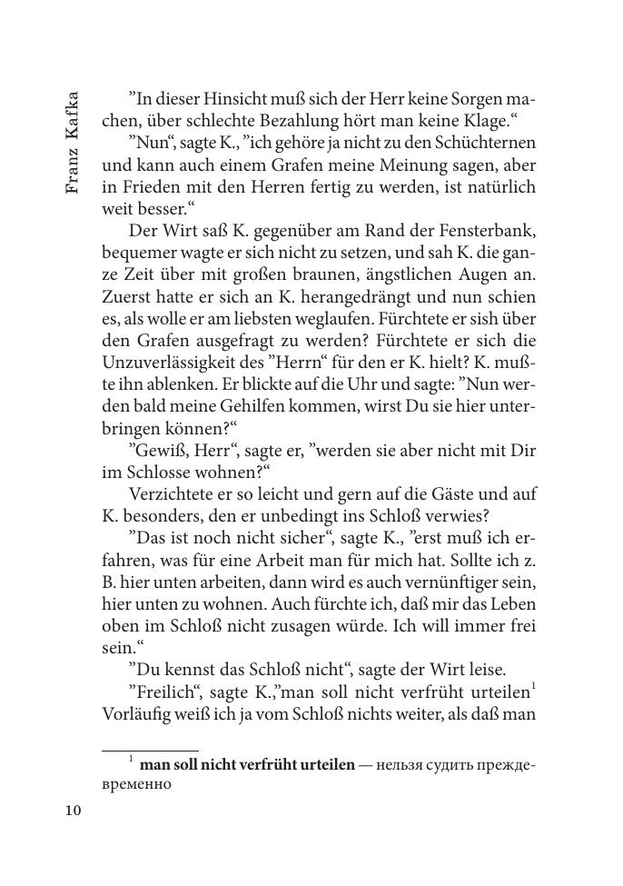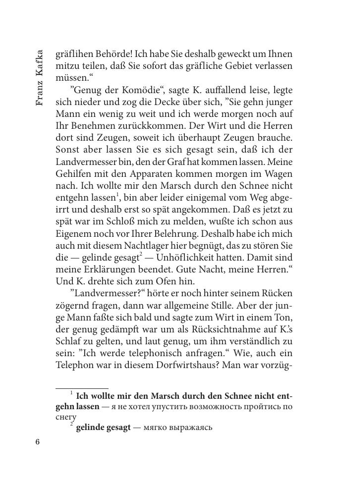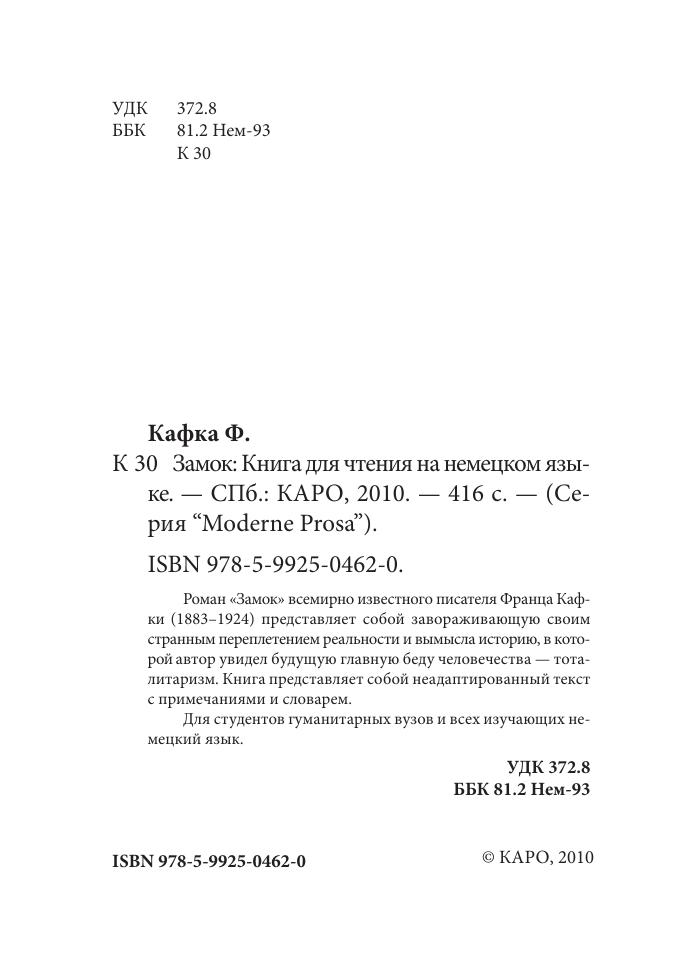 Роман «Замок» всемирно известного писателя Франца Кафки (1883–1924) представляет собой завораживающую своим странным переплетением реальности и вымысла историю, в которой автор увидел будущую главную беду человечества — тоталитаризм. Книга представляет собой неадаптированный текст с примечаниями и словарем. Для студентов гуманитарных вузов и всех изучающих немецкий язык.