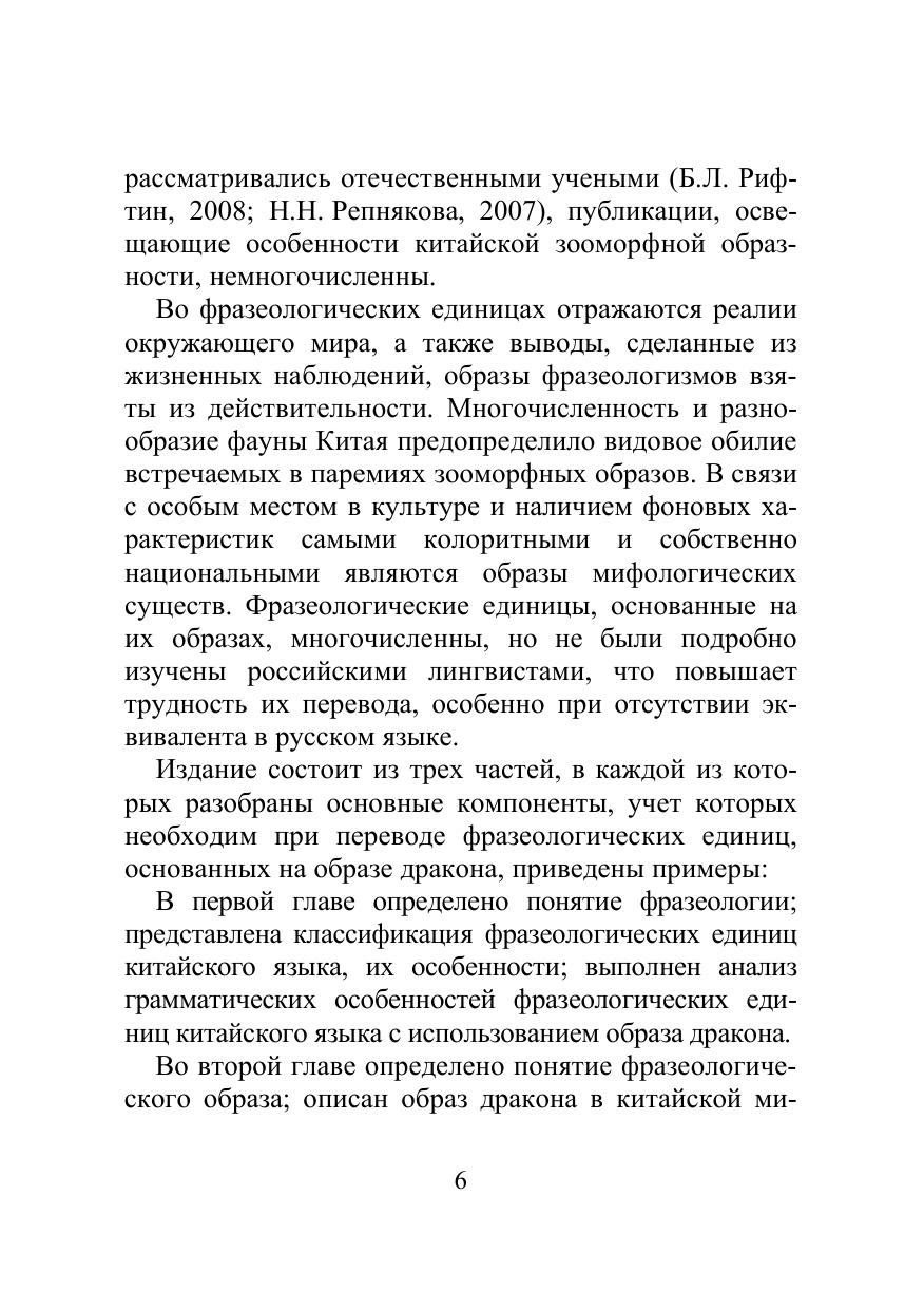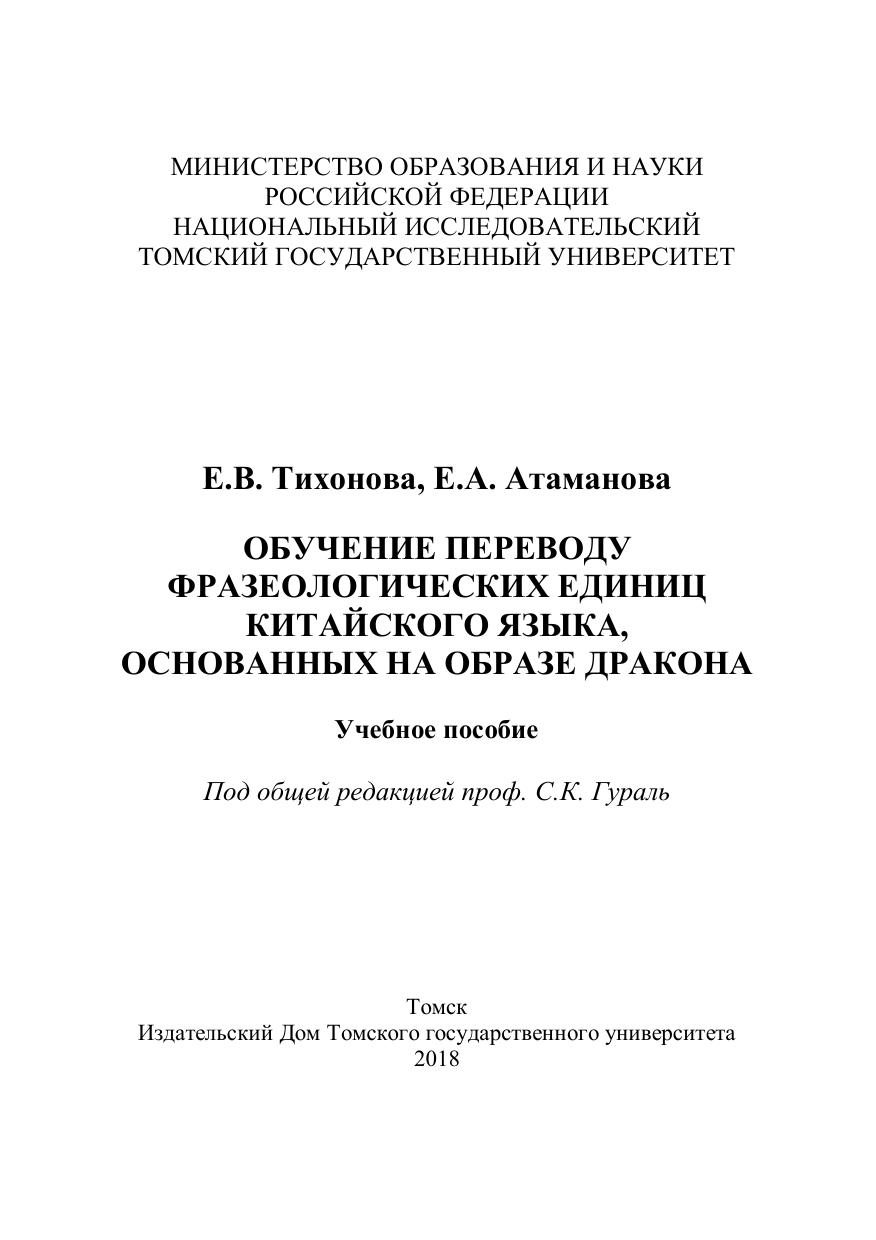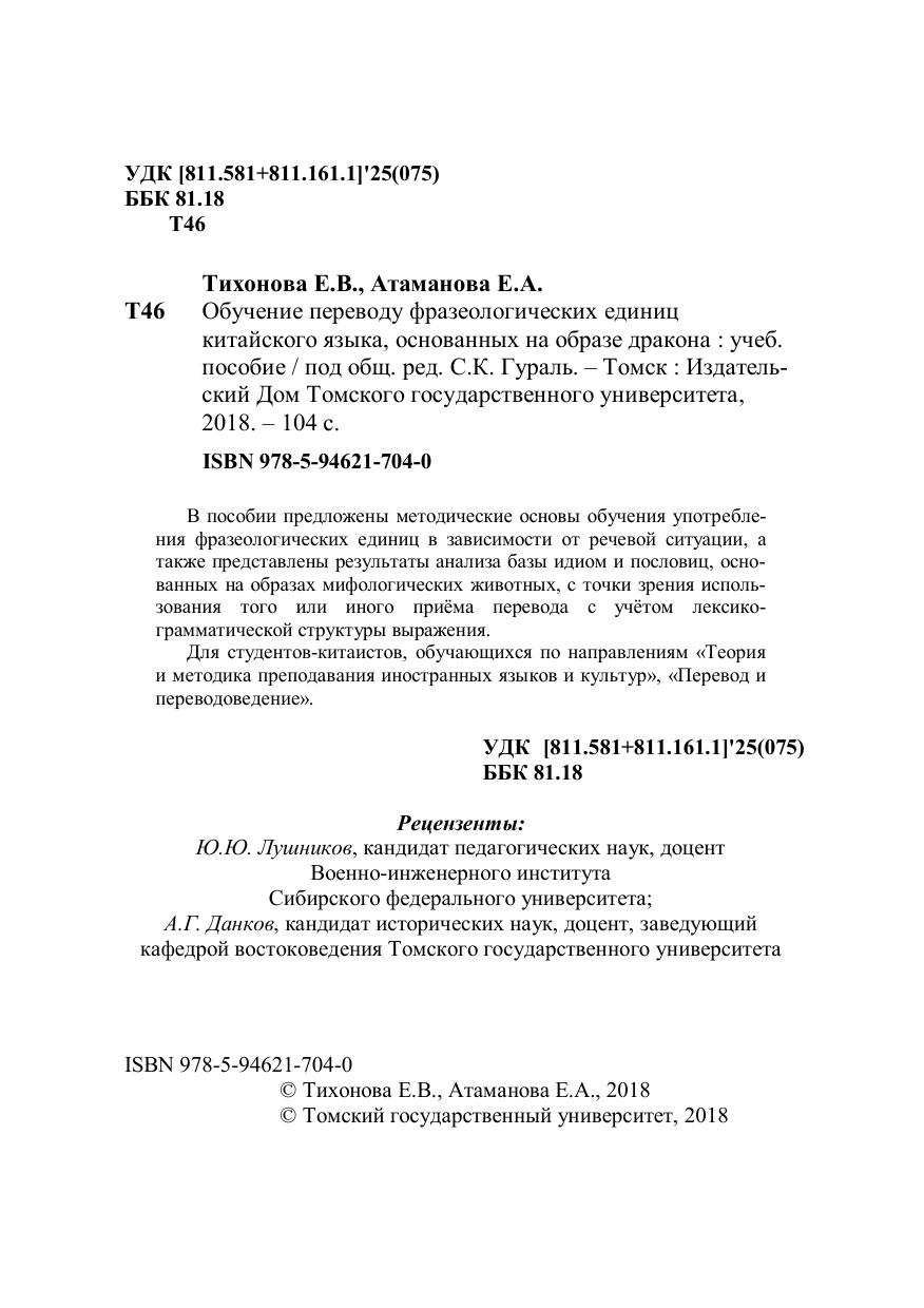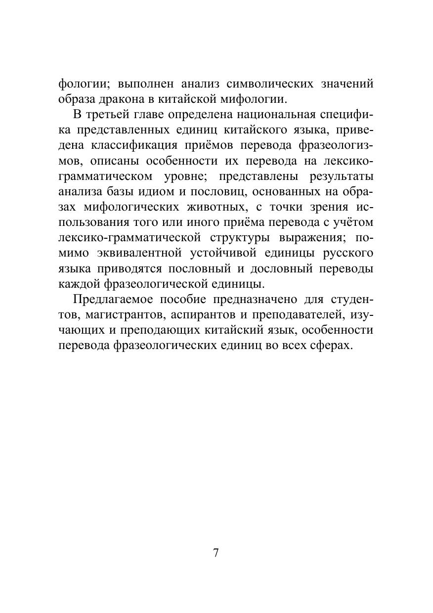В пособии предложены методические основы обучения употребления фразеологических единиц в зависимости от речевой ситуации, а также представлены результаты анализа базы идиом и пословиц, основанных на образах мифологических животных, с точки зрения использования того или иного приёма перевода с учётом лексикограмматической структуры выражения. Для студентов-китаистов, обучающихся по направлениям «Теория и методика преподавания иностранных языков и культур», «Перевод и переводоведение».