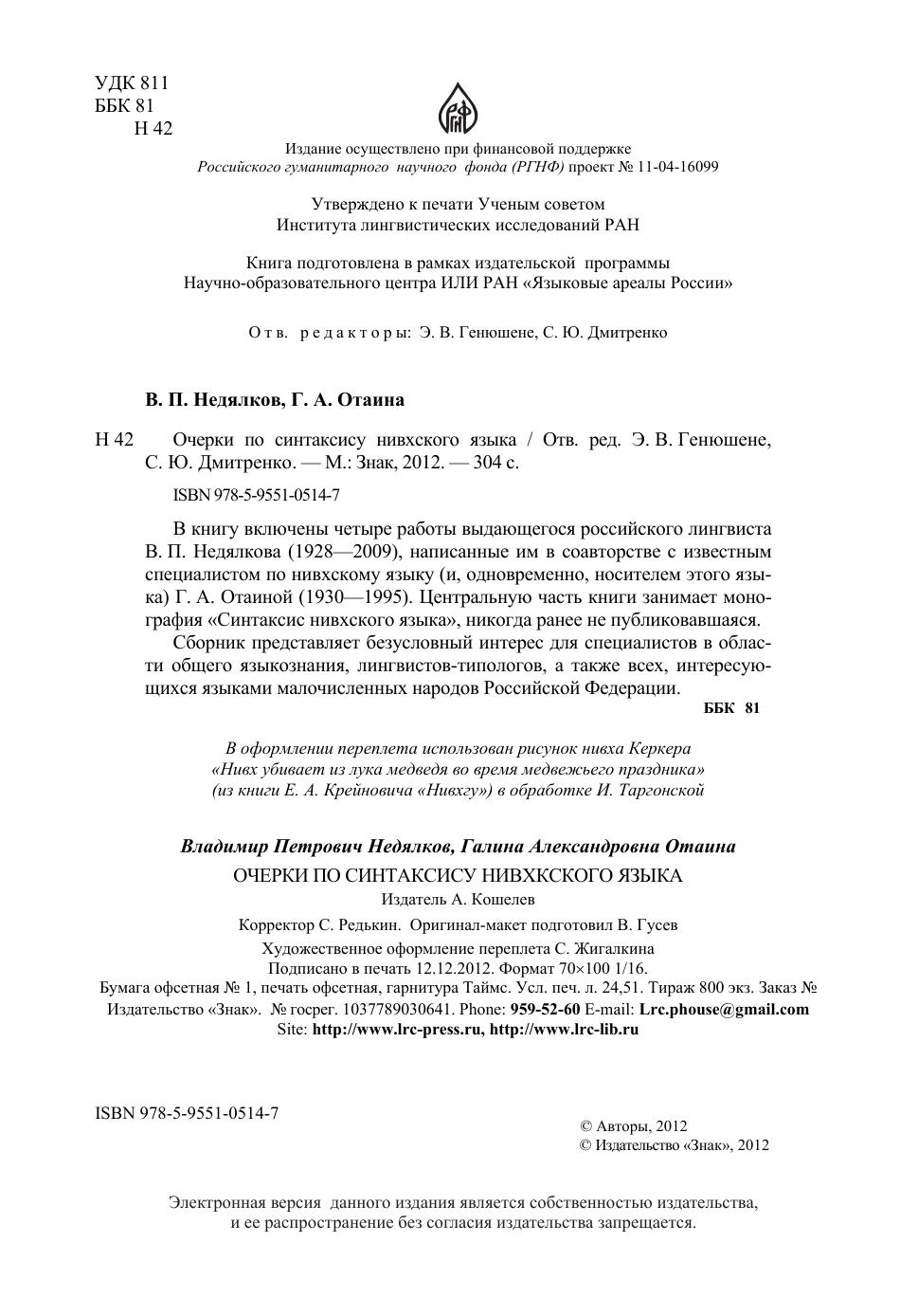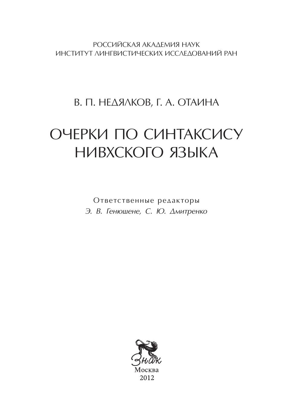 В книгу включены четыре работы выдающегося российского лингвиста В.П.Недялкова, написанные им в соавторстве с известным специалистом по нивхскому языку (и, одновременно, носителем этого языка) Г.А.Отаиной. Центральную часть книги занимает монография "Синтаксис нивхского языка", никогда ранее не публиковавшаяся. Сборник представляет безусловный интерес для специалистов в области общего языкознания, лингвистов-типологов, а также всех, интересующихся языками малочисленных народов Российской Федерации.