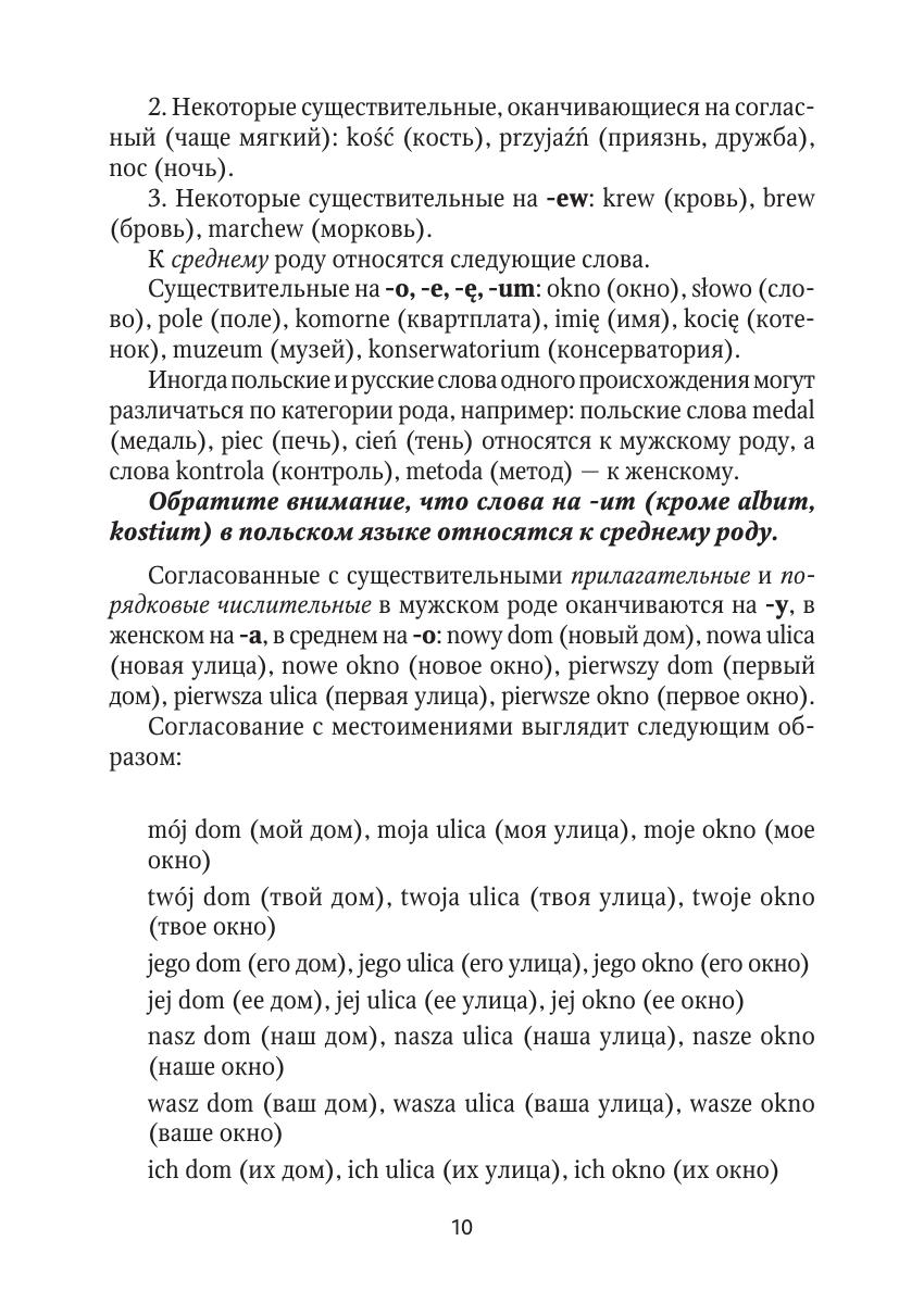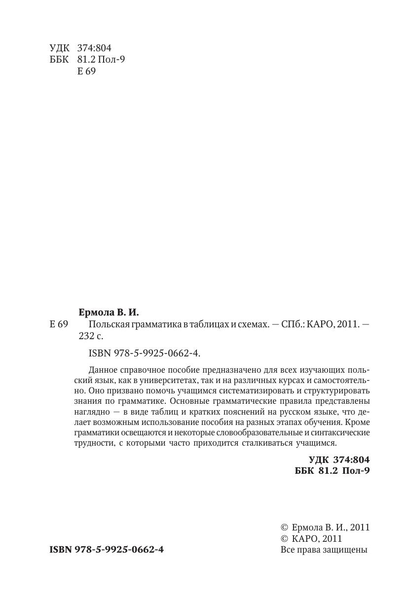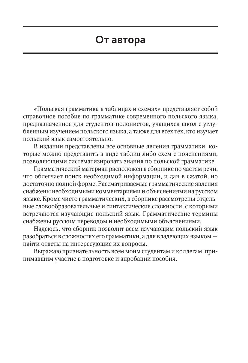 Данное справочное пособие предназначено для всех изучающих польский язык, как в университетах, так и на различных курсах и самостоятельно. Оно призвано помочь учащимся систематизировать и структурировать знания по грамматике. Основные грамматические правила представлены наглядно — в виде таблиц и кратких пояснений на русском языке, что делает возможным использование пособия на разных этапах обучения. Кроме грамматики освещаются и некоторые словообразовательные и синтаксические трудности, с которыми часто приходится сталкиваться учащимся.