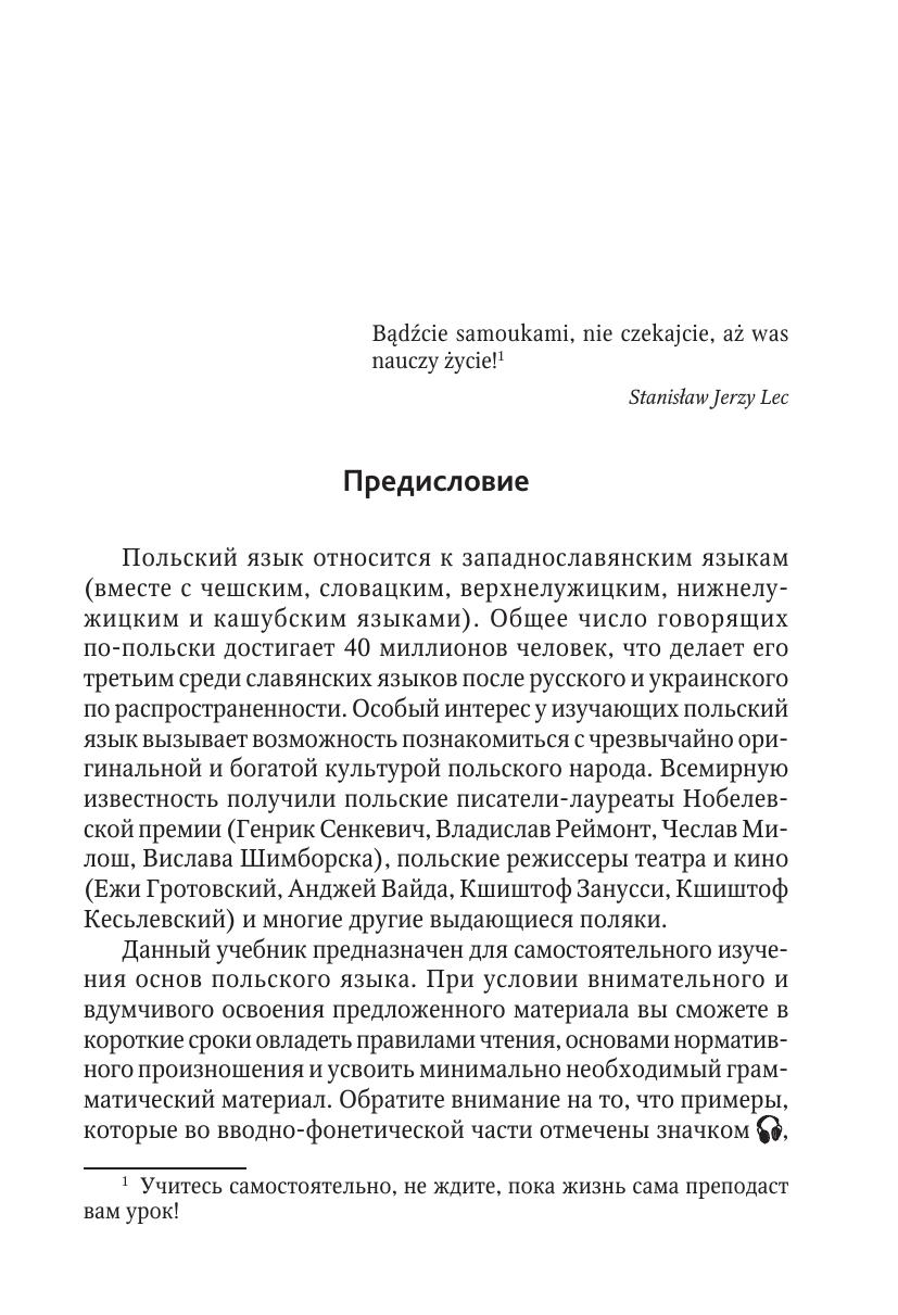 Учебное пособие предназначено для самостоятельного изучения основ польского языка. При условии внимательного и вдумчивого освоения предложенного материала можно в короткие сроки овладеть правилами чтения, основами нормативного произношения и усвоить минимально необходимый грамматический материал. Автор учебника сознательно старался избегать сложной лингвистической терминологии, грамматические правила сведены к минимуму, лексический запас ограничен кругом необходимых слов для общения на бытовом уровне. Все тексты записаны на компакт-диск, их читают носители языка, поэтому его прослушивание будет очень полезным для развития навыков аудирования и постановки произношения.