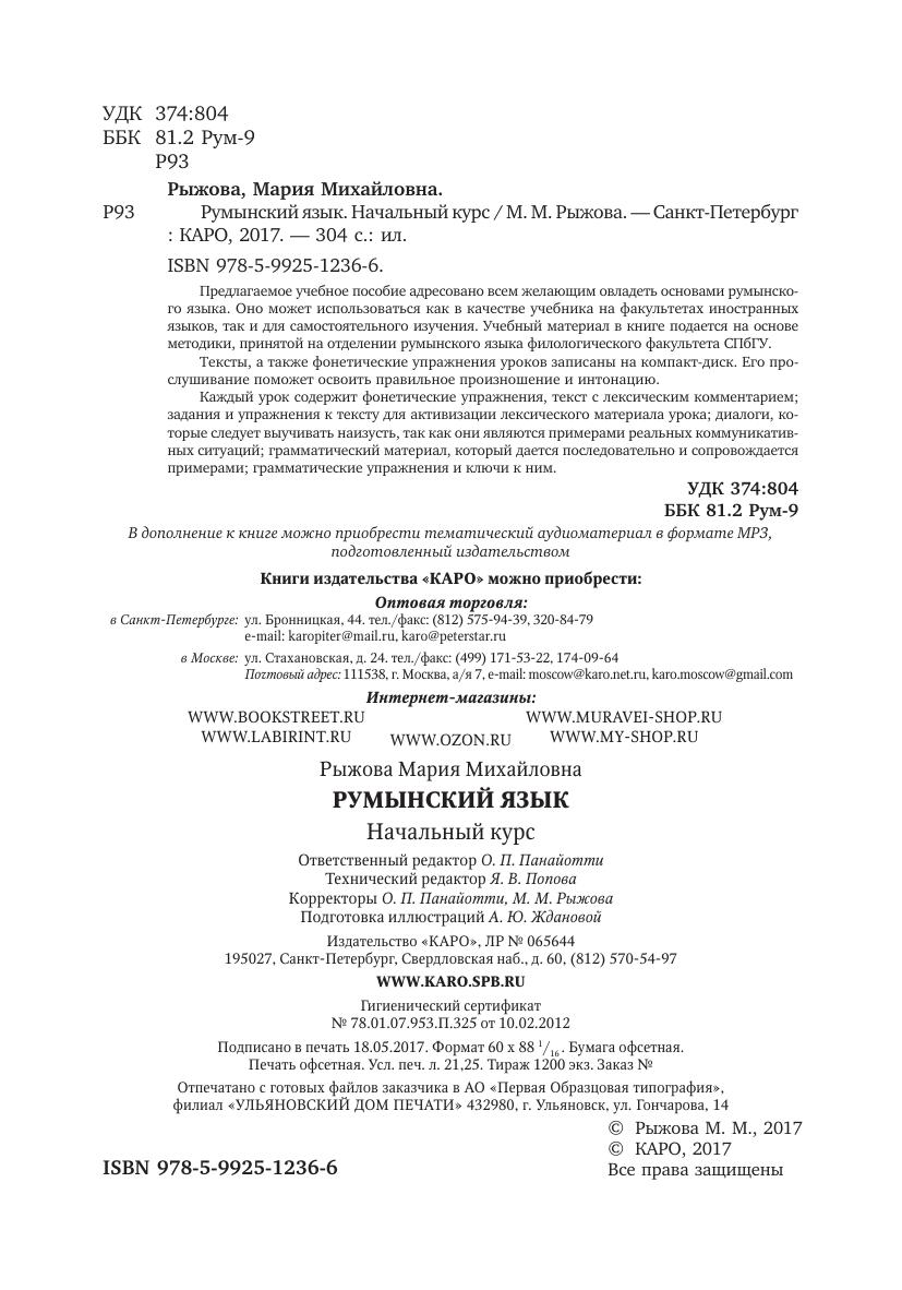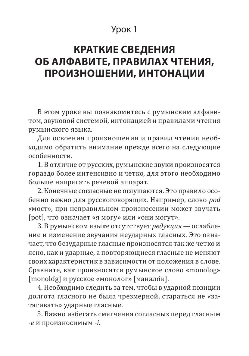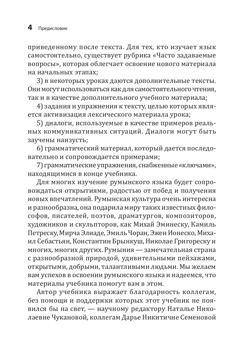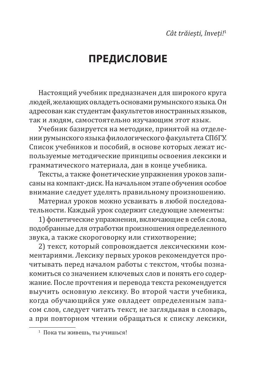 Предлагаемое учебное пособие адресовано всем желающим овладеть основами румынского языка. Оно может использоваться как в качестве учебника на факультетах иностранных языков, так и для самостоятельного изучения. Учебный материал в книге подается на основе методики, принятой на отделении румынского языка филологического факультета СПбГУ. Тексты, а также фонетические упражнения уроков записаны на компакт-диск. Его прослушивание поможет освоить правильное произношение и интонацию. Каждый урок содержит фонетические упражнения, текст с лексическим комментарием; задания и упражнения к тексту для активизации лексического материала урока; диалоги, которые следует выучивать наизусть, так как они являются примерами реальных коммуникативных ситуаций; грамматический материал, который дается последовательно и сопровождается примерами; грамматические упражнения и ключи к ним.