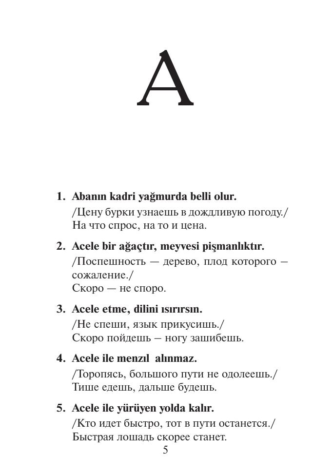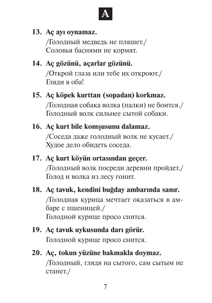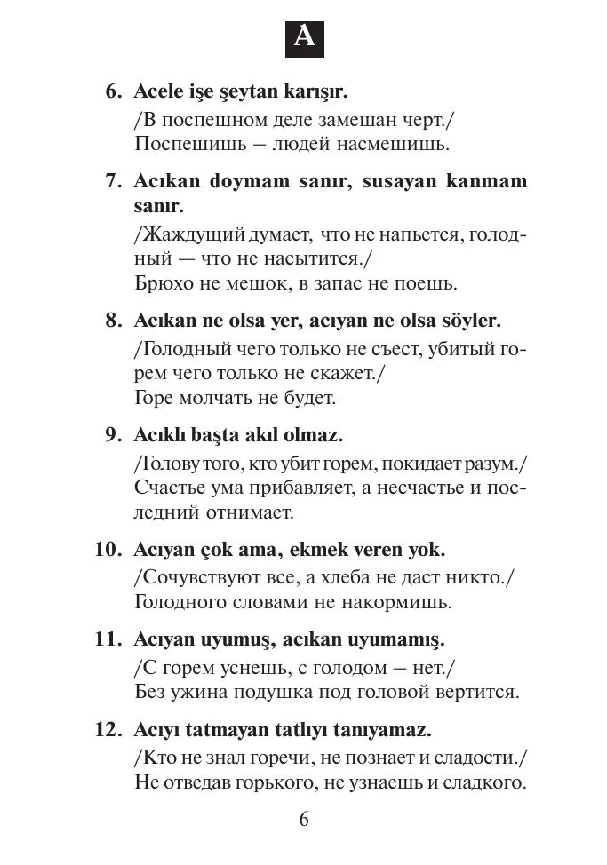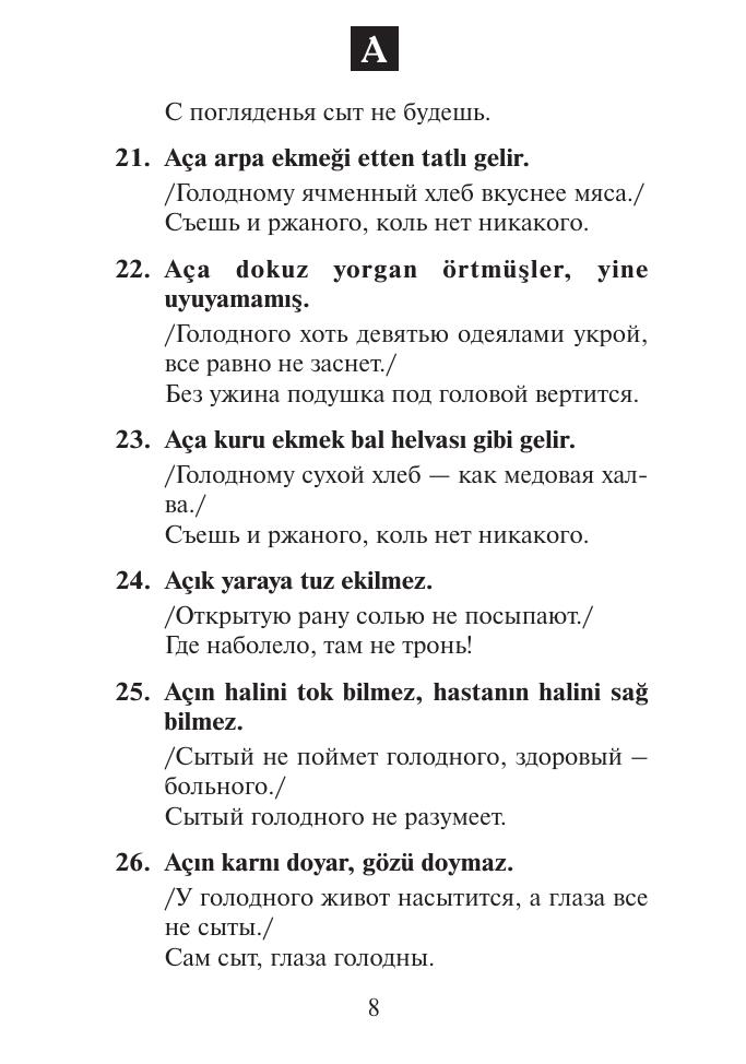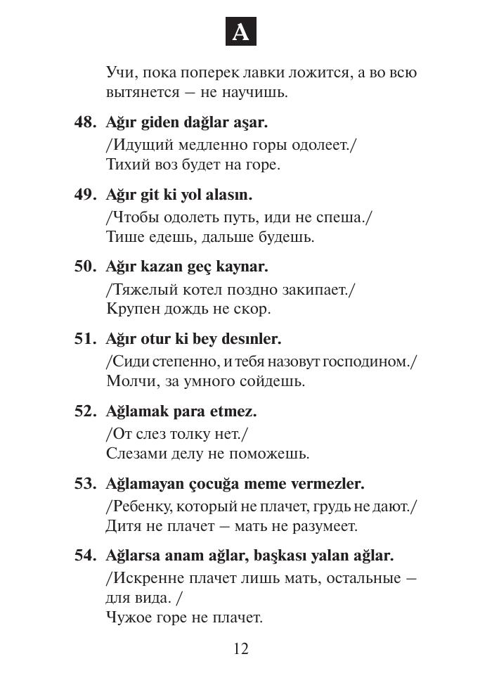 В данный сборник включены 900 турецких пословиц и их русские эквиваленты. Подобного рода книга впервые издается в России. Она предназначена для изучающих турецкий язык и всех, кто интересуется Турцией, в том числе деловых людей и туристов, посещающих эту страну. Сборник будет также полезен для турок, которые изучают русский язык или работают в России. Пословицы расположены в алфавитном порядке. Для каждой турецкой пословицы подобран один русский аналог. В основном, это близкие по смыслу русские пословицы, в отдельных случаях — поговорки и крылатые выражения. В круглые скобки заключены некоторые варианты компонентов турецких пословиц, в ломаные скобки - их факультативные компоненты. Курсивом даются пояснения автора.