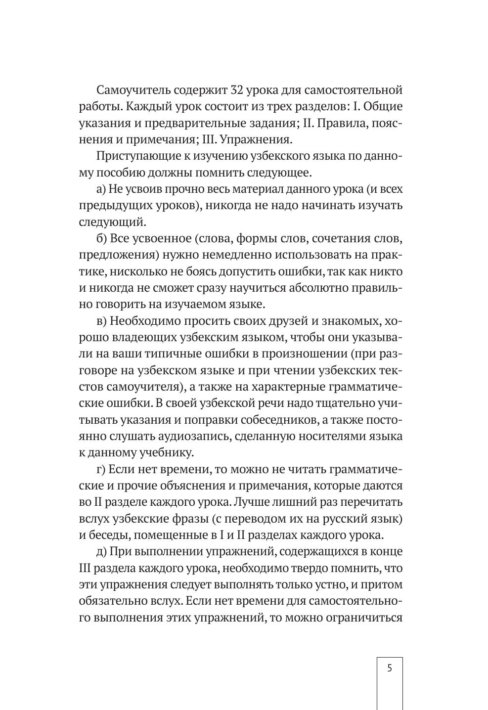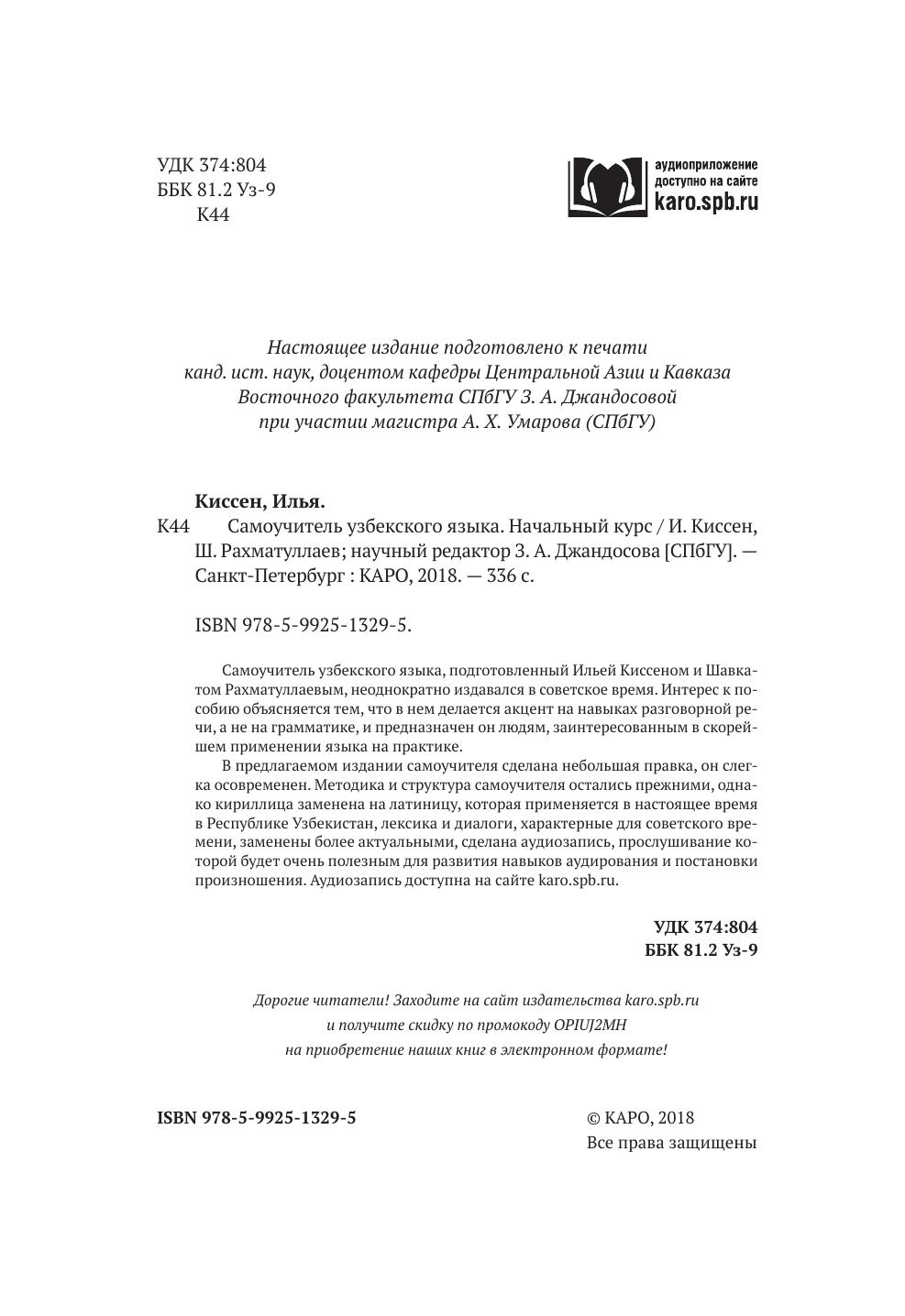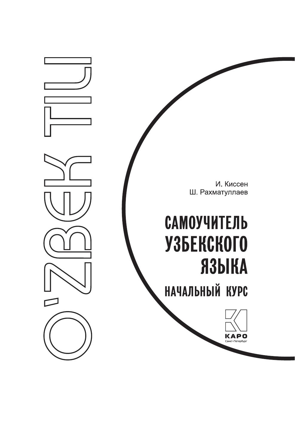 Самоучитель узбекского языка, подготовленный Ильей Киссеном и Шавкатом Рахматуллаевым, неоднократно издавался в советское время. Интерес к пособию объясняется тем, что в нем делается акцент на навыках разговорной речи, а не на грамматике, и предназначен он людям, заинтересованным в скорейшем применении языка на практике. В предлагаемом издании самоучителя сделана небольшая правка, он слегка осовременен. Методика и структура самоучителя остались прежними, однако кириллица заменена на латиницу, которая применяется в настоящее время в Республике Узбекистан, лексика и диалоги, характерные для советского времени, заменены более актуальными.