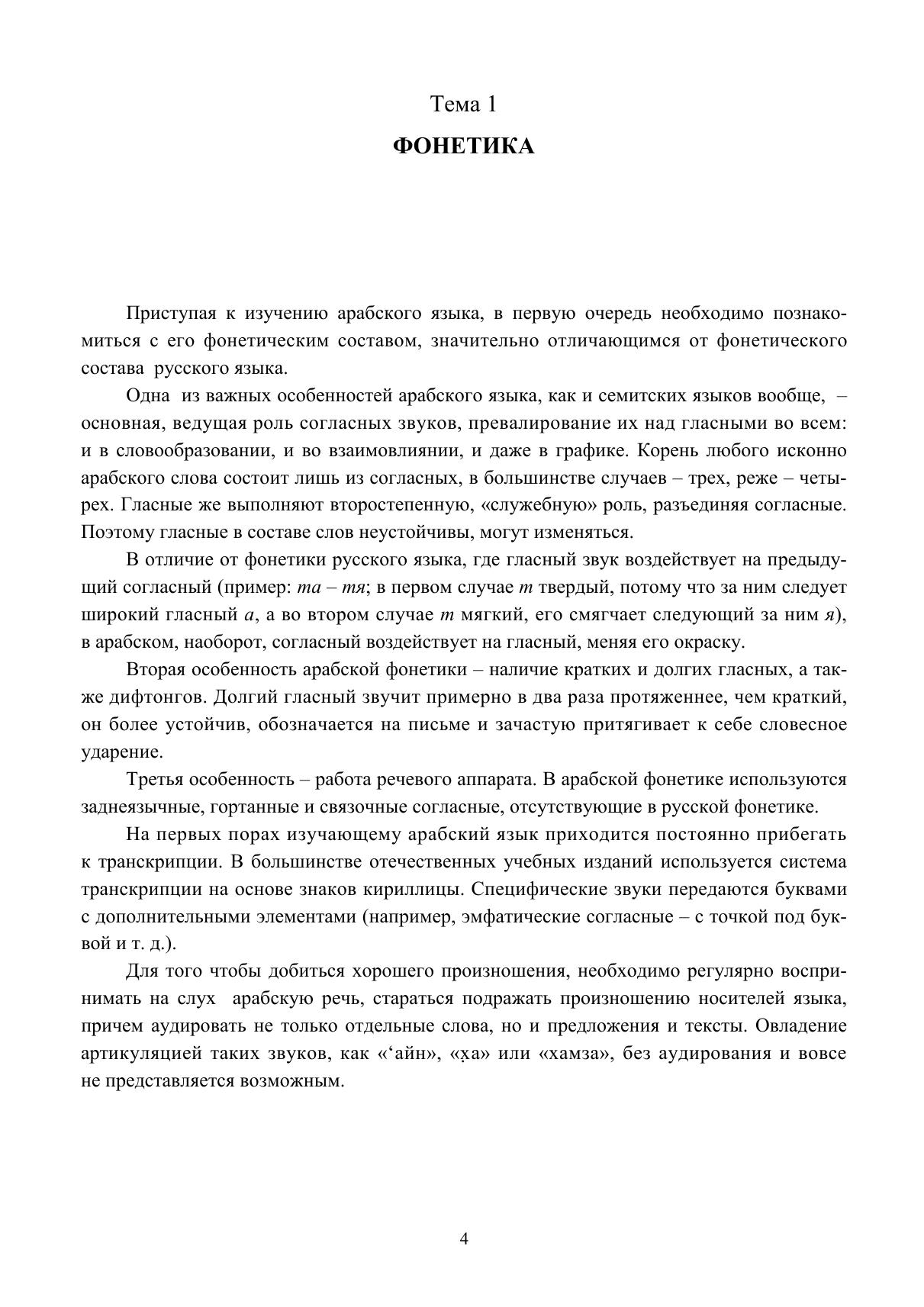 Учебное пособие содержит краткие сведения о фонетике, графике, морфологии, словообразовании и синтаксисе литературного арабского языка. Изложение теоретического материала сопровождается примерами как из обыденной речи, так и из коранических аятов. Предназначено для студентов бакалавриата и магистратуры, обучающихся по направлению подготовки 41.03.03, 41.04.03 «Востоковедение и африканистика».