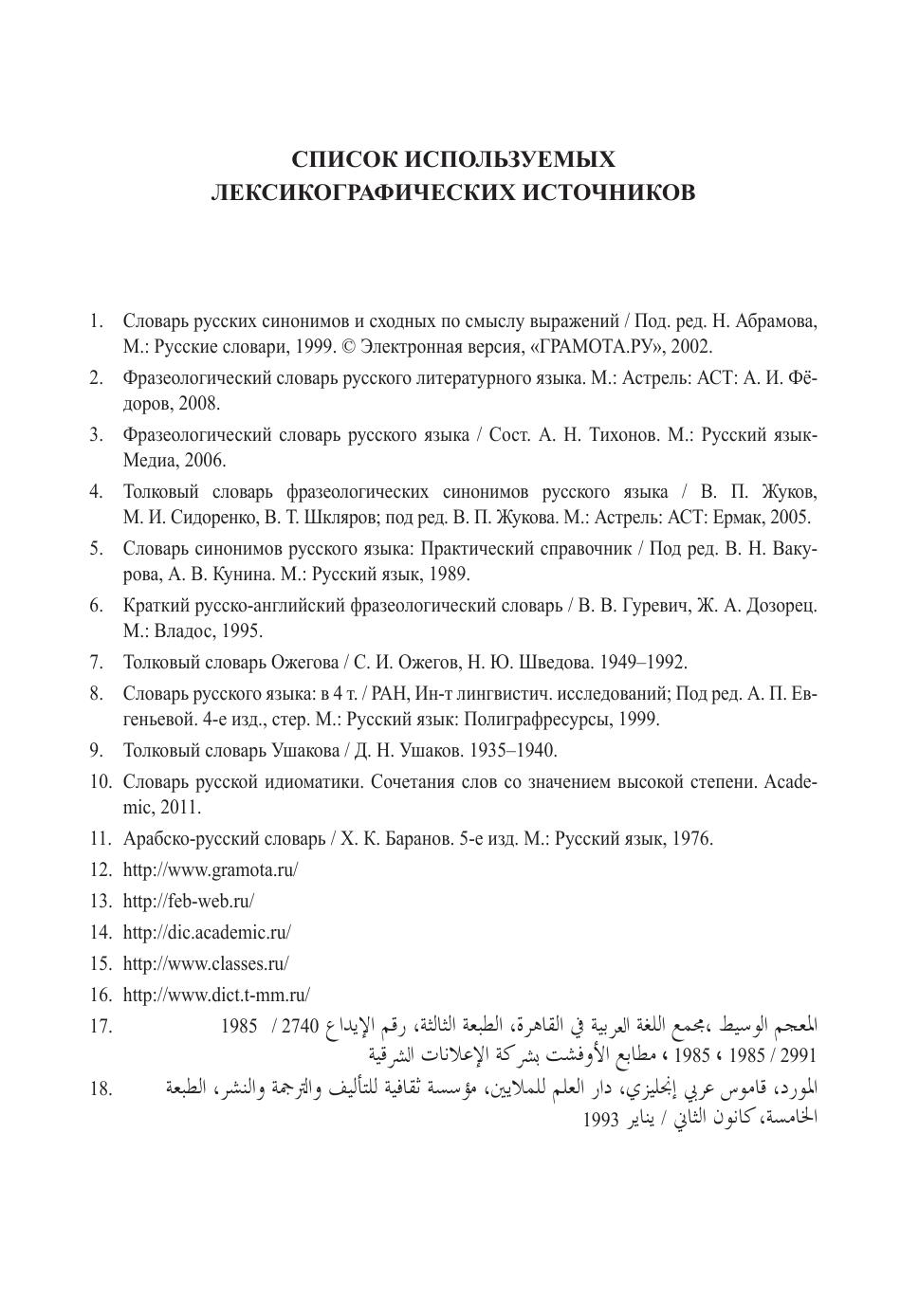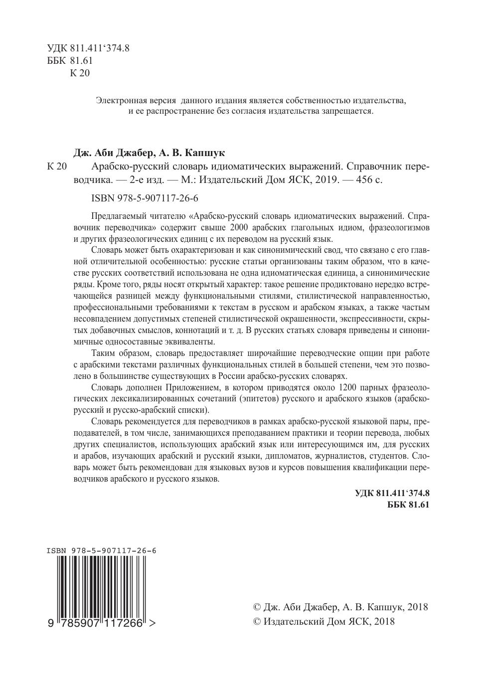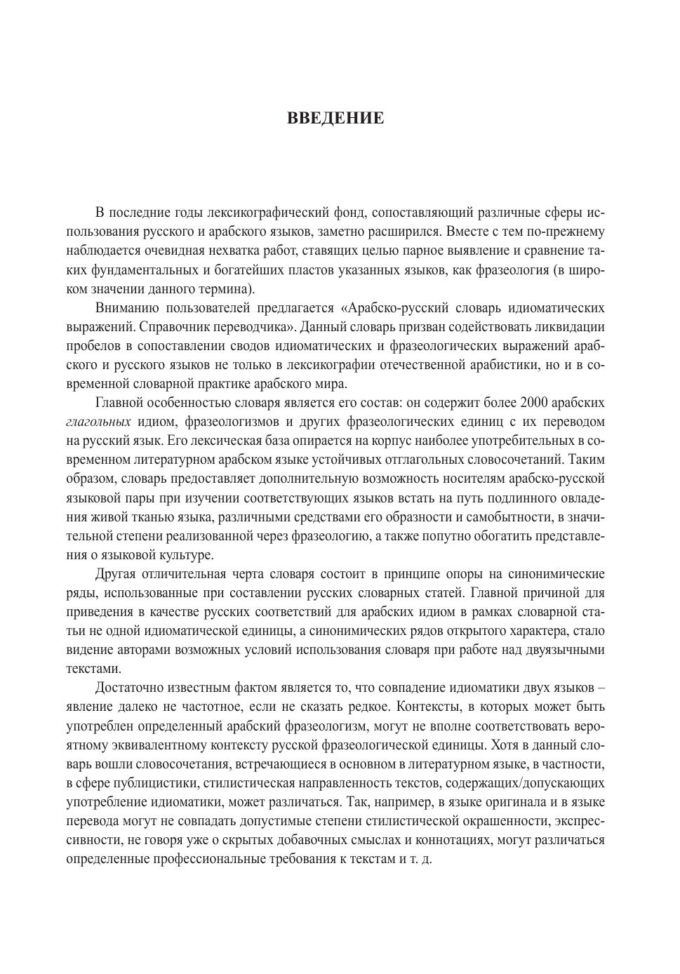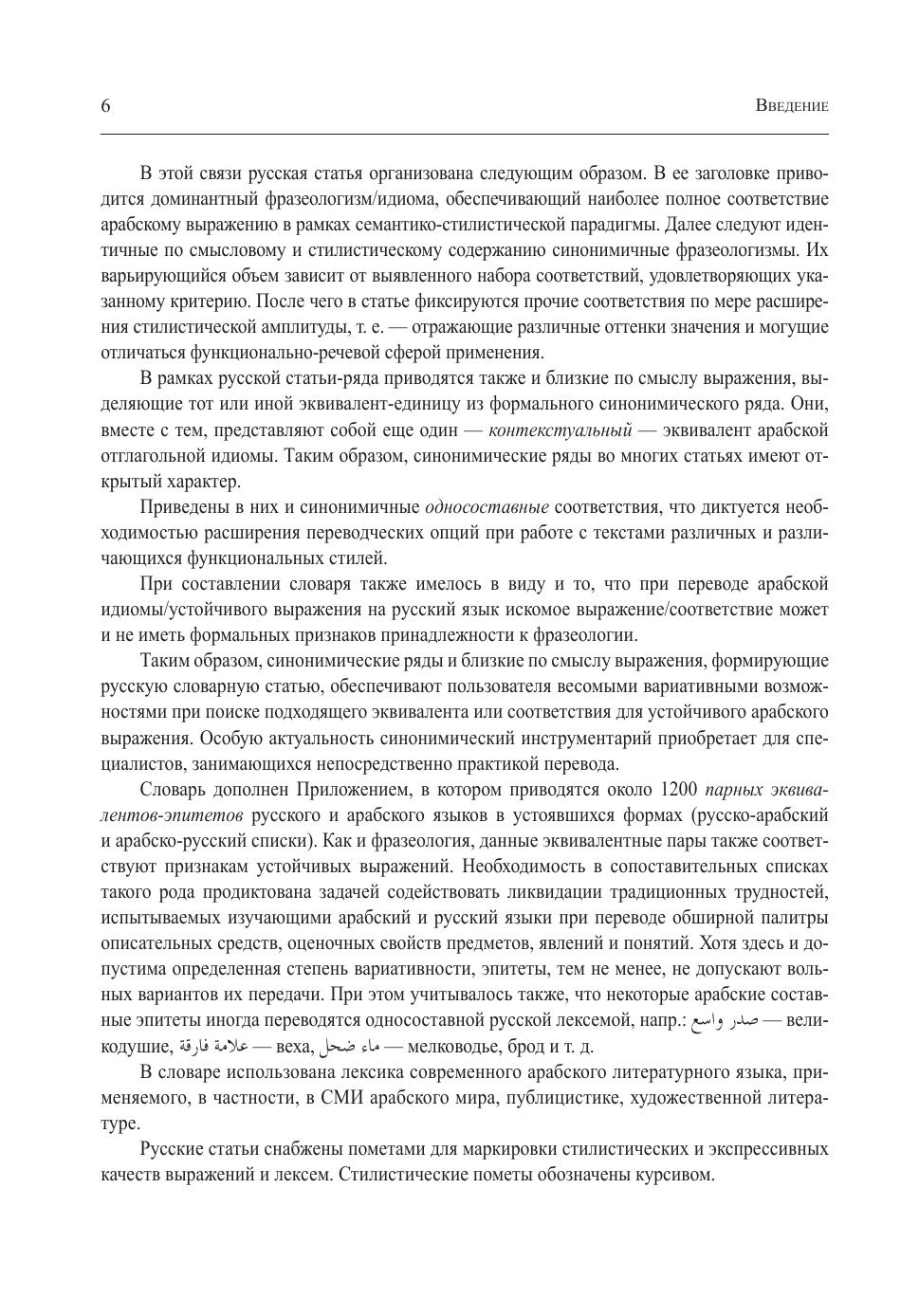 Предлагаемый читателю «Арабско-русский словарь идиоматических выражений. Справочник переводчика» содержит свыше 2000 арабских глагольных идиом, фразеологизмов и других фразеологических единиц с их переводом на русский язык. Словарь может быть охарактеризован и как синонимический свод, что связано с его главной отличительной особенностью: русские статьи организованы таким образом, что в качестве русских соответствий использована не одна идиоматическая единица, а синонимические ряды. Кроме того, ряды носят открытый характер: такое решение продиктовано нередко встречающейся разницей между функциональными стилями, стилистической направленностью, профессиональными требованиями к текстам в русском и арабском языках, а также частым несовпадением допустимых степеней стилистической окрашенности, экспрессивности, скрытых добавочных смыслов, коннотаций и т. д. В русских статьях словаря приведены и синонимичные односоставные эквиваленты. Таким образом, словарь предоставляет широчайшие переводческие опции при работе с арабскими текстами различных функциональных стилей в большей степени, чем это позволено в большинстве существующих в России арабско-русских словарях. Словарь дополнен Приложением, в котором приводятся около 1200 парных фразеологических лексикализированных сочетаний (эпитетов) русского и арабского языков (арабско-русский и русско-арабский списки). Словарь рекомендуется для переводчиков в рамках арабско-русской языковой пары, преподавателей, в том числе, занимающихся преподаванием практики и теории перевода, любых других специалистов, использующих арабский язык или интересующимся им, для русских и арабов, изучающих арабский и русский языки, дипломатов, журналистов, студентов. Словарь может быть рекомендован для языковых вузов и курсов повышения квалификации переводчиков арабского и русского языков.