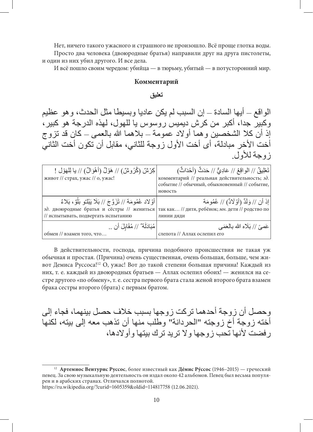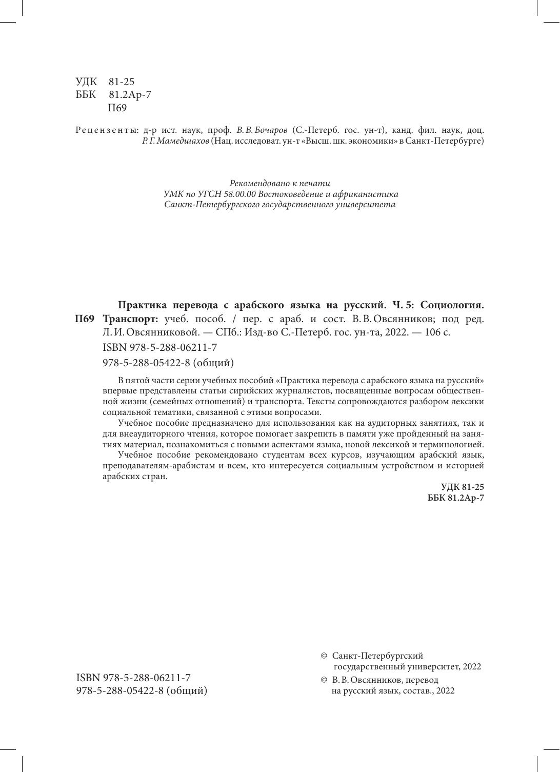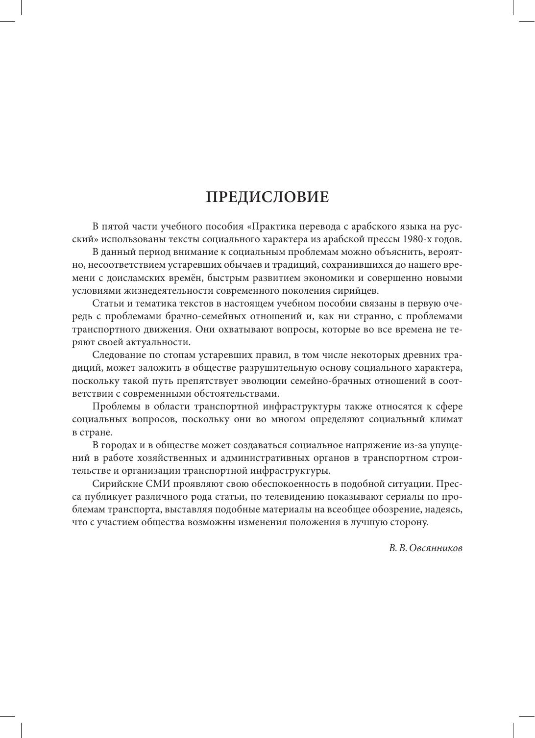 В пятой части серии учебных пособий "Практика перевода с арабского языка на русский" впервые представлены статьи сирийских журналистов, посвященные вопросам общественной жизни (семейных отношений) и транспорта. Тексты сопровождаются разбором лексики социальной тематики, связанной с этими вопросами. Учебное пособие предназначено для использования как на аудиторных занятиях, так и для внеаудиторного чтения, которое помогает закрепить в памяти уже пройденный на занятиях материал, познакомиться с новыми аспектами языка, новой лексикой и терминологией.