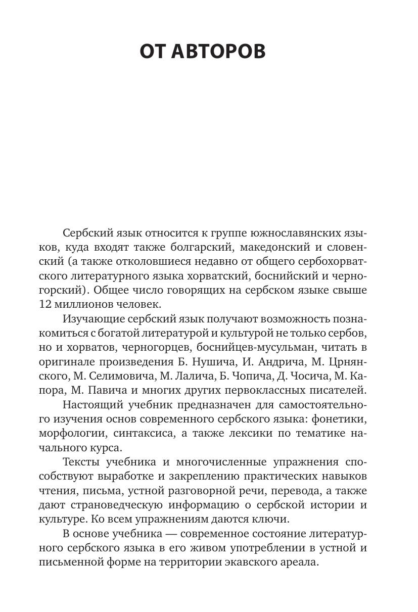 Предлагаемое учебное пособие предназначено для самостоятельного изучения основ современного сербского языка: фонетики, морфологии, синтаксиса, а также лексики по тематике начального курса. Тексты учебника и многочисленные упражнения способствуют выработке и закреплению практических навыков чтения, письма, устной разговорной речи, перевода, а также дают страноведческую информацию о сербской истории и культуре. Ко всем упражнениям даются ключи. В основе учебника — современное состояние литературного сербского языка в его живом употреблении в устной и письменной форме на территории экавского ареала. Учебник состоит из 20 уроков. Все тексты, диалоги стихи и песни, а также примеры произношения записаны на компакт-диск. Внимательно слушая и повторяя за дикторами, учащиеся за короткое время смогут овладеть основами произношения и усвоить необходимый грамматический и лексический материал.