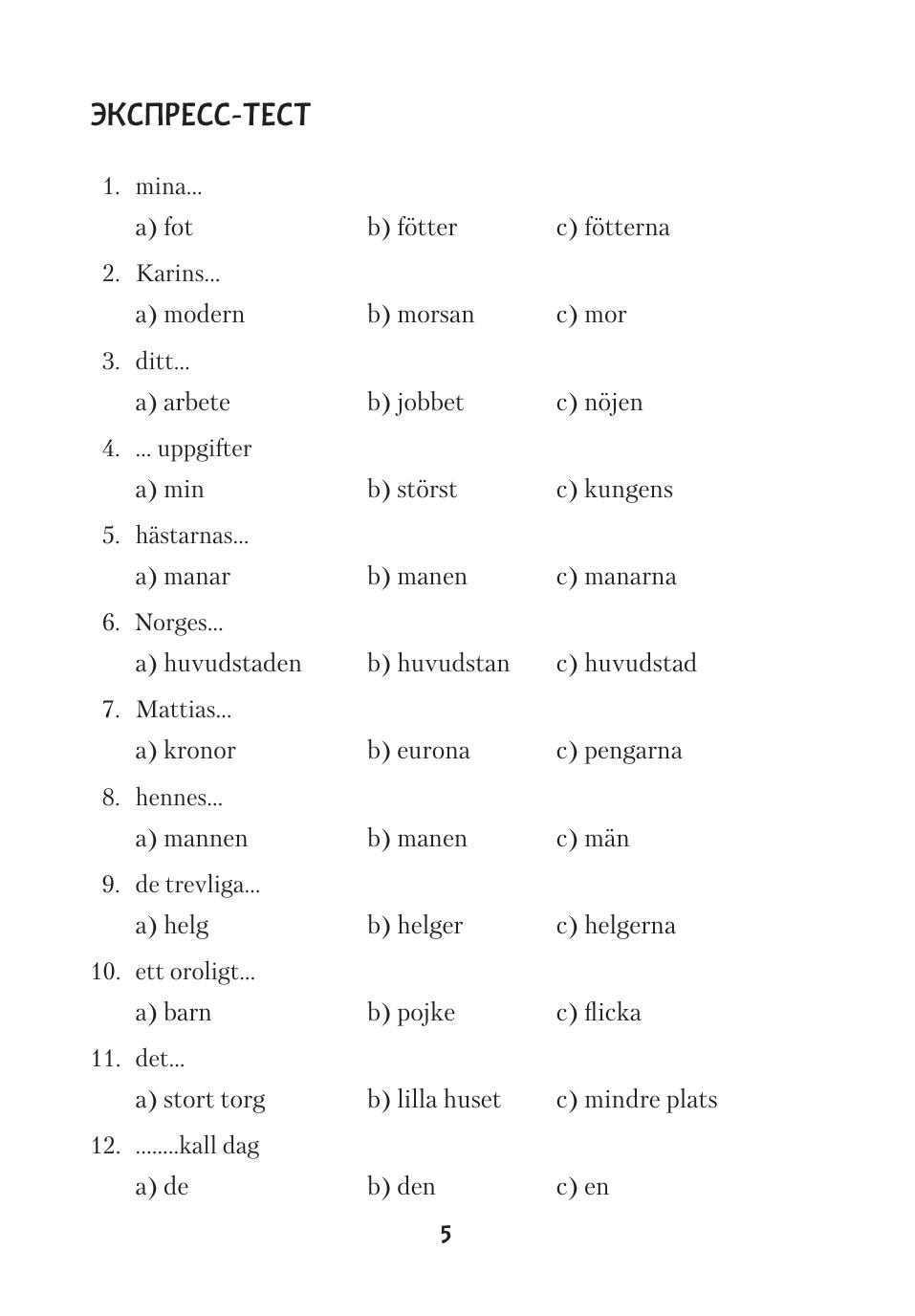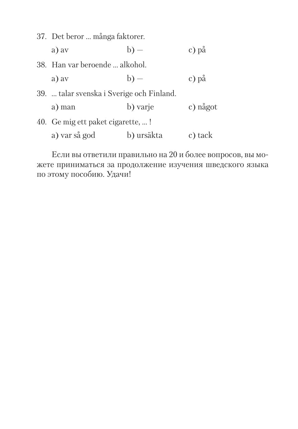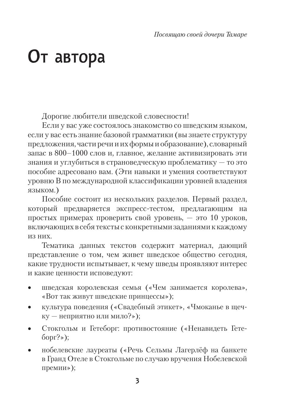 Предлагаемое учебное пособие адресовано тем, кто уже знает основы шведской грамматики и имеет словарный запас в 800–1000 слов. Пособие состоит из трех разделов. В первом и третьем разделах приводится большое количество оригинальных текстов на актуальные темы, насыщенных современной лексикой. Упражнения разнообразны по форме и содержанию и помогают не только закрепить грамматические навыки, но и обогатить словарный запас и расширить представления учащихся о современной жизни Швеции. Второй раздел пособия посвящен аудированию, все тексты этого раздела записаны на диск.