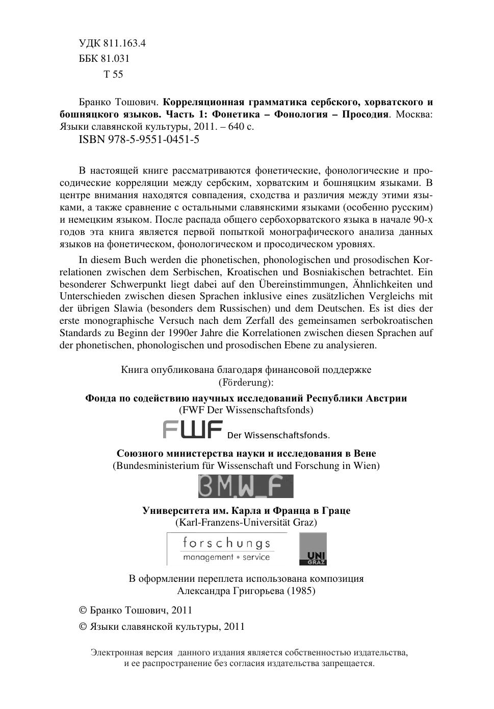 В настоящей книге рассматриваются фонетические, фонологические и просодические корреляции между сербским, хорватским и бошняцким языками. В центре внимания находятся совпадения, сходства и различия между этими языками, а также сравнение с остальными славянскими языками (особенно русским) и немецким языком. После распада общего сербохорватского языка в начале 90-х годов эта книга является первой попыткой монографического анализа данных языков на фонетическом, фонологическом и просодическом уровнях.