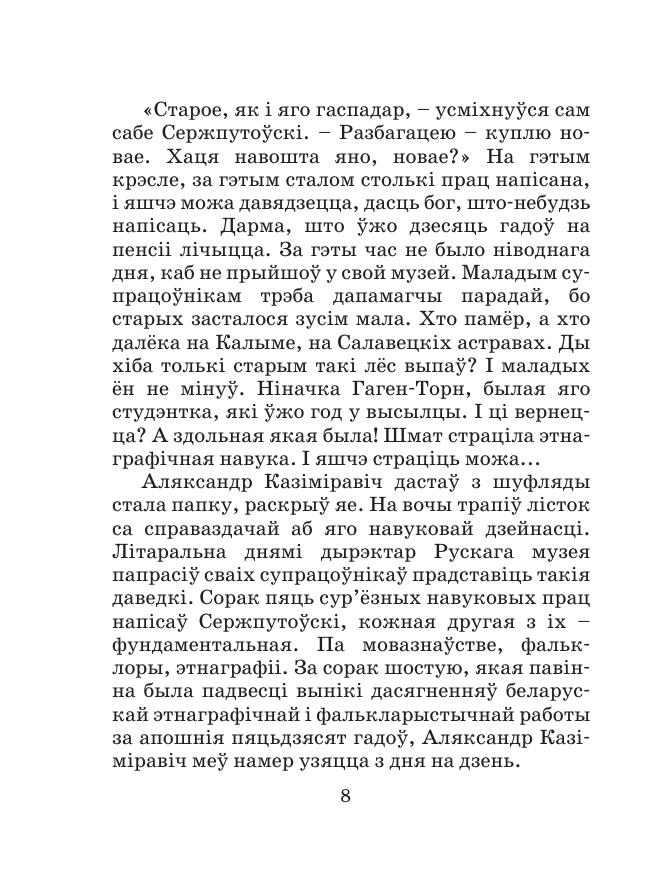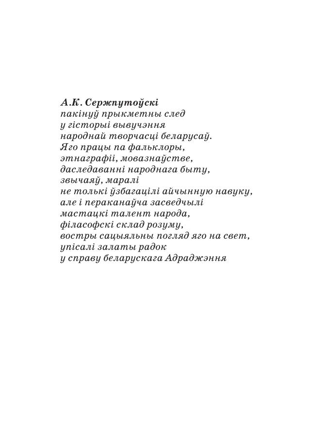 Прысвечана жыццю, творчай і грамадскай дзейнасці выдатнага беларускага фалькларыста, этнографа, мовазнаўцы, публіцыста А.К. Серж пу тоўскага (1864–1940). У ёй даецца грунтоўны аналіз лепшых узораў запісаў казачнага, песеннага, парэміяграфічнага эпасу беларусаў-палешукоў, расказваецца пра ахоўнікаў шматвяковых народных традыцый і абрадаў на Беларускім Палессі, пра ўплыў, які аказала і аказвае беларуская народная творчасць на развіццё славянскай фалькларыстыкі. Для фалькларыстаў, этнографаў, выкладчыкаў і студэнтаў ВНУ, настаўнікаў і вучняў агульнаадукацыйных школ, работнікаў асветы, культуры, літаратуры і мастацтва.