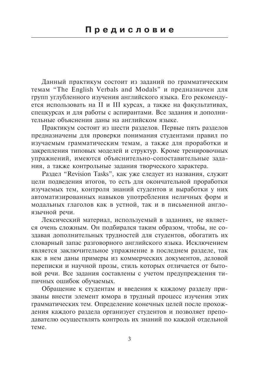 Практикум состоит из заданий для проработки, систематизации и контроля усвоения неличных форм и модальных глаголов в английском языке. Цель практикума — максимально приблизить теоретическое изучение этих тем к практическому владению данными языковыми явлениями. В заданиях представлено большое количество типичных моделей и структур, характерных как для устного общения, так и для письменной англоязычной речи. Задания в основном составлены на бытовой лексике.