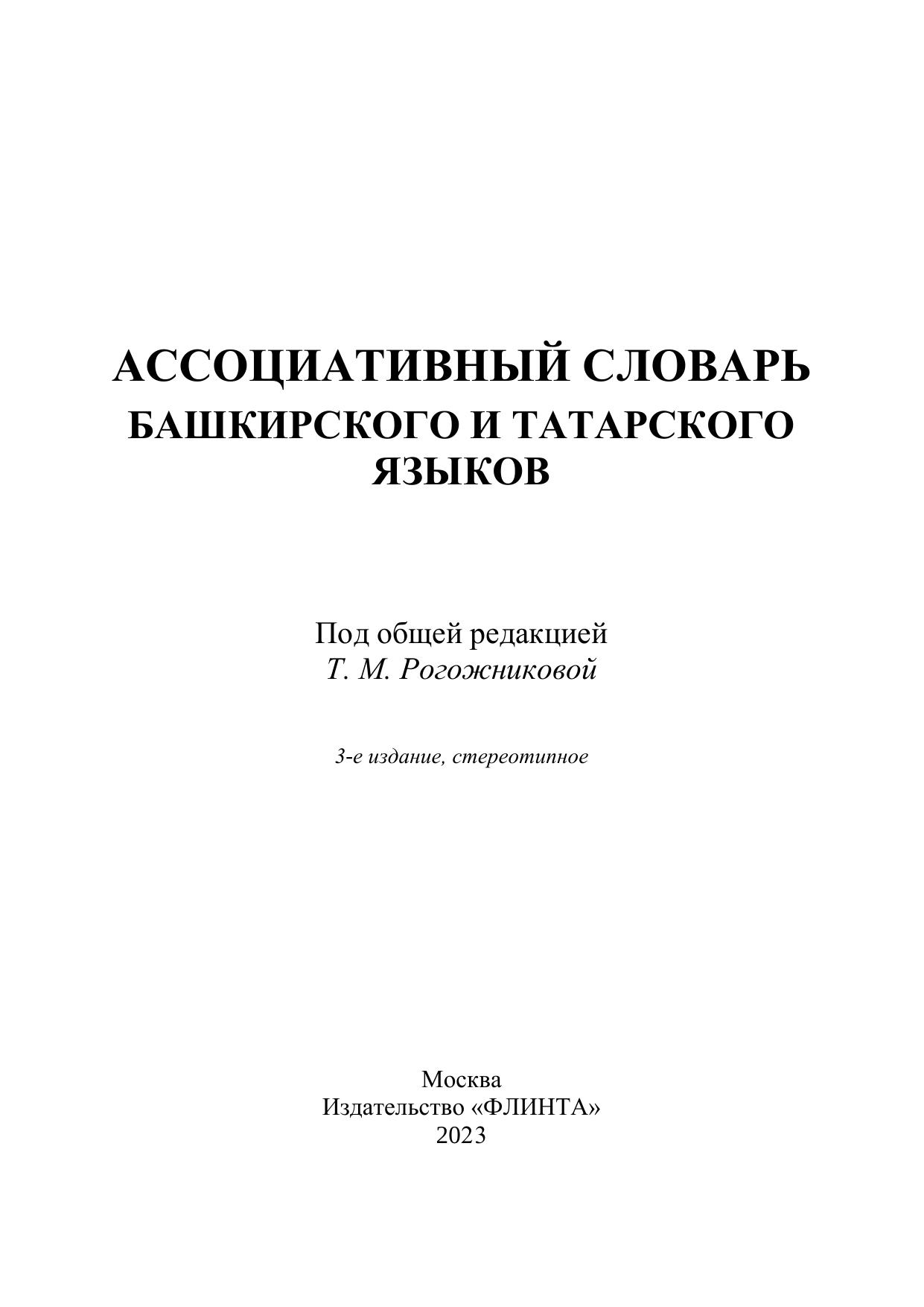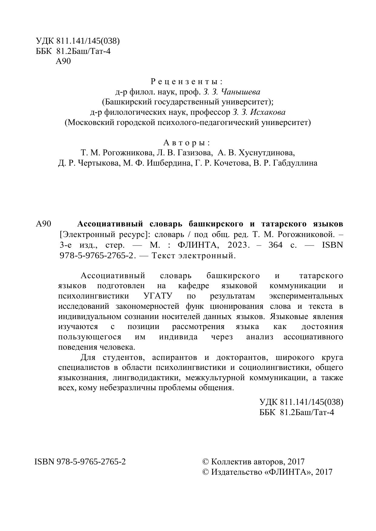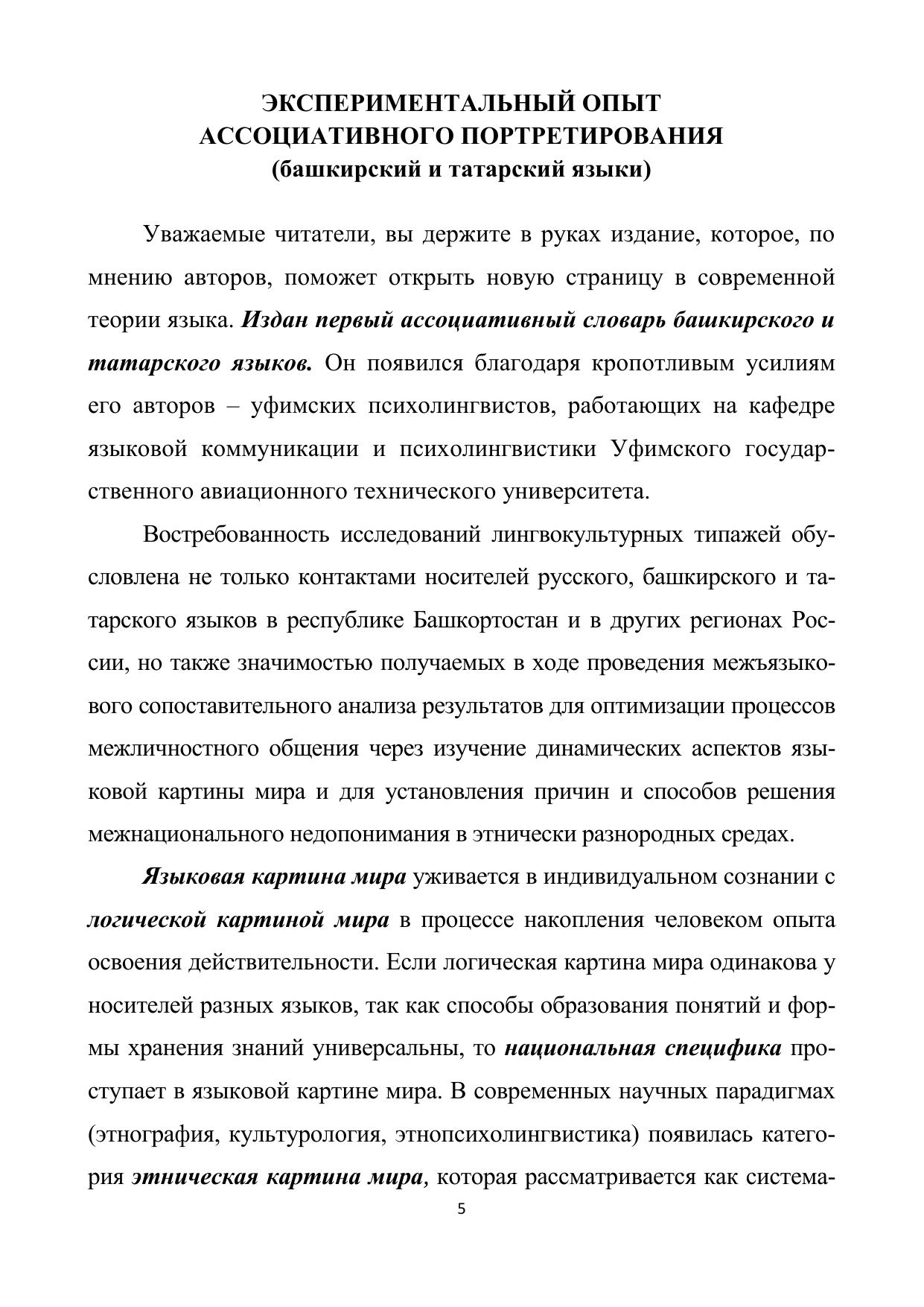 Ассоциативный словарь башкирского и татарского языков подготовлен на кафедре языковой коммуникации и психолингвистики УГАТУ по результатам экспериментальных исследований закономерностей функ ционирования слова и текста в индивидуальном сознании носителей данных языков. Языковые явления изучаются с позиции рассмотрения языка как достояния пользующегося им индивида через анализ ассоциативного поведения человека.
