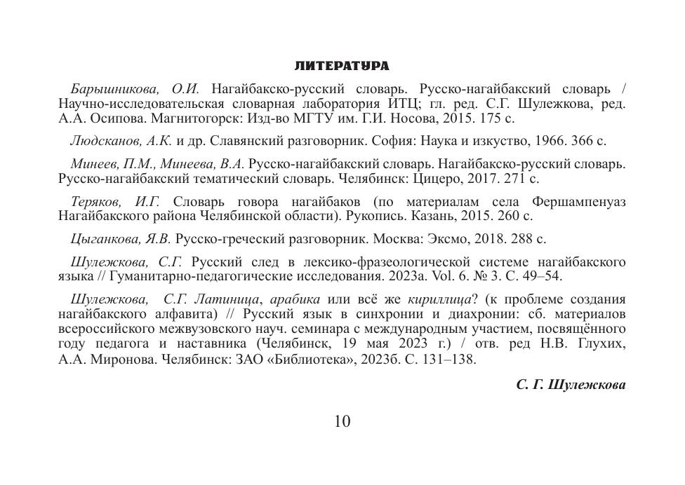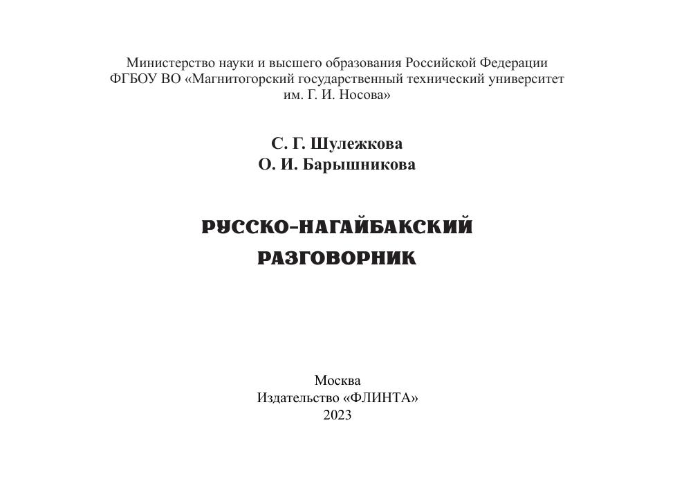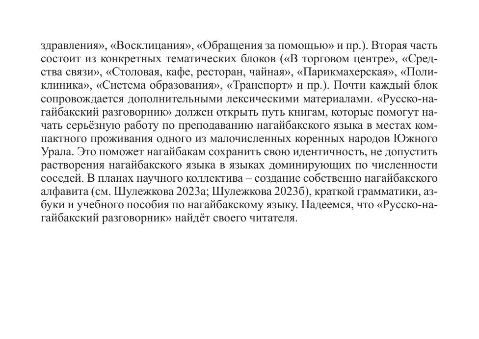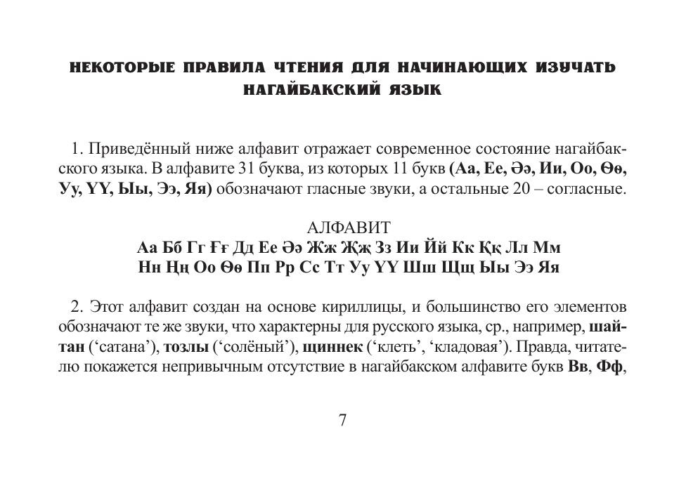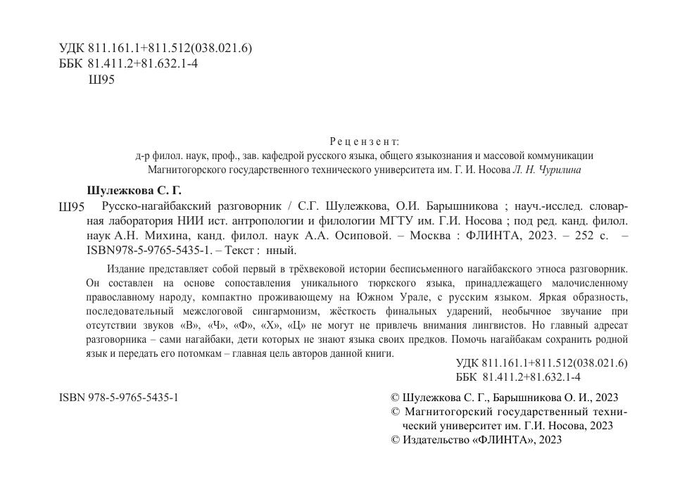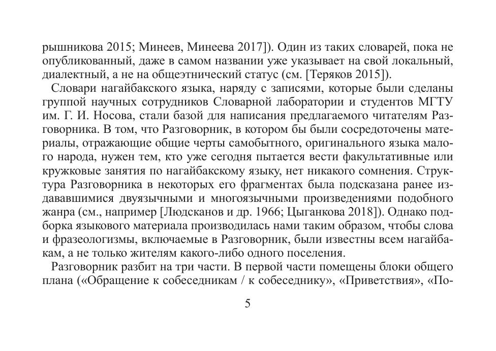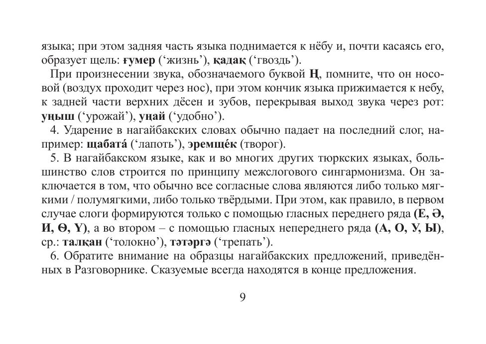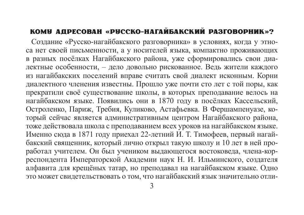 Издание представляет собой первый в трёхвековой истории бесписьменного нагайбакского этноса разговорник. Он составлен на основе сопоставления уникального тюркского языка, принадлежащего малочисленному православному народу, компактно проживающему на Южном Урале, с русским языком. Яркая образность, последовательный межслоговой сингармонизм, жёсткость финальных ударений, необычное звучание при отсутствии звуков «В», «Ч», «Ф», «Х», «Ц» не могут не привлечь внимания лингвистов. Но главный адресат разговорника – сами нагайбаки, дети которых не знают языка своих предков. Помочь нагайбакам сохранить родной язык и передать его потомкам – главная цель авторов данной книги.