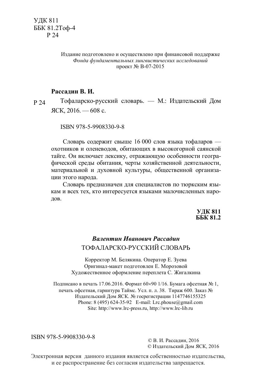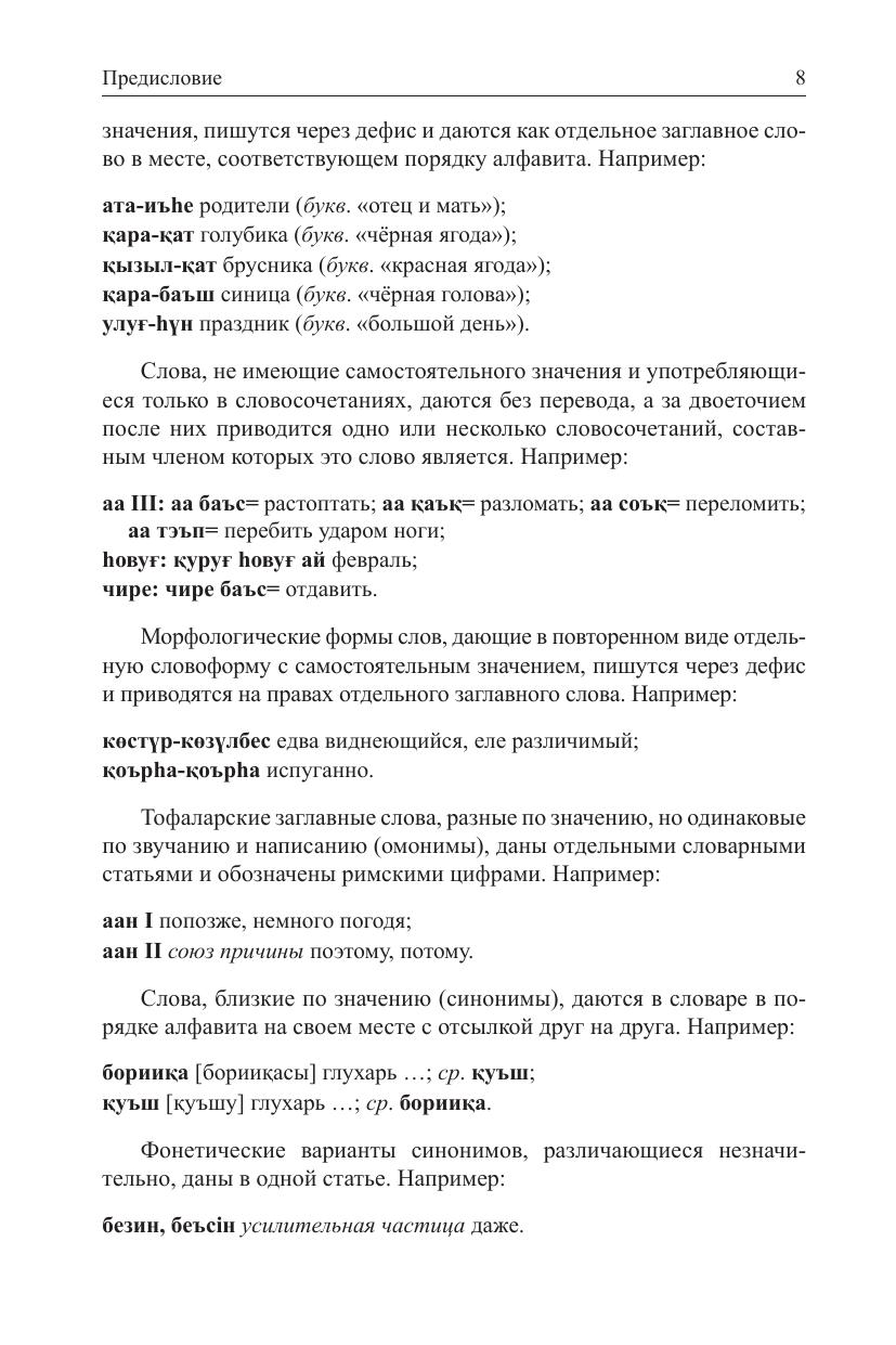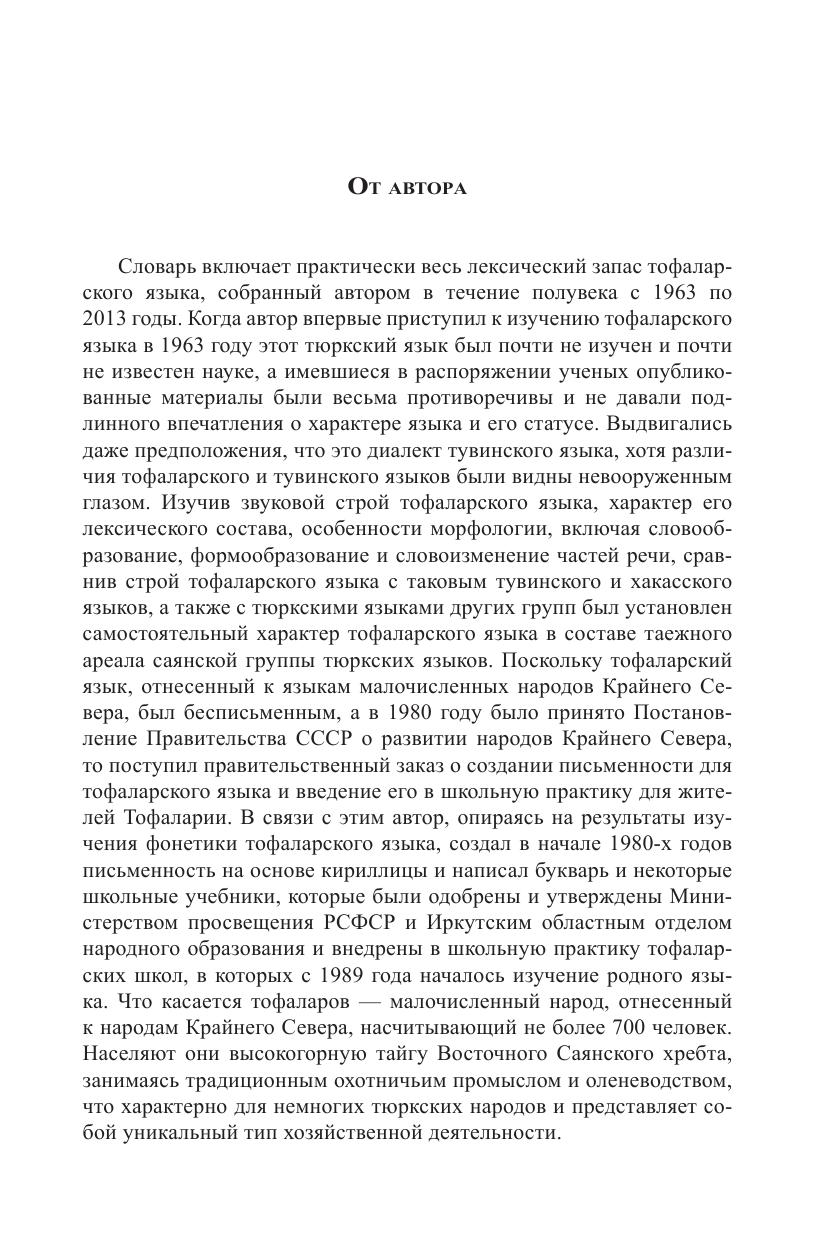 Словарь содержит свыше 16 000 слов языка тофаларов — охотников и оленеводов, обитающих в высокогорной саянской тайге. Он включает лексику, отражающую особенности географической среды обитания, черты хозяйственной деятельности, материальной и духовной культуры, общественной организации этого народа. Словарь предназначен для специалистов по тюркским языкам и всех тех, кто интересуется языками малочисленных народов.