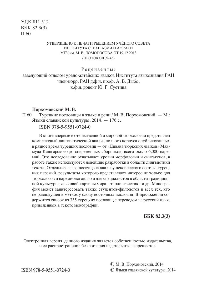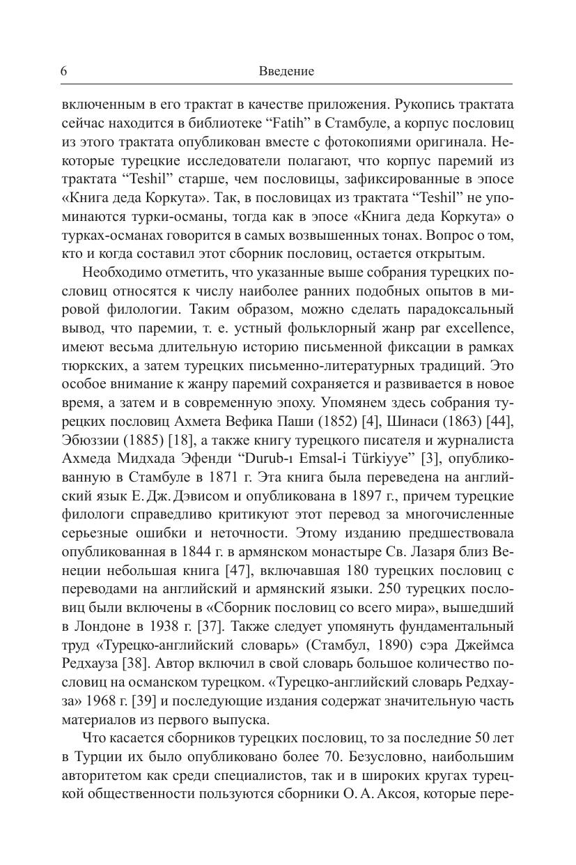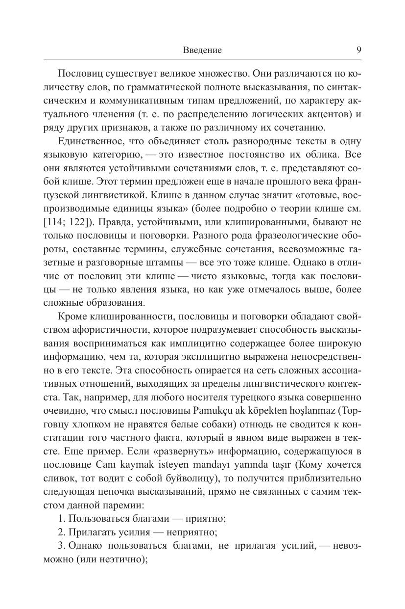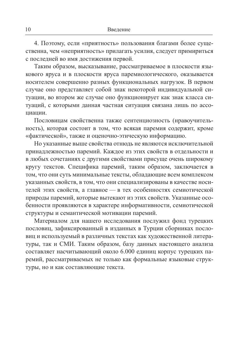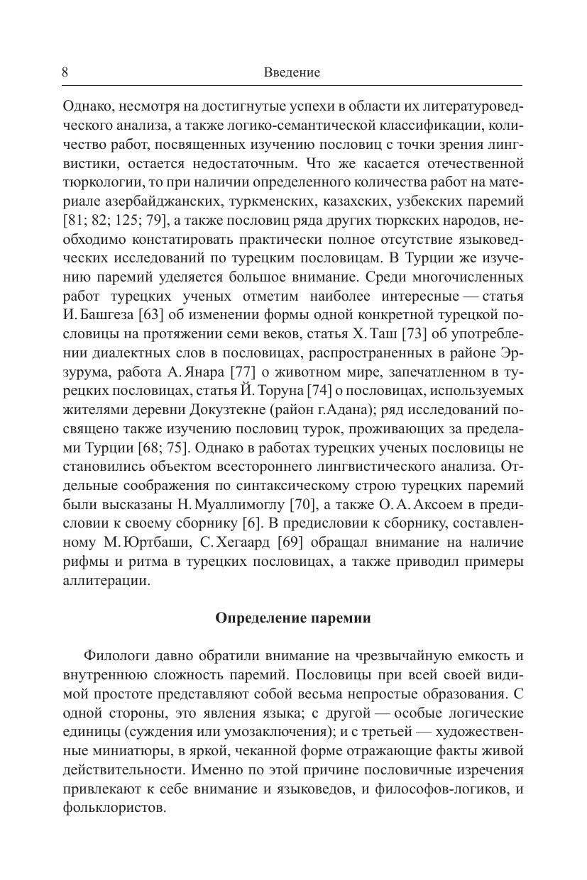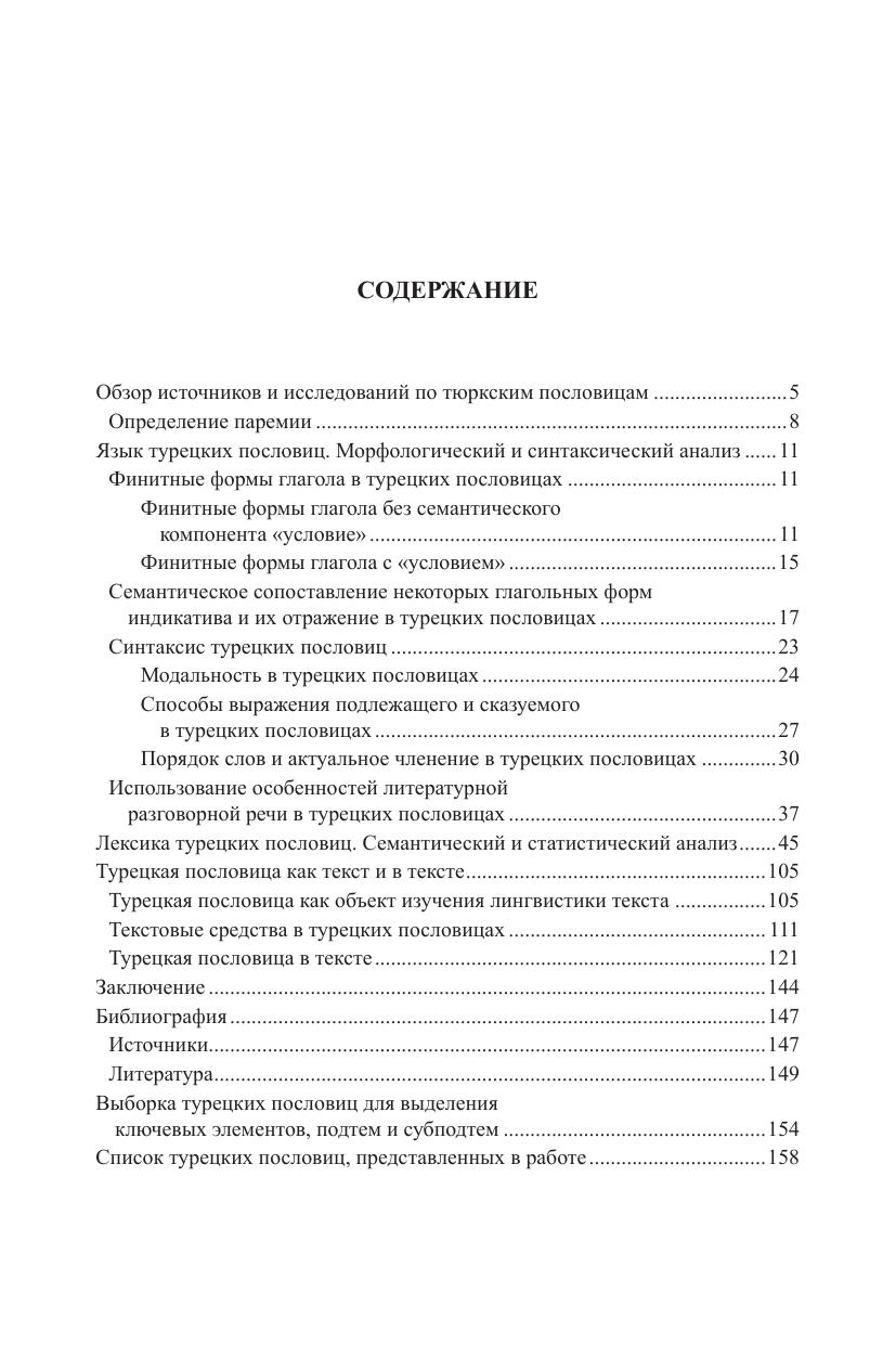 В книге впервые в отечественной и мировой тюркологии представлен комплексный лингвистический анализ полного корпуса опубликованных в разное время турецких пословиц - от "Дивана тюркских языков" Махмуда Кашгарского до современных сборников, всего около 6.000 паремий. Это исследование охватывает уровни морфологии и синтаксиса, в работе также используются новейшие разработки в области лингвистики текста. Отдельная глава посвящена анализу лексического состава турецких паремий, результаты которого представляют интерес не только для тюркологов и паремиологов, но и для специалистов в области традиционной культуры, языковой картины мира, этнолингвистики и др. Монография может заинтересовать также студентов-филологов и всех тех, кто не равнодушен к меткому слову восточных пословиц. В приложении содержится список из 335 турецких пословиц с переводом на русский язык, приведенных в тексте монографии.