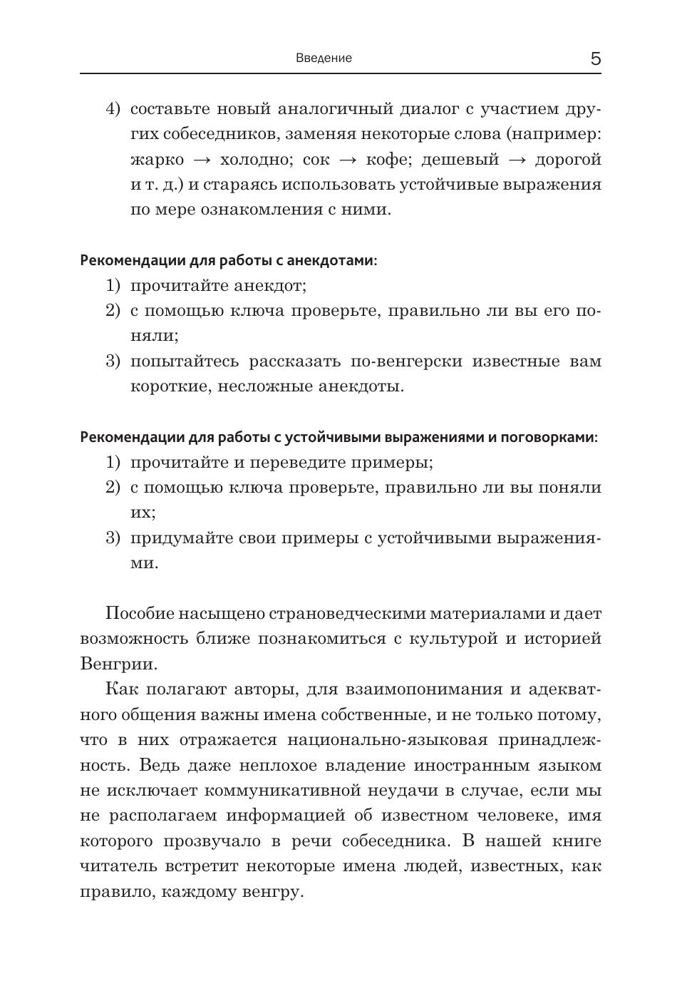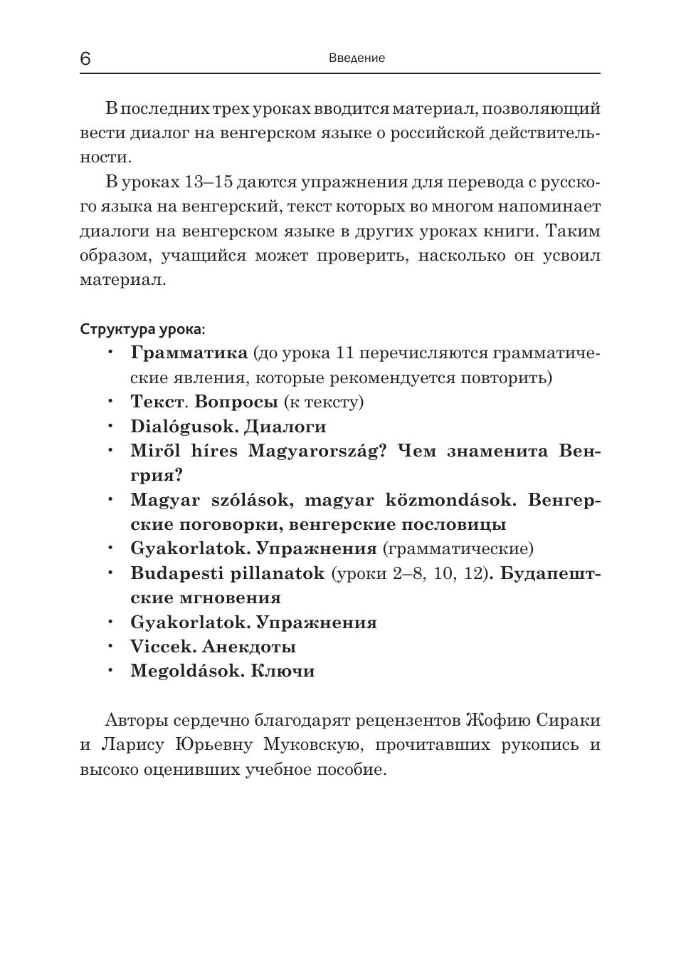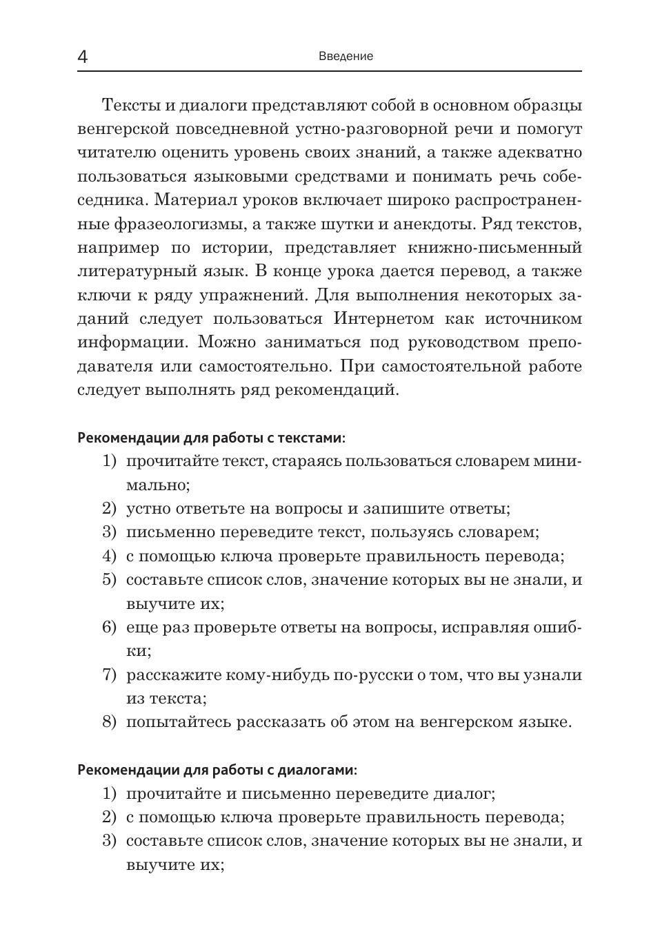 Пособие адресовано как самостоятельно обучающимся венгерскому языку, так и тем, кто изучает язык под руководством преподавателя. Учащиеся, которые только начали осваивать базовый курс венгерского языка, могут использовать книгу параллельно с основным учебником как дополнительное пособие. Книга содержит 15 уроков. Материал уроков располагается по степени возрастания сложности грамматических тем. Каждый урок включает тексты и диалоги, представляющие собой в основном образцы венгерской разговорной речи, фразеологизмы, а также шутки и анекдоты. Пособие насыщено страноведческой информацией и дает возможность ближе познакомиться с культурой и историей Венгрии. Задания и упражнения составляют небольшую часть урока. В случае необходимости дается грамматический или иной комментарий. В конце каждого урока дается перевод текстовых материалов и ключи. Пособие поможет учащемуся развить разговорные навыки, повторить основы грамматики и расширить словарный запас.