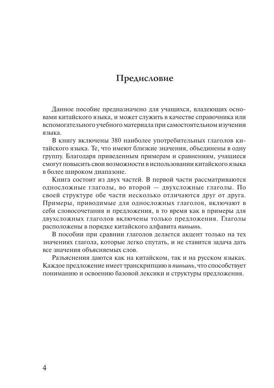 Данное пособие предназначено для учащихся, владеющих основами китайского языка, и может служить в качестве справочника или вспомогательного учебного материала при самостоятельном изучении языка. В книгу включены 380 наиболее употребительных глаголов китайского языка. Те, что имеют близкие значения, объединены в одну группу. Благодаря приведенным примерам и сравнениям учащиеся смогут повысить свои возможности в использовании китайского языка в более широком диапазоне. Разъяснения даются как на китайском, так и на русском языках. Каждое предложение имеет транскрипцию в пиньинь, что способствует пониманию и освоению базовой лексики и структуры предложения.