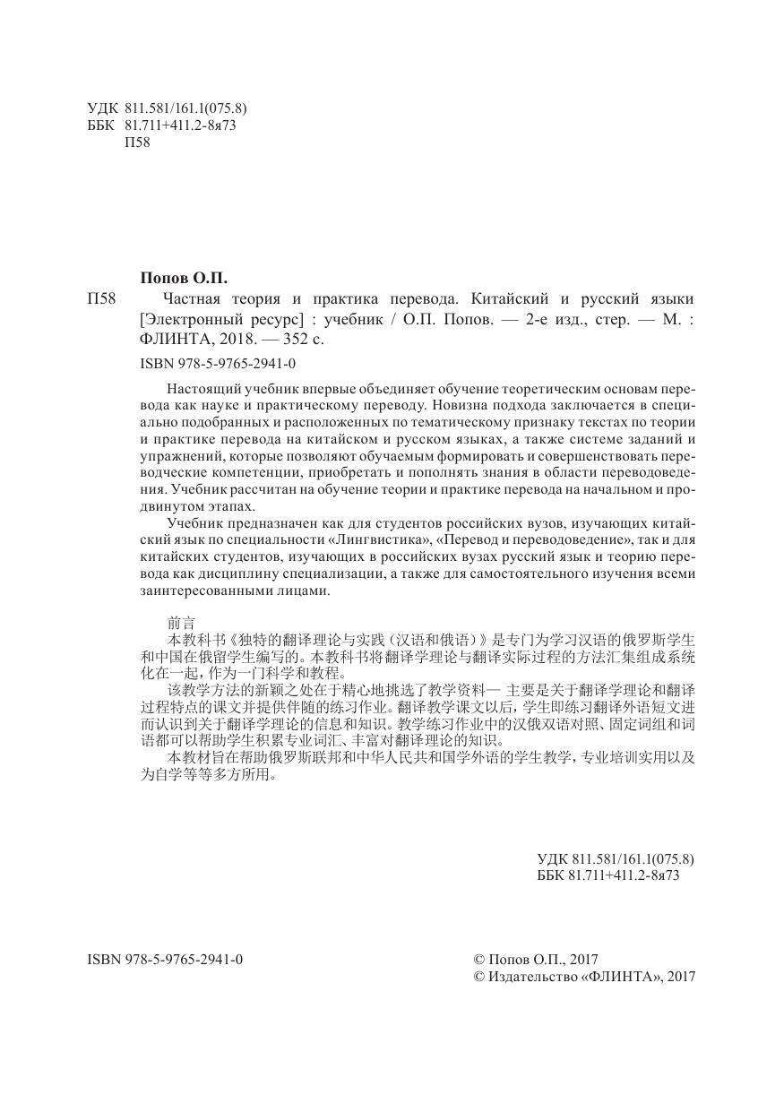 Учебник предназначен как для студентов российских вузов, изучающих китайский язык по специальности «Лингвистика», «Перевод и переводоведение», так и для китайских студентов, изучающих в российских вузах русский язык и теорию перевода как дисциплину специализации, а также для самостоятельного изучения всеми заинтересованными лицами.