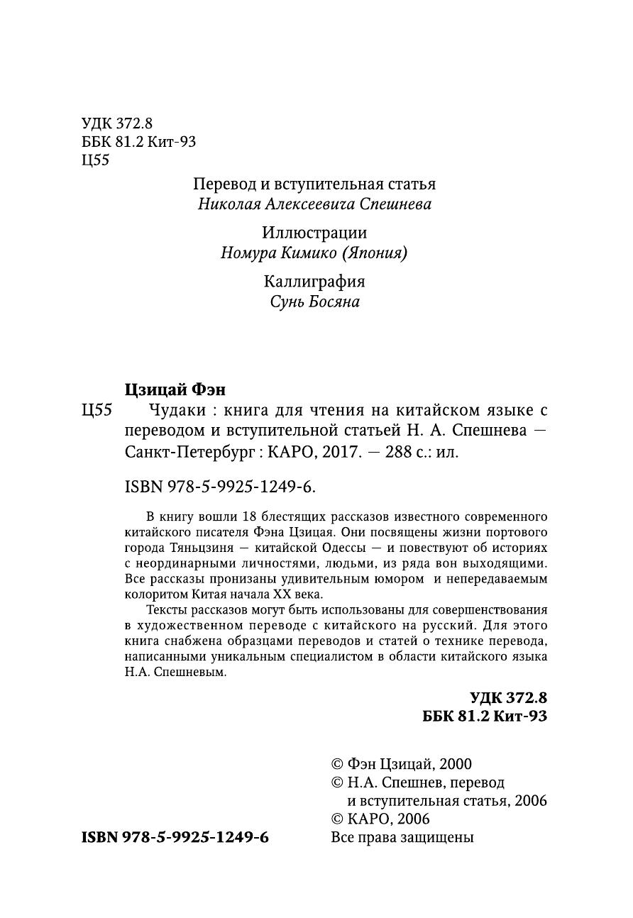В книгу вошли 18 блестящих рассказов известного современного китайского писателя Фэна Цзицая. Они посвещены жизни портового города Тяньцзиня — китайской Одессе — и повествуют об историях с неординарными личностями, людьми, из ряда вон выходящими. Все рассказы пронизаны удивительным юмором и непередаваемым колоритом Китая начала XX века. Тексты рассказов могут быть использованы для совершенствования в художественном переводе с китайского на русский. Для этого книга снабжена образцами переводов и статей о технике перевода, написанными уникальным специалистом в области китайского языка Н.А. Спешневым.