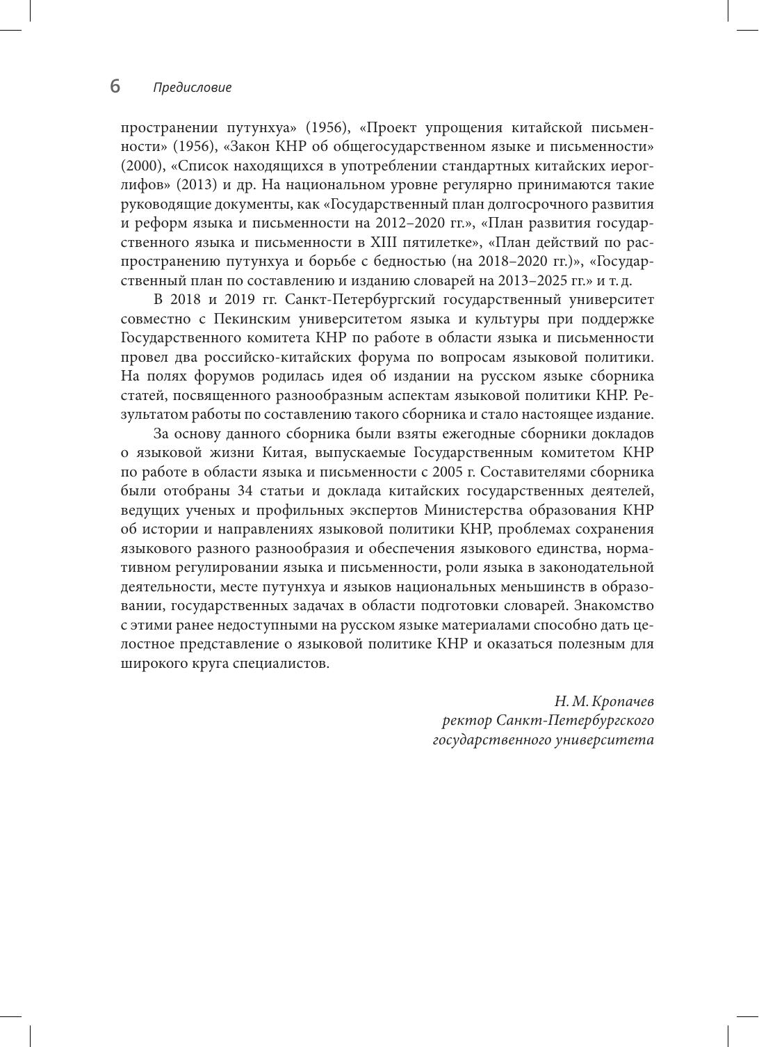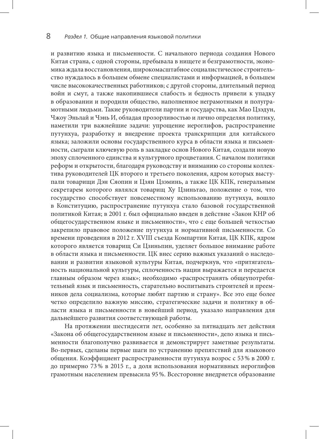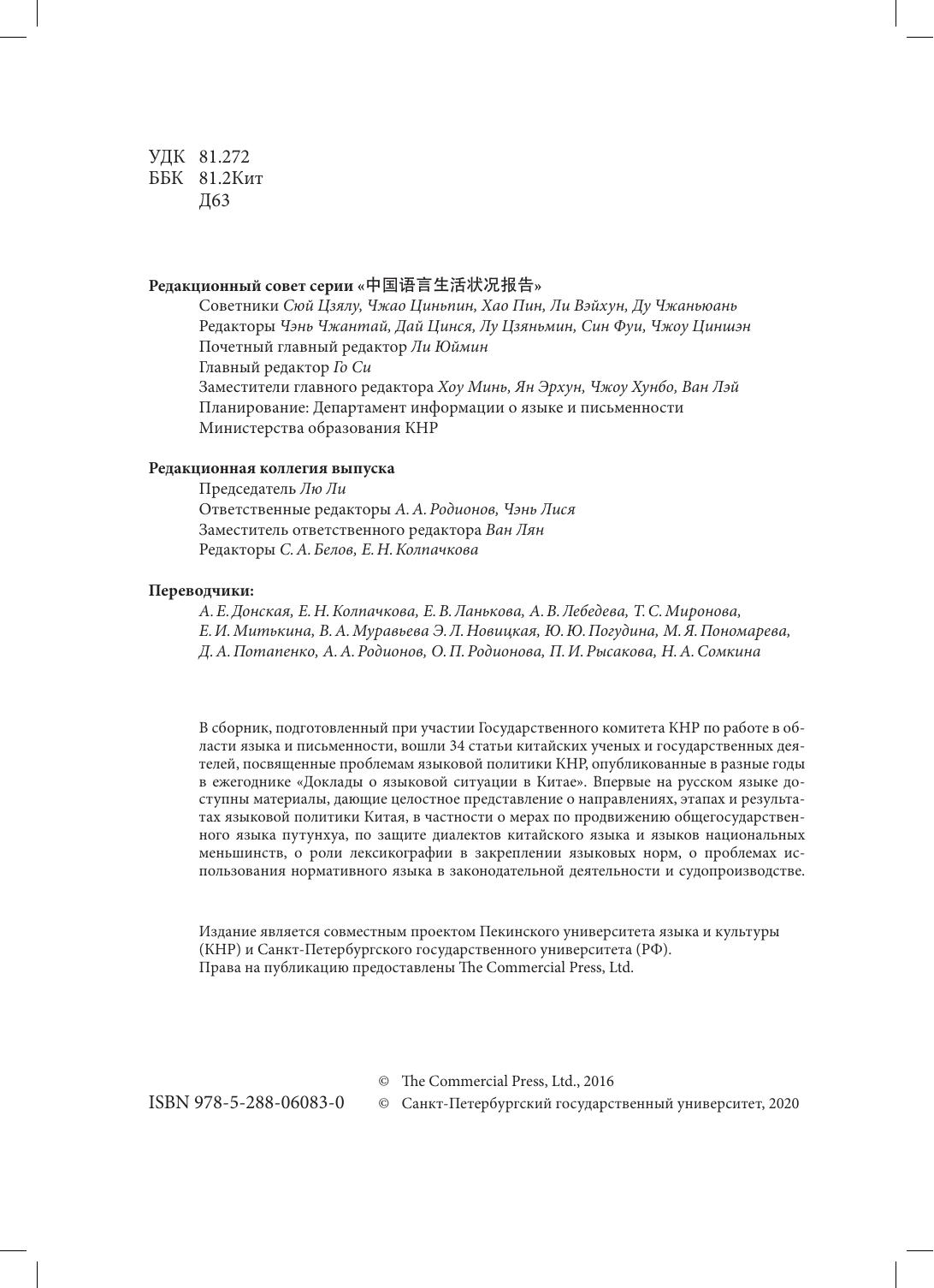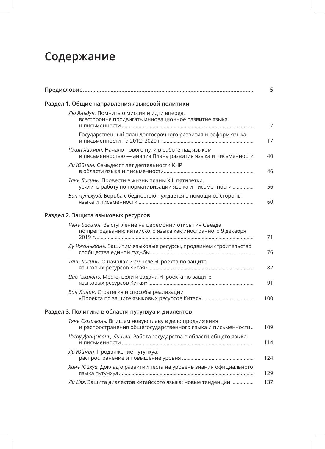 В сборник, подготовленный при участии Государственного комитета КНР по работе в области языка и письменности, вошли 34 статьи и выступления китайских ученых и государственных деятелей, посвященные проблемам языковой политики КНР, опубликованные в разные годы в ежегоднике "Доклады о языковой ситуации в Китае". Впервые на русском языке доступны материалы, дающие целостное представление о направлениях, этапах и результатах языковой политике Китая, в частности о мерах по продвижению общегосударственного языка путунхуа, по защите диалектов китайского языка и языков национальных меньшинств, о роли лексикографии в закреплении языковых норм, о проблемах использования нормативного языка в законодательной деятельности и судопроизводстве.