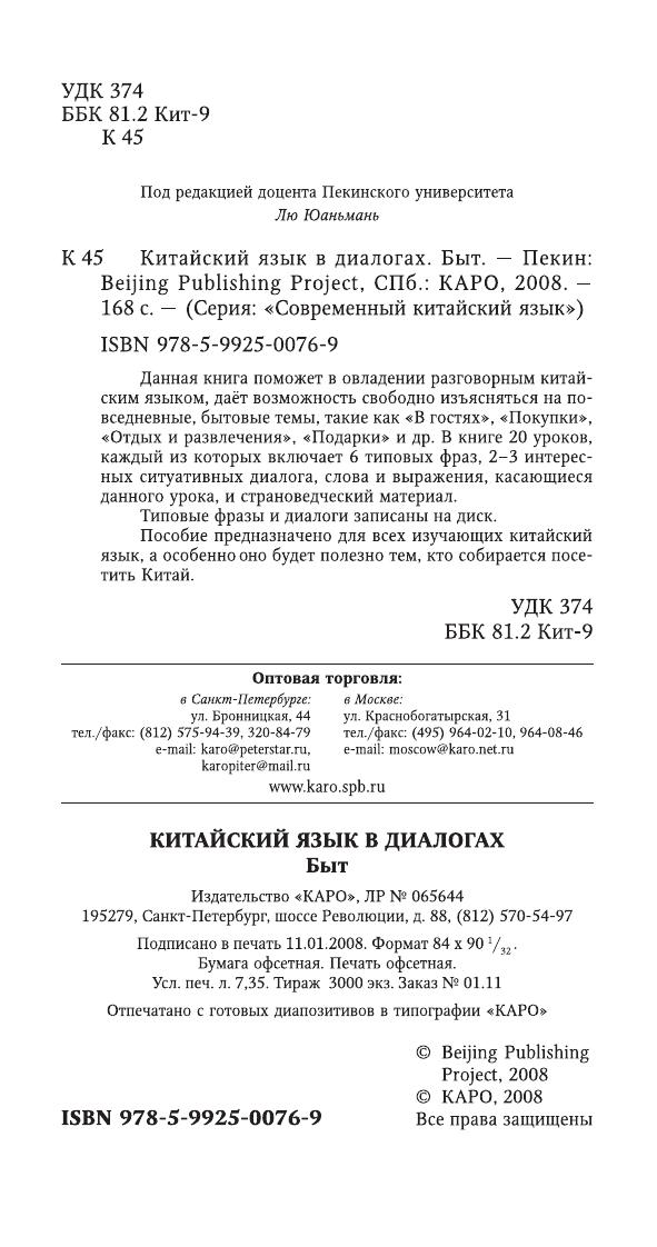 Данная книга поможет в овладении разговорным китайским языком, даёт возможность свободно изъясняться на повседневные, бытовые темы, такие как «В гостях», «Покупки», «Отдых и развлечения», «Подарки» и др. В книге 20 уроков, каждый из которых включает 6 типовых фраз, 2-3 интересных ситуативных диалога, слова и выражения, касающиеся данного урока, и страноведческий материал. Типовые фразы и диалоги записаны на диск. Пособие предназначено для всех изучающих китайский язык, а особенно оно будет полезно тем, кто собирается посетить Китай.