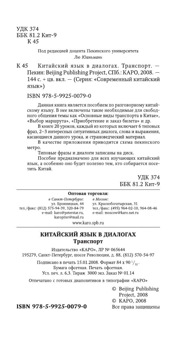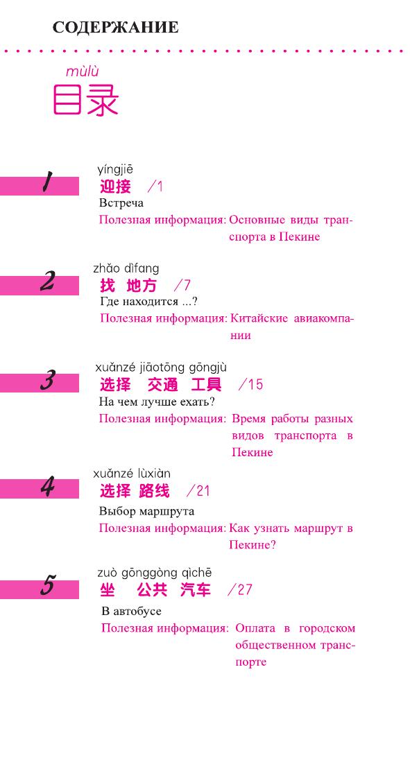 Данная книга является пособием по разговорному китайскому языку. В нее включены такие необходимые для свободного общения темы как «Основные виды транспорта в Китае», «Выбор маршрута», «Приобретение и заказ билета» и др. В книге 20 уроков, каждый из которых включает 6 типовых фраз, 2-3 интересных ситуативных диалога, слова и выражения, касающиеся данного урока, и страноведческий материал. В качестве приложения приводится схема пекинского метро. Типовые фразы и диалоги записаны на диск. Пособие предназначено для всех изучающих китайский язык, а особенно оно будет полезно тем, кто собирается посетить Китай.