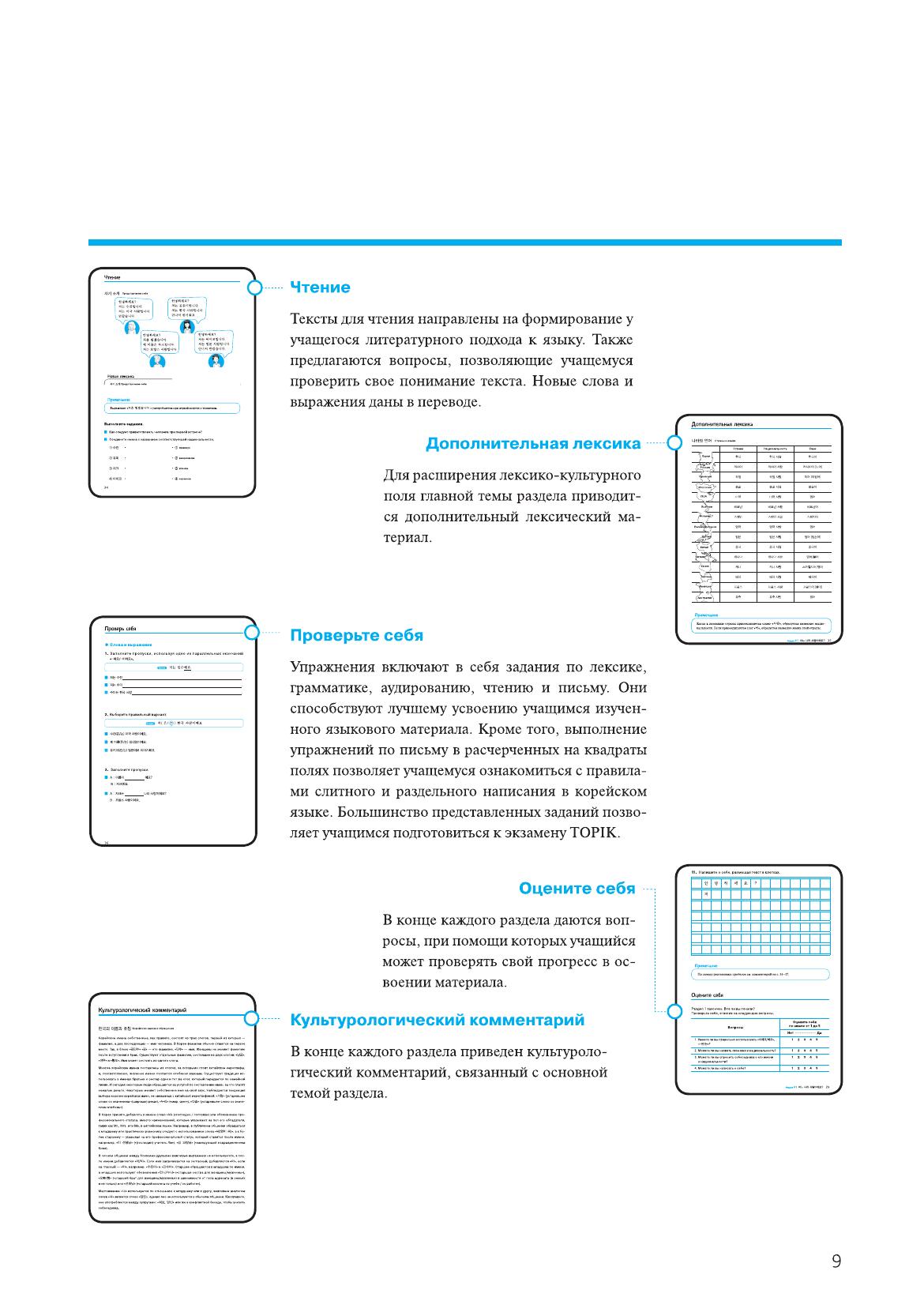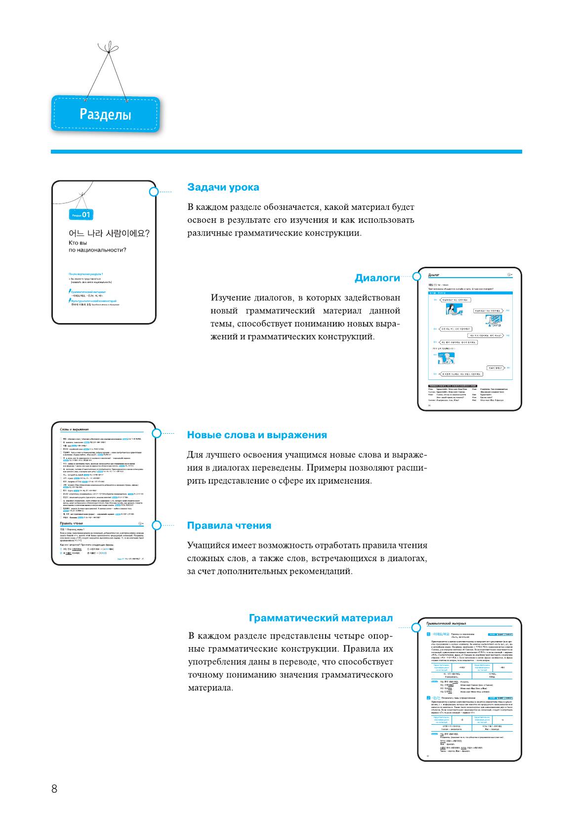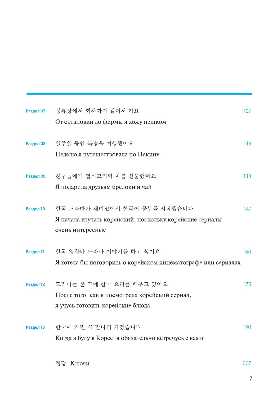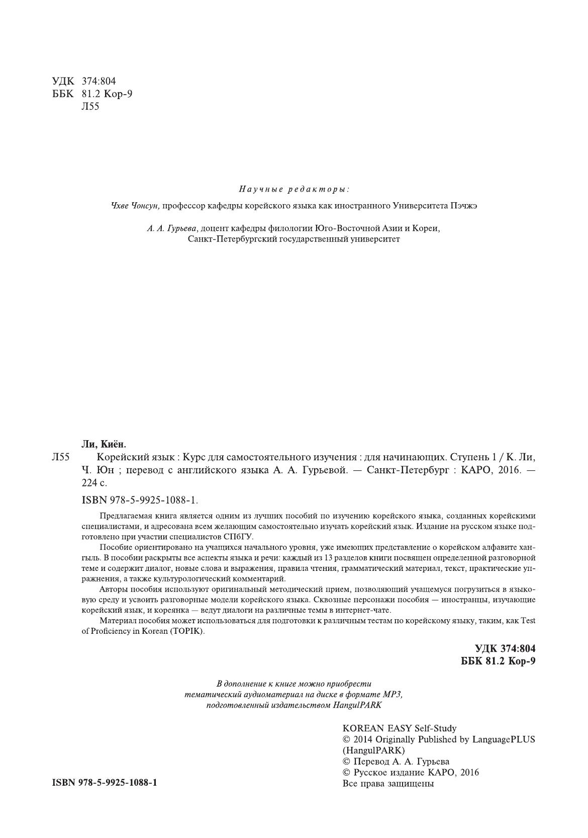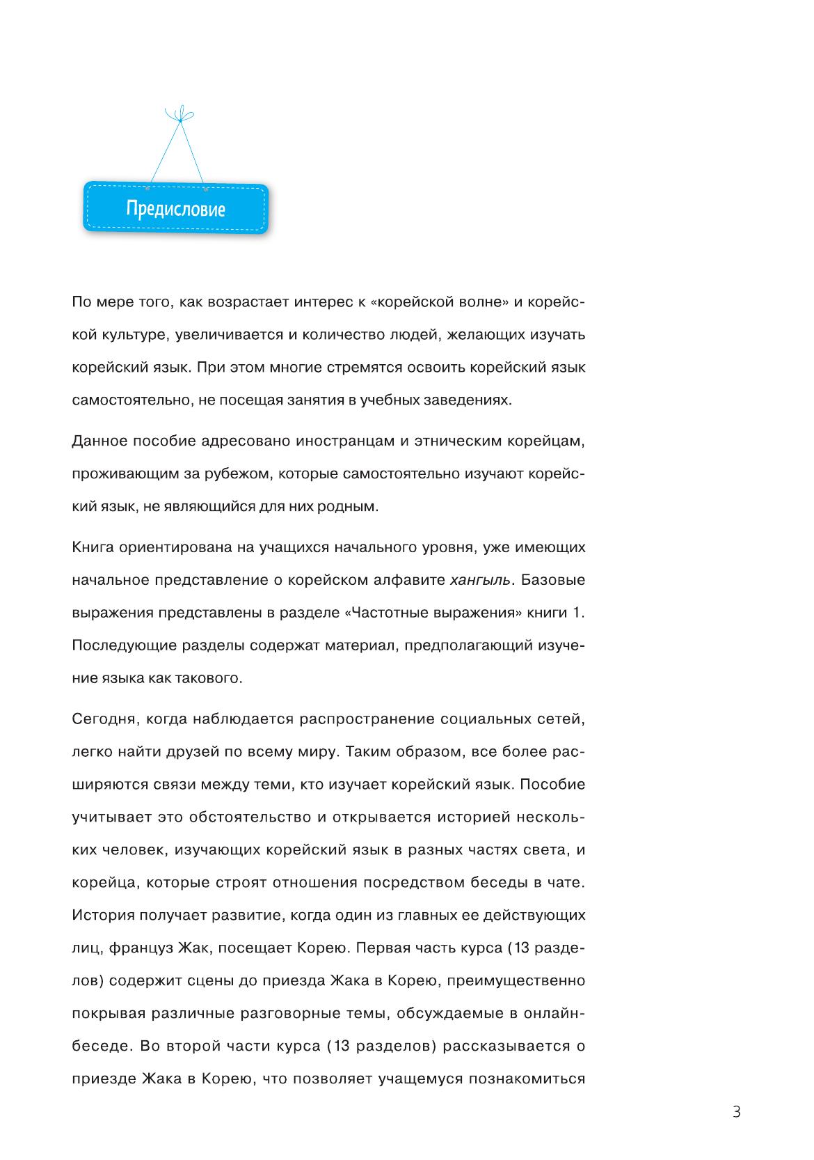 Предлагаемая книга является одним из лучших пособий по изучению корейского языка и адресована всем желающим самостоятельно осваивать этот язык. Курс создан корейскими специалистами, а издание на русском языке подготовлено при участии преподавателей СПбГУ. Курс ориентирован на учащихся начального уровня, уже имеющих представление о корейском алфавите хангыль. В пособии раскрыты все аспекты языка и речи: каждый из 13 разделов книги посвящен определенной разговорной теме и содержит диалог, новые слова и выражения, правила чтения, грамматический материал, текст, практические упражнения, а также культурологический комментарий. Авторы пособия используют оригинальный методический прием, позволяющий учащемуся погрузиться в языковую среду и усвоить разговорные модели корейского языка. Сквозные персонажи пособия — иностранцы, изучающие корейский язык, и кореянка — ведут диалоги на различные темы в интернет-чате. Материал пособия может использоваться для подготовки к различным тестам по корейскому языку, таким, как Test of Proficiency in Korean (TOPIK). В дополнение к книге можно приобрести тематический аудиоматериал в формате MP3, подготовленный издательством HangulPARK.