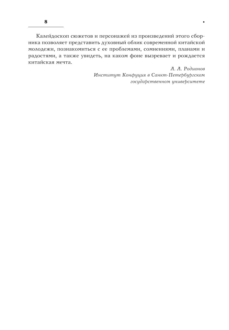 Калейдоскоп сюжетов и персонажей из произведений этого сборника позволяет представить духовный облик современной китайской молодежи, познакомиться с ее проблемами, сомнениями, планами и радостями, а также увидеть, на каком фоне вызревает и рождается китайская мечта.