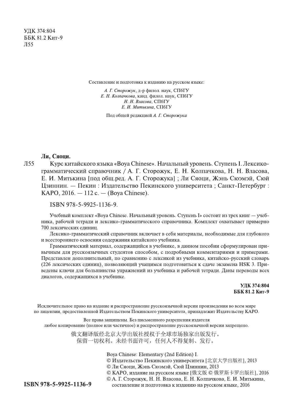 Учебный комплект "Boya chinese".Начальный уровень. Ступень I" состоит из трех книг - учебника, рабочей тетради и лексико-грамматического справочника. Комплект охватывает примерно 700 лексических единиц. Лексико-грамматический справочник включает в себя материалы, необходимые для глубокого и всестороннего освоения содержания китайского учебника. Грамматический материал, сожеджащийся в в учебнике, данном пособии сформулирован привычным для русскоязычных студентов способом, с подробными комментариями и примерами. Представлен дополнительный, по сравнению с лексикой из учебника, китайско-русский словарь (226 лексических единиц), позволяющий учащимся подготовиться к сдаче экзамена HSK 3. Приведены ключи для большинства упражнений из учебника и рабочей тетради. Даны переводы всех диалогов, содержащихся в учебнике.