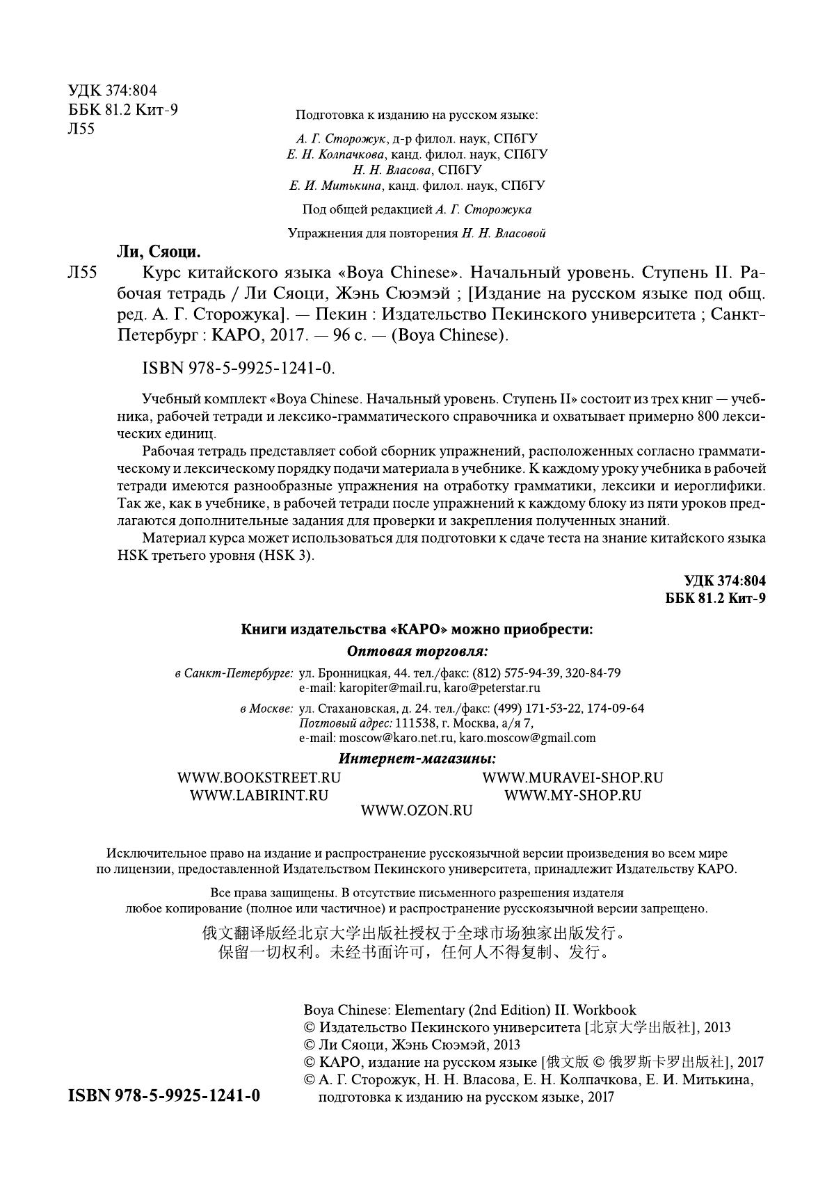 Учебный комплект " Boya Chinese". Начальный уровень. Ступень II" состоит из трех книг - учебника , рабочей тетради и лексико-грамматического справочника. Комплект охватывает примерно 800 лексических единиц. Рабочая тетрадь представляет собой сборник упражнений, расположенных согласно грамматическому и лексическому порядку подачи материала в учебнике. К каждому уроку учебника в рабочей тетради имеются разнообразные упражнения на отработку грамматики, лексики и иероглифики. Так же, как в учебнике, в рабочей тетради после упражнений к каждому блоку из пяти уроков предлагаются дополнительные задания для проверки и закрепления полученных знаний. Материал курса может использоваться для подготовки к сдаче теста на знание китайского языка HSK третьего уровня (HSK 3).