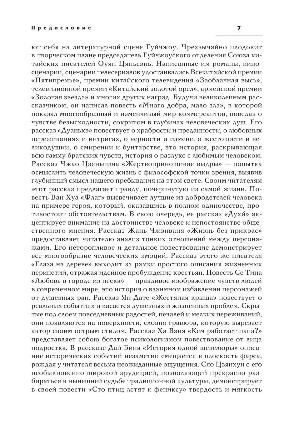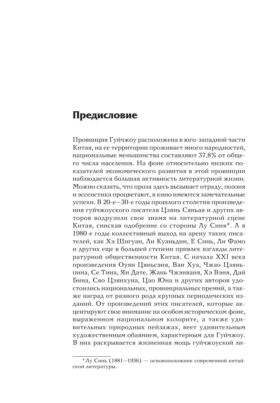 В сборник вошли пятнадцать повестей и рассказов, написанных в конце ХХ – начале ХХI века. Они принадлежат перу десяти писателей из южно-китайской провинции Гуйчжоу и ярко демонстрируют удивительное многообразие, а также этнокультурный колорит современной китайской литературы. Увлекательные истории о жизни в Гуйчжоу, написанные Оуян Цяньсэнем, Ван Хуа, Се Тином, Хэ Вэнем и другими, открывают читателю внутренний мир простых китайцев, их представления о счастье и душевное смятение от столкновения традиционных ценностей с реалиями глобализации и модернизации, неумолимо проникающими в самые дальние уголки Китая и изменяющими архаичный уклад жизни обитателей китайской глубинки.