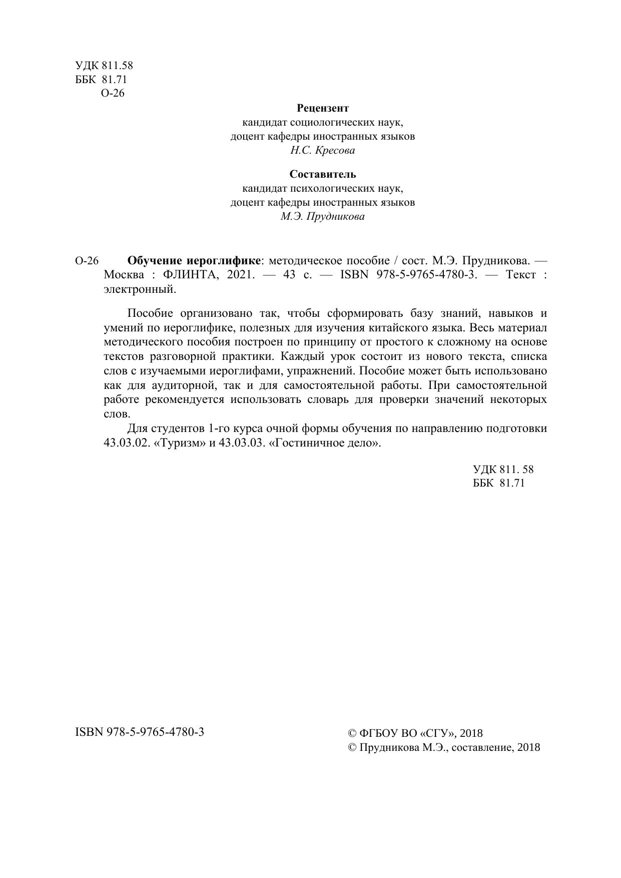 Пособие организовано так, чтобы сформировать базу знаний, навыков и умений по иероглифике, полезных для изучения китайского языка. Весь материал методического пособия построен по принципу от простого к сложному на основе текстов разговорной практики. Каждый урок состоит из нового текста, списка слов с изучаемыми иероглифами, упражнений. Пособие может быть использовано как для аудиторной, так и для самостоятельной работы. При самостоятельной работе рекомендуется использовать словарь для проверки значений некоторых слов.