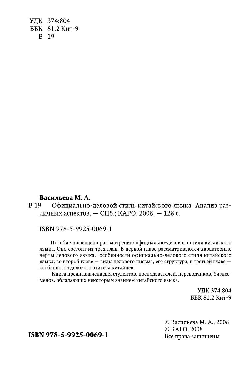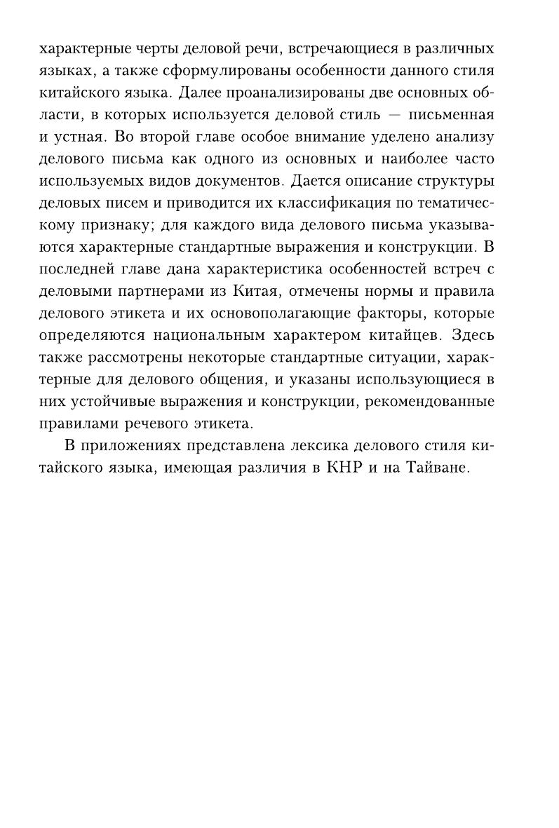 Пособие посвящено рассмотрению официально-делового стиля китайского языка. Оно состоит из трех глав. В первой главе рассматриваются характерные черты делового языка, особенности официально-делового стиля китайского языка, во второй главе — виды делового письма, его структура, в третьей главе — особенности делового этикета китайцев. Книга предназначена для студентов, преподавателей, переводчиков, бизнесменов, обладающих некоторым знанием китайского языка.