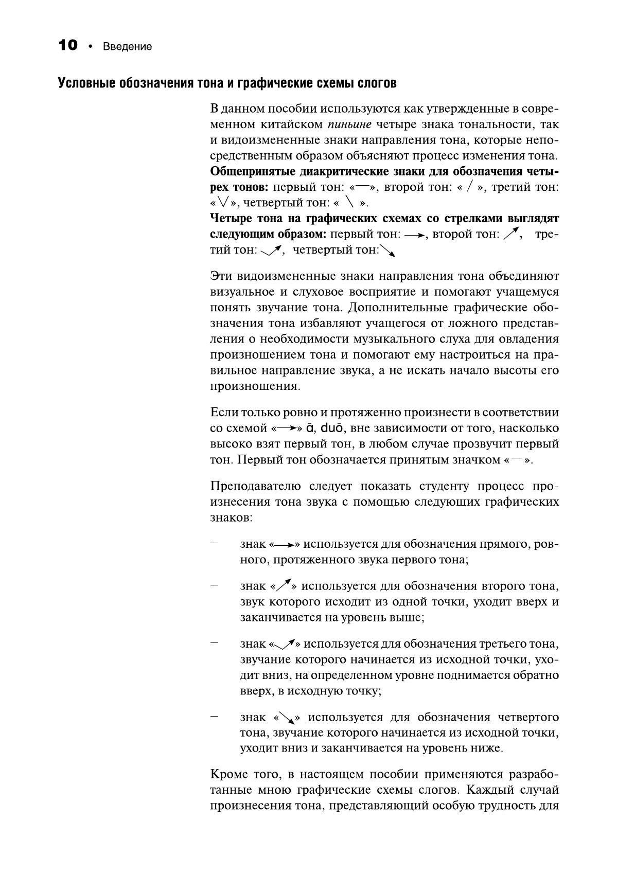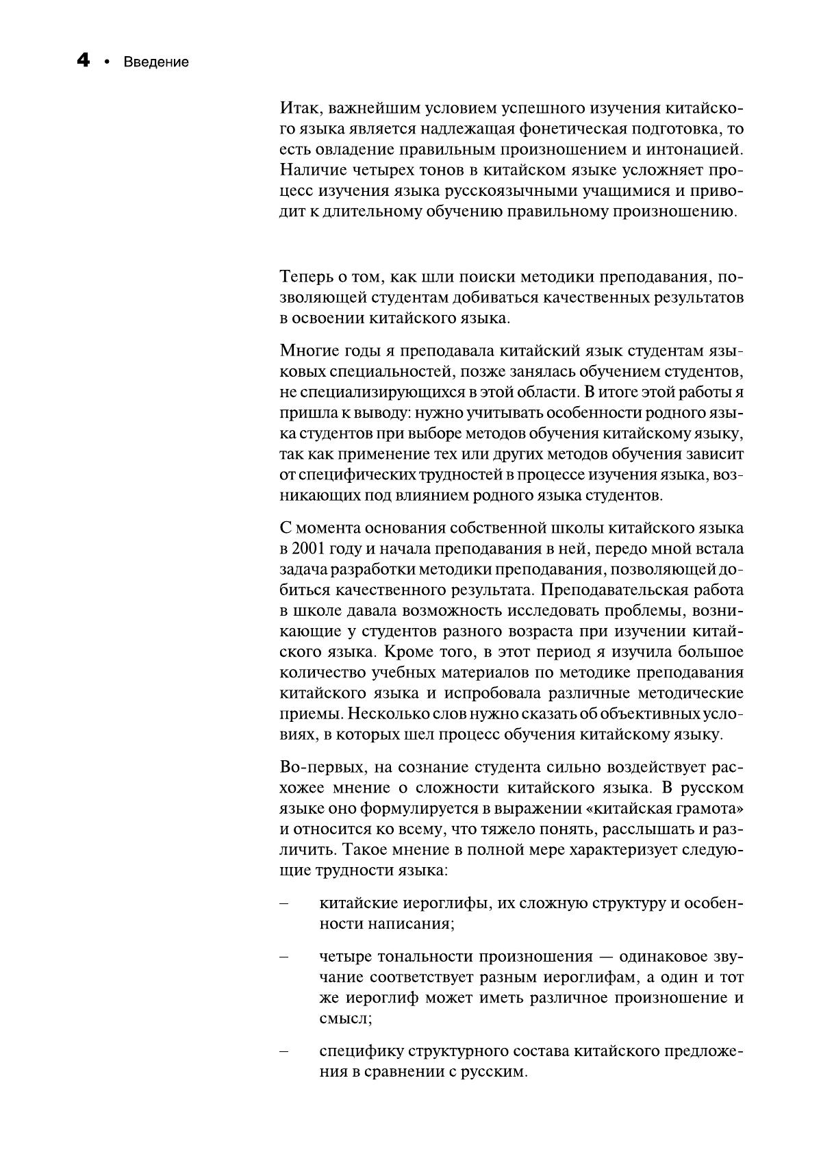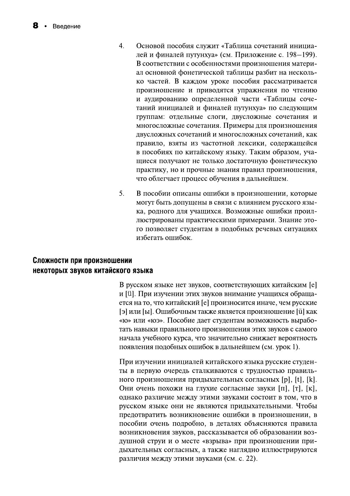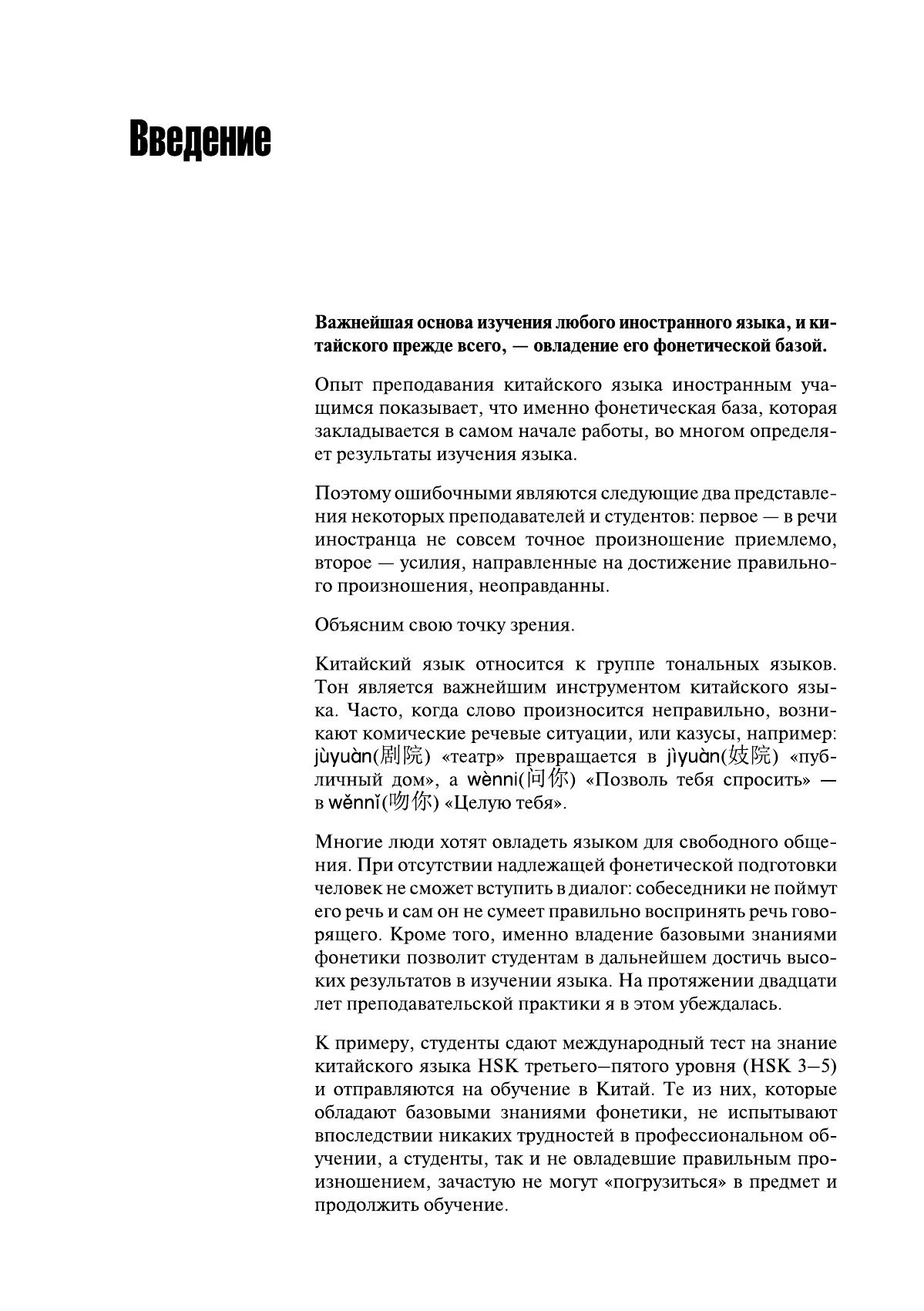 Китайский язык - язык тональный, поэтому важнейшим фактором достижения учащимися хорошего уровня владения китайским языком является правильное произношение, в особенности правильное произношение слогов в четырех тонах, то есть надлежащая фонетическая подготовка. Настоящее учебное пособие адресовано старшеклассникам и студентам неязыковых специальностей и рассчитано на 16-20 учебных часов (при общей длительности курса не более 1,5 месяцев). В нем практически отсутствуют специальные фонетические термины и схемы строения речевого аппарата. Принципы произношения звуков описаны не с теоретической точки зрения, а с точки зрения процесса произнесения, с опорой на врожденную способность людей подражать произношению. На компакт-диске в формате МРЗ, подготовленном издательством, представлен большой фонетический материал. Прослушивание диска - непременное условие овладения произносительными навыками. Наличие четырех тонов в китайском языке усложняет изучение языка русскоязычными учащимися и приводит к длительному овладению правильным произношением. Для каждого случая прочтения слога, произношение тона которого представляет особую трудность, в пособии предлагаются разработанные автором графические схемы с подробными комментариями. Зрительное восприятие схемы облегчает учащимся понимание того, как правильно произносить слог. В каждом из четырех уроков пособия рассматривается произношение слога и сочетаний слогов и приводятся упражнения по чтению и аудированию в следующей последовательности: отдельные слоги, двусложные сочетания и многосложные сочетания. Примеры для произношения двусложных и многосложных сочетаний, как правило, взяты из частотной лексики, содержащейся в пособиях по китайскому языку. Таким образом, учащиеся получают не только достаточную фонетическую практику, но и прочные знания правил произношения, что облегчает процесс обучения в дальнейшем. После завершения этапа изучения фонетической части языкового курса, на следующем этапе обучения языку, необходимо постоянно уделять внимание фонетике, использовать фонетические задания и корректировать неправильное произношение.