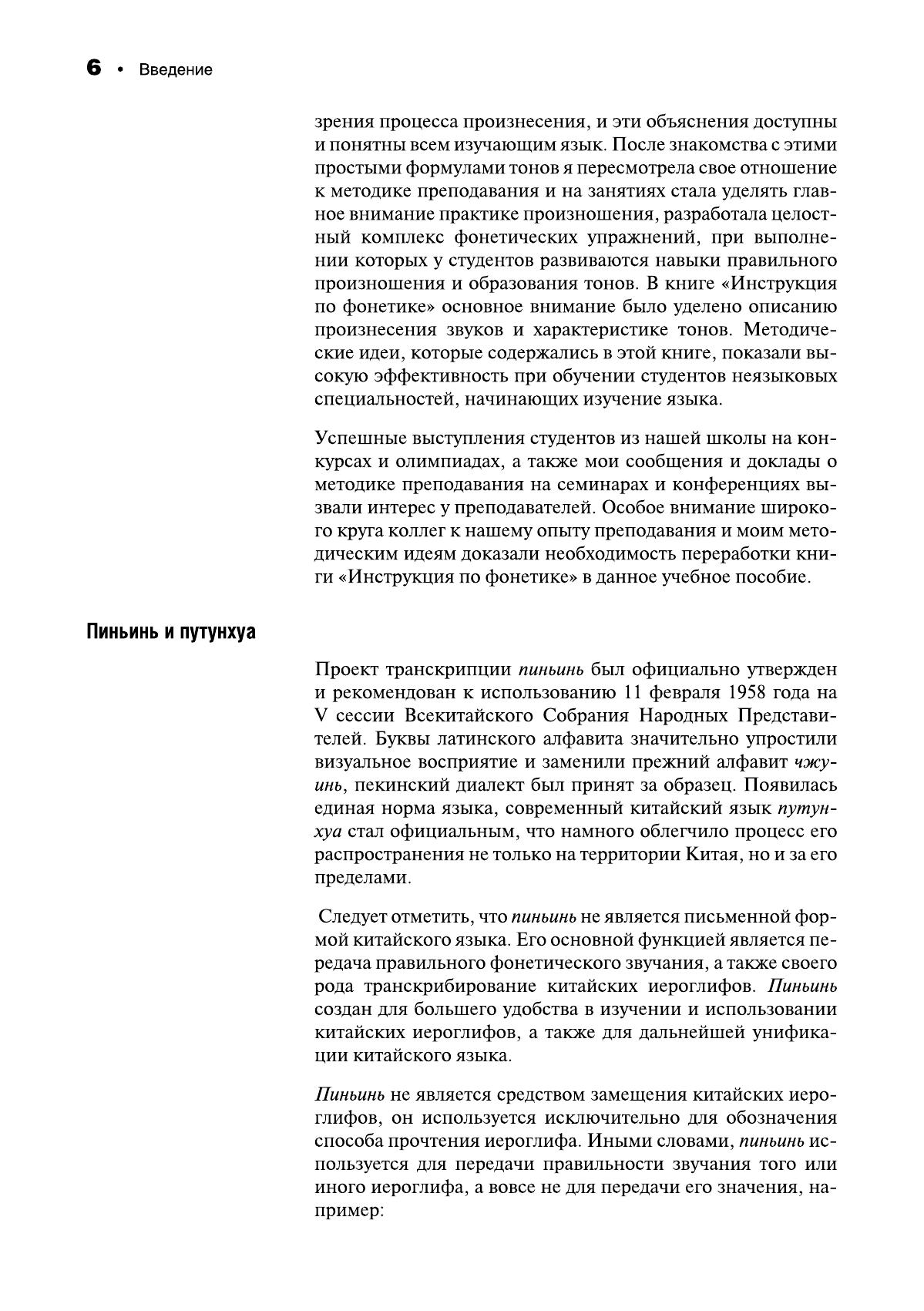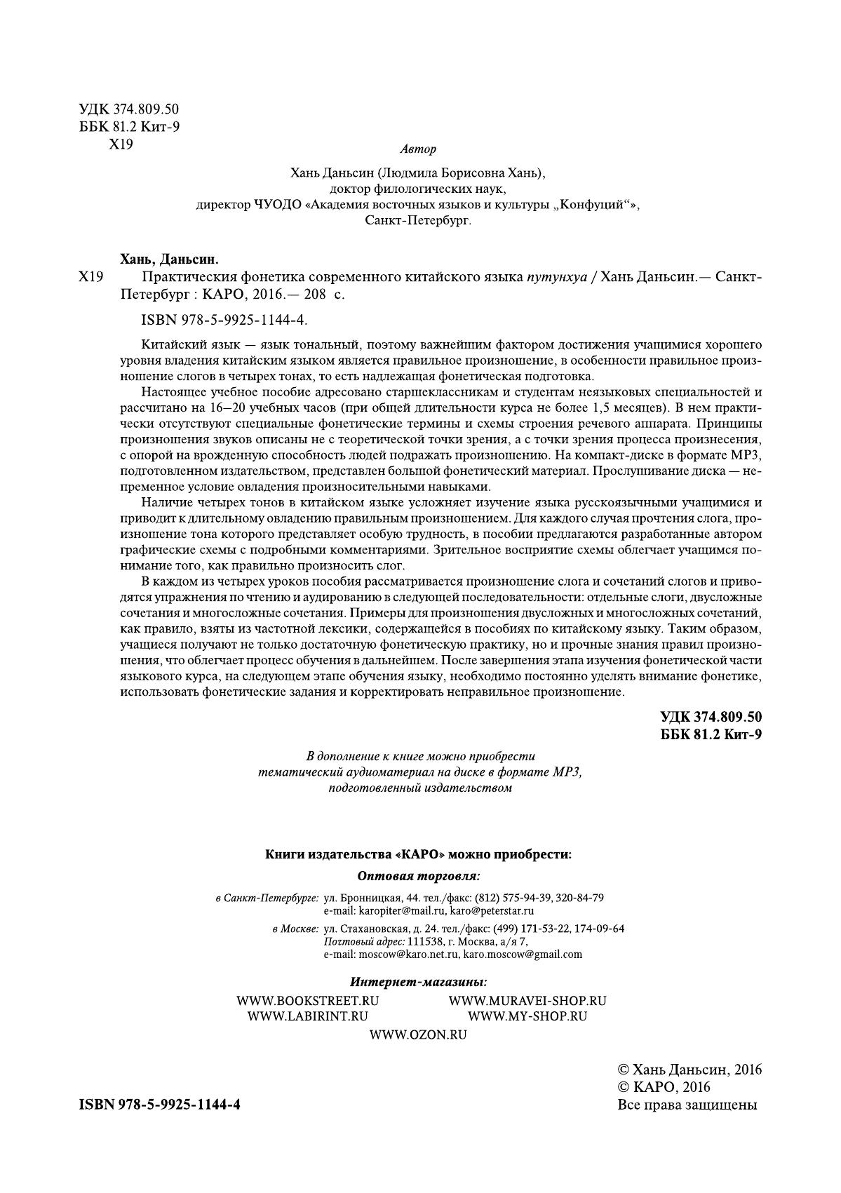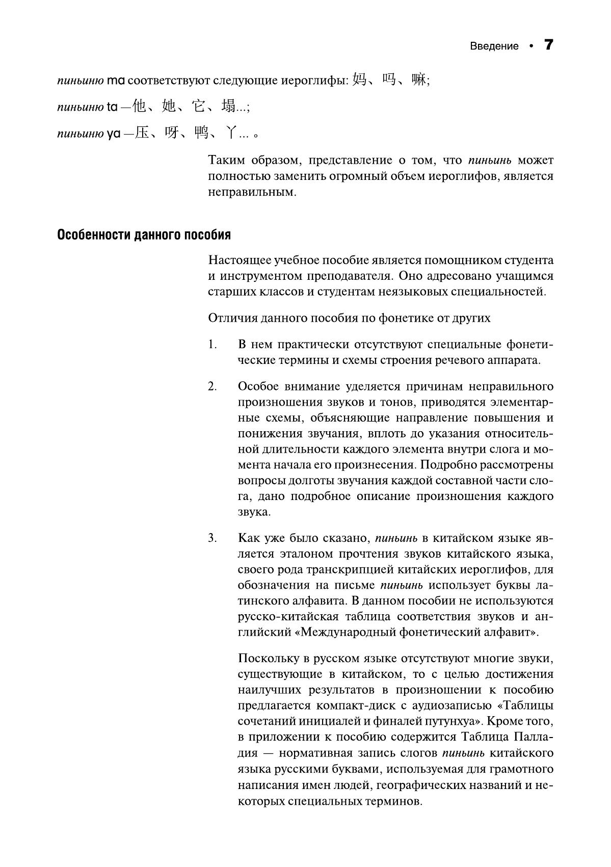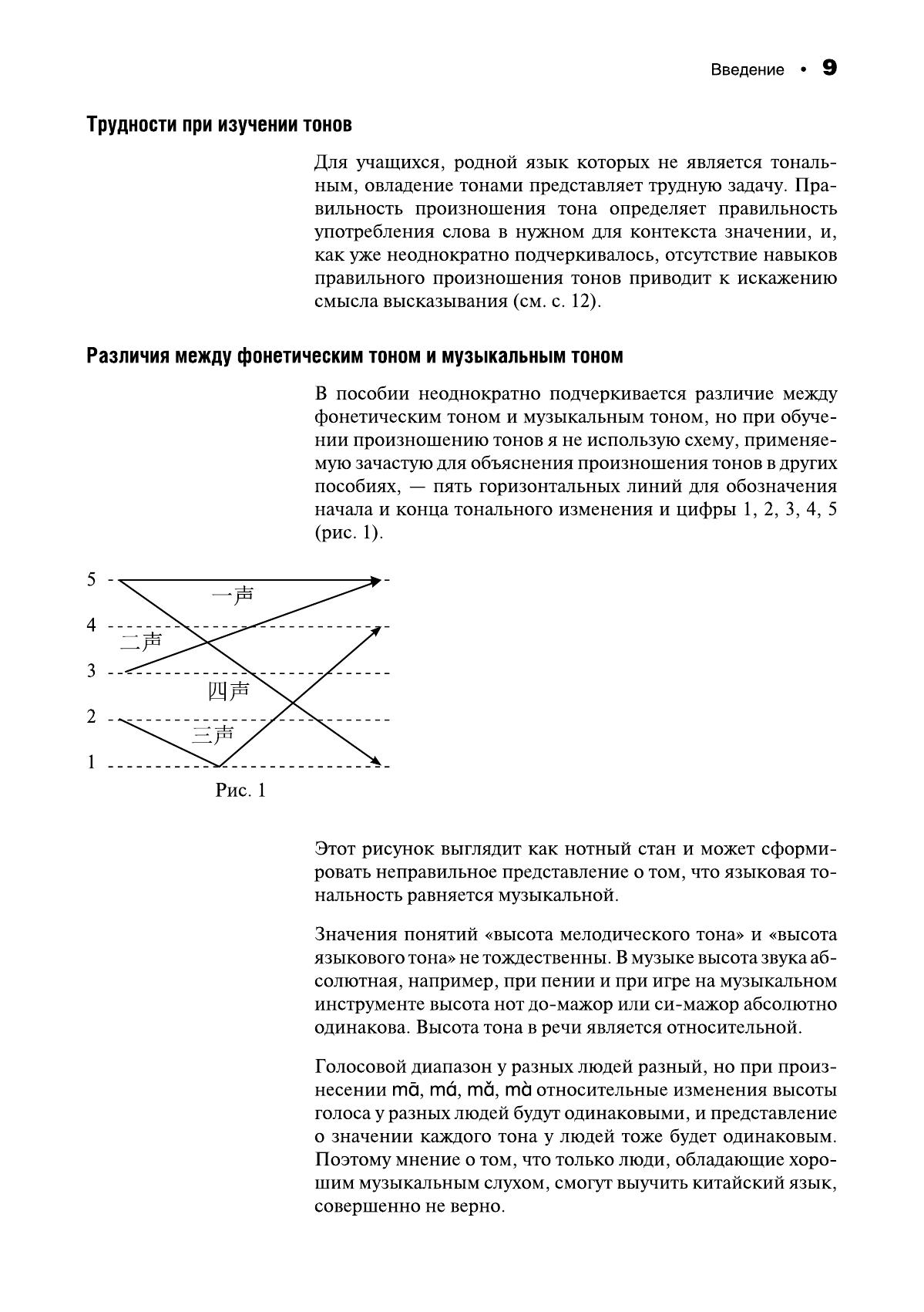 Китайский язык - язык тональный, поэтому важнейшим фактором достижения учащимися хорошего уровня владения китайским языком является правильное произношение, в особенности правильное произношение слогов в четырех тонах, то есть надлежащая фонетическая подготовка. Настоящее учебное пособие адресовано старшеклассникам и студентам неязыковых специальностей и рассчитано на 16-20 учебных часов (при общей длительности курса не более 1,5 месяцев). В нем практически отсутствуют специальные фонетические термины и схемы строения речевого аппарата. Принципы произношения звуков описаны не с теоретической точки зрения, а с точки зрения процесса произнесения, с опорой на врожденную способность людей подражать произношению. На компакт-диске в формате МРЗ, подготовленном издательством, представлен большой фонетический материал. Прослушивание диска - непременное условие овладения произносительными навыками. Наличие четырех тонов в китайском языке усложняет изучение языка русскоязычными учащимися и приводит к длительному овладению правильным произношением. Для каждого случая прочтения слога, произношение тона которого представляет особую трудность, в пособии предлагаются разработанные автором графические схемы с подробными комментариями. Зрительное восприятие схемы облегчает учащимся понимание того, как правильно произносить слог. В каждом из четырех уроков пособия рассматривается произношение слога и сочетаний слогов и приводятся упражнения по чтению и аудированию в следующей последовательности: отдельные слоги, двусложные сочетания и многосложные сочетания. Примеры для произношения двусложных и многосложных сочетаний, как правило, взяты из частотной лексики, содержащейся в пособиях по китайскому языку. Таким образом, учащиеся получают не только достаточную фонетическую практику, но и прочные знания правил произношения, что облегчает процесс обучения в дальнейшем. После завершения этапа изучения фонетической части языкового курса, на следующем этапе обучения языку, необходимо постоянно уделять внимание фонетике, использовать фонетические задания и корректировать неправильное произношение.