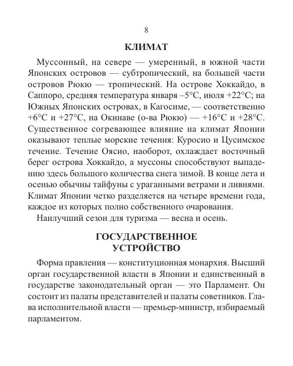 Страна восходящего солнца – территория загадок и величественных гор. Они составляют 70% территории. Лучшее время для поездки в Японию – весна и осень. Это лишь один из многих советов, которыми делятся с туристом составители русско-японского разговорника издательства КАРО. Здесь вы найдёте полезную информацию о стране, и главное - перевод самых необходимых фраз на японском языке с русской транскрипцией. Вся лексика делится на ситуативные тематики.