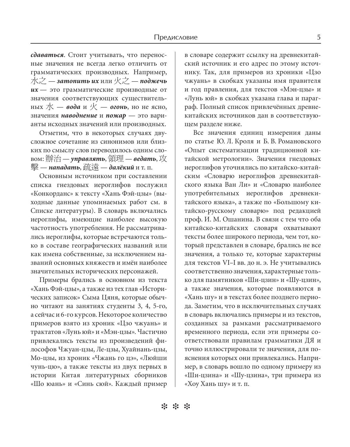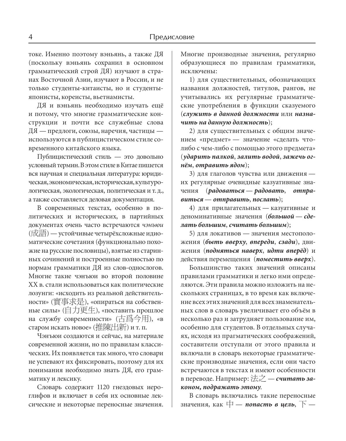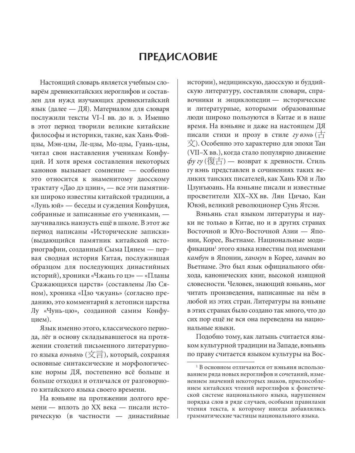 Словарь является учебным словарём древнекитайских иероглифов и составлен для нужд изучающих древнекитайский язык. Материалом для словаря послужили тексты VI–I вв. до н. э. Язык именно этого, классического периода, лёг в основу складывавшегося на протяжении столетий письменного литературного языка вэньянь. На вэньяне вплоть до XX в. писали историческую, медицинскую, даоскую и буддийскую литературу, составляли словари, справочники, энциклопедии, которыми пользуются и в наше время. Вэньянь стал языком литературы и науки не только в Китае, но и в других странах Восточной и Юго-Восточной Азии – Японии, Корее, Вьетнаме. Древнекитайский язык необходимо изучать ещё и потому, что многие его грамматические конструкции используются в публицистическом стиле современного китайского языка – в газетных статьях, в научной и специальной литературе, в партийных и деловых документах. Словарь содержит 1120 гнездовых иероглифов и включает в себя иероглифические указатели и словарь омографов. Словарь будет полезен не только студентам востоковедных специальностей, изучающим древнекитайский язык, но и всем интересующимся историей и культурой Китая.