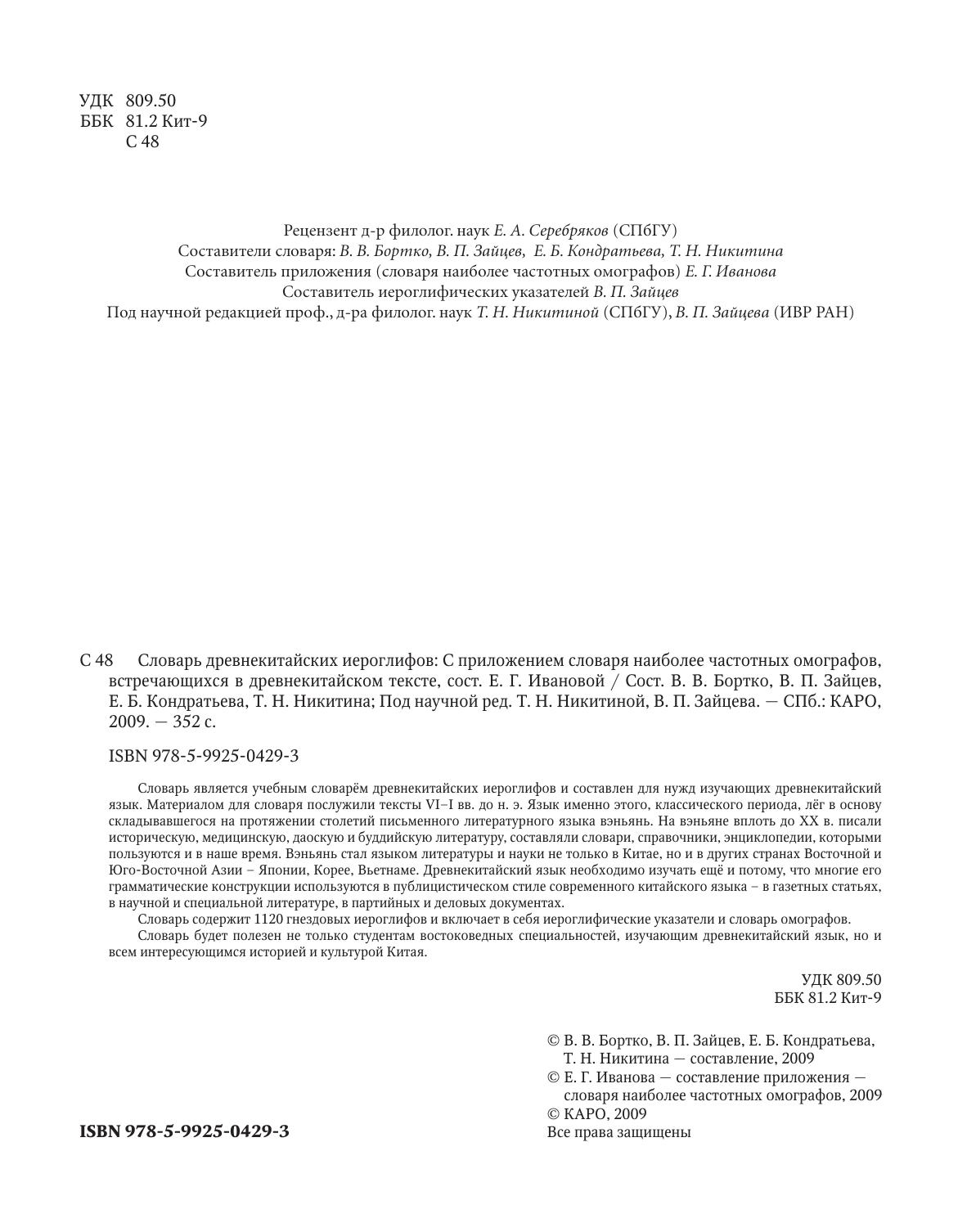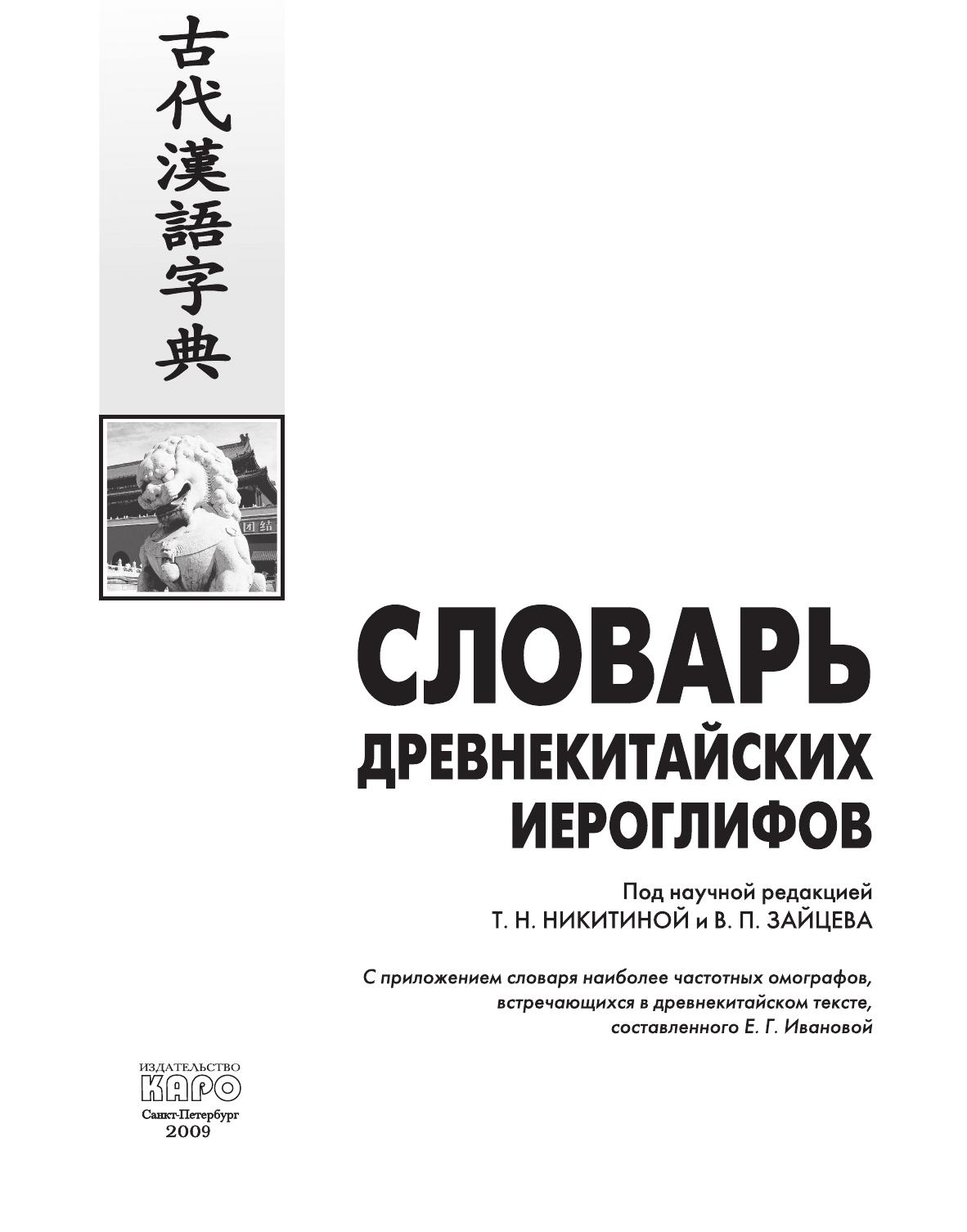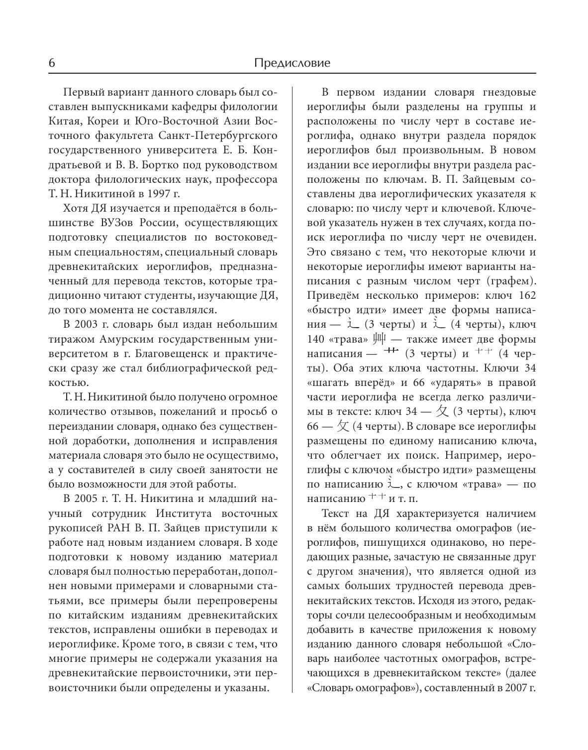 Словарь является учебным словарём древнекитайских иероглифов и составлен для нужд изучающих древнекитайский язык. Материалом для словаря послужили тексты VI–I вв. до н. э. Язык именно этого, классического периода, лёг в основу складывавшегося на протяжении столетий письменного литературного языка вэньянь. На вэньяне вплоть до XX в. писали историческую, медицинскую, даоскую и буддийскую литературу, составляли словари, справочники, энциклопедии, которыми пользуются и в наше время. Вэньянь стал языком литературы и науки не только в Китае, но и в других странах Восточной и Юго-Восточной Азии – Японии, Корее, Вьетнаме. Древнекитайский язык необходимо изучать ещё и потому, что многие его грамматические конструкции используются в публицистическом стиле современного китайского языка – в газетных статьях, в научной и специальной литературе, в партийных и деловых документах. Словарь содержит 1120 гнездовых иероглифов и включает в себя иероглифические указатели и словарь омографов. Словарь будет полезен не только студентам востоковедных специальностей, изучающим древнекитайский язык, но и всем интересующимся историей и культурой Китая.