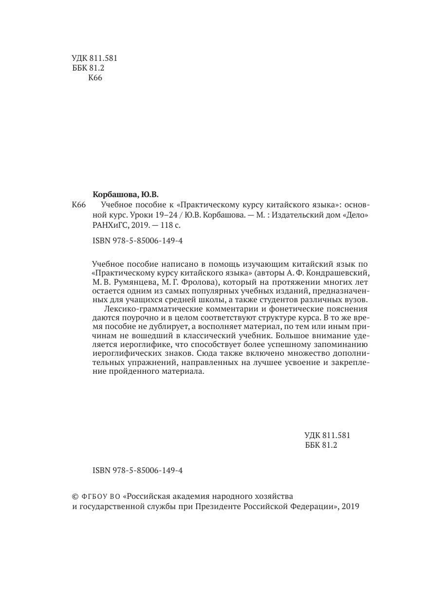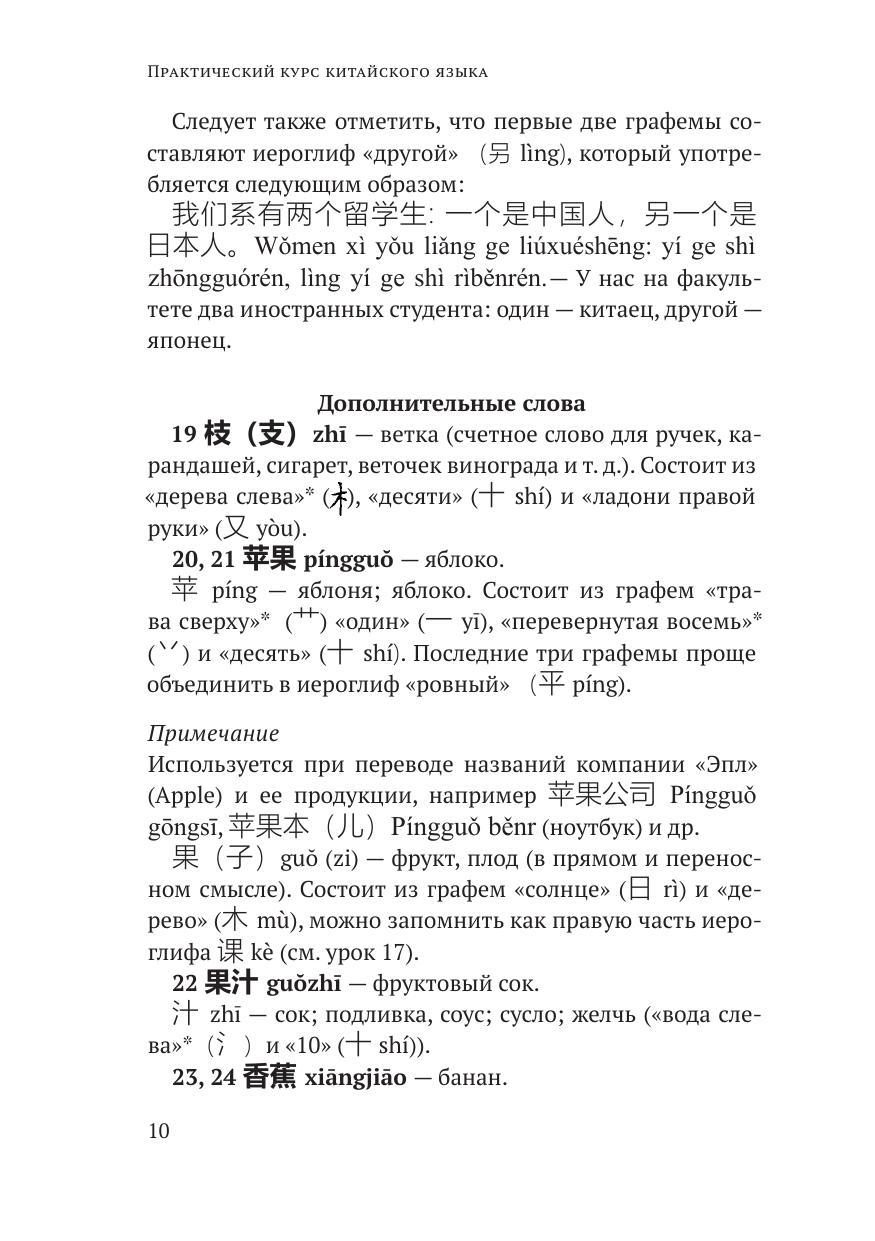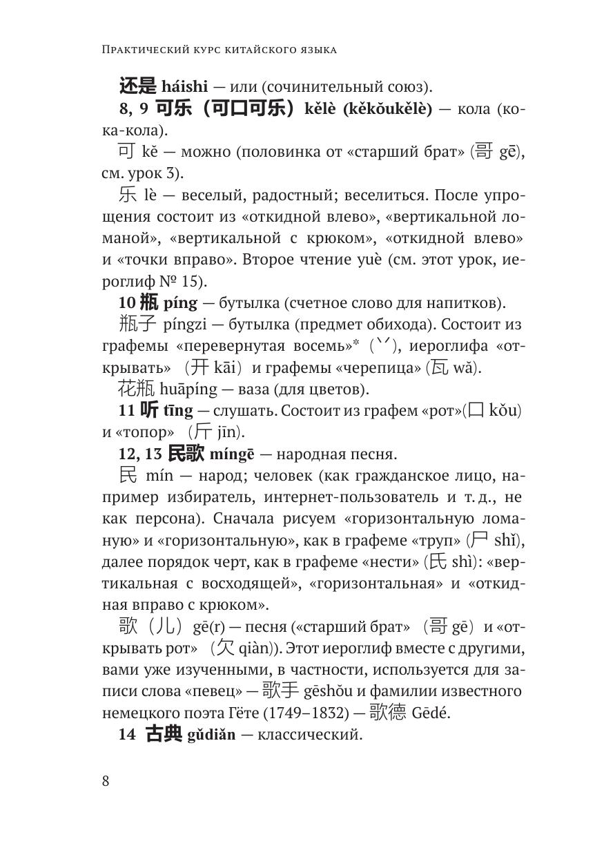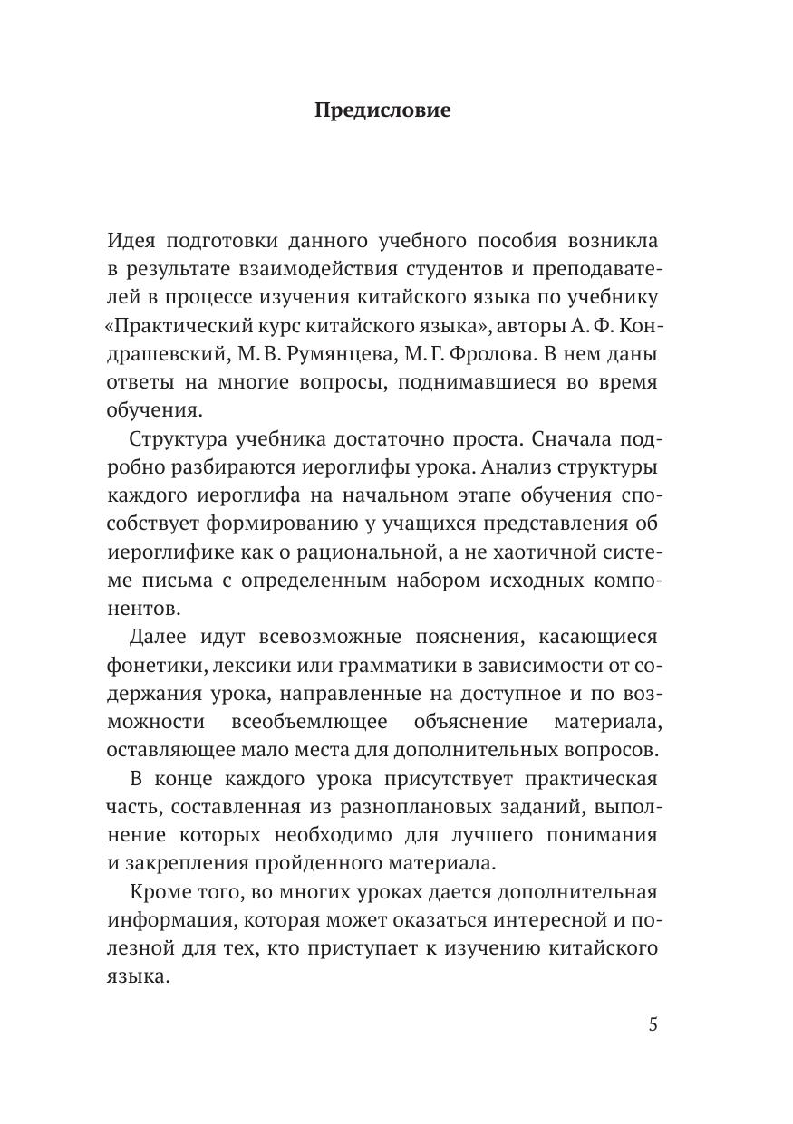Учебное пособие написано в помощь изучающим китайский язык по «Практическому курсу китайского языка» (авторы А.Ф. Кондрашевский, М. В. Румянцева, М. Г. Фролова), который на протяжении многих лет остается одним из самых популярных учебных изданий, предназначенных для учащихся средней школы, а также студентов различных вузов. Лексико-грамматические комментарии и фонетические пояснения даются поурочно и в целом соответствуют структуре курса. В то же время пособие не дублирует, а восполняет материал, по тем или иным причинам не вошедший в классический учебник. Большое внимание уделяется иероглифике, что способствует более успешному запоминанию иероглифических знаков. Сюда также включено множество дополнительных упражнений, направленных на лучшее усвоение и закрепление пройденного материала.