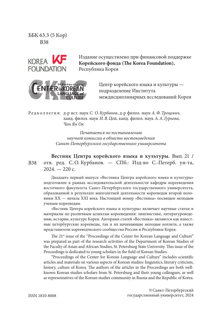 Вестник центра корейского языка и культуры. Выпуск 21