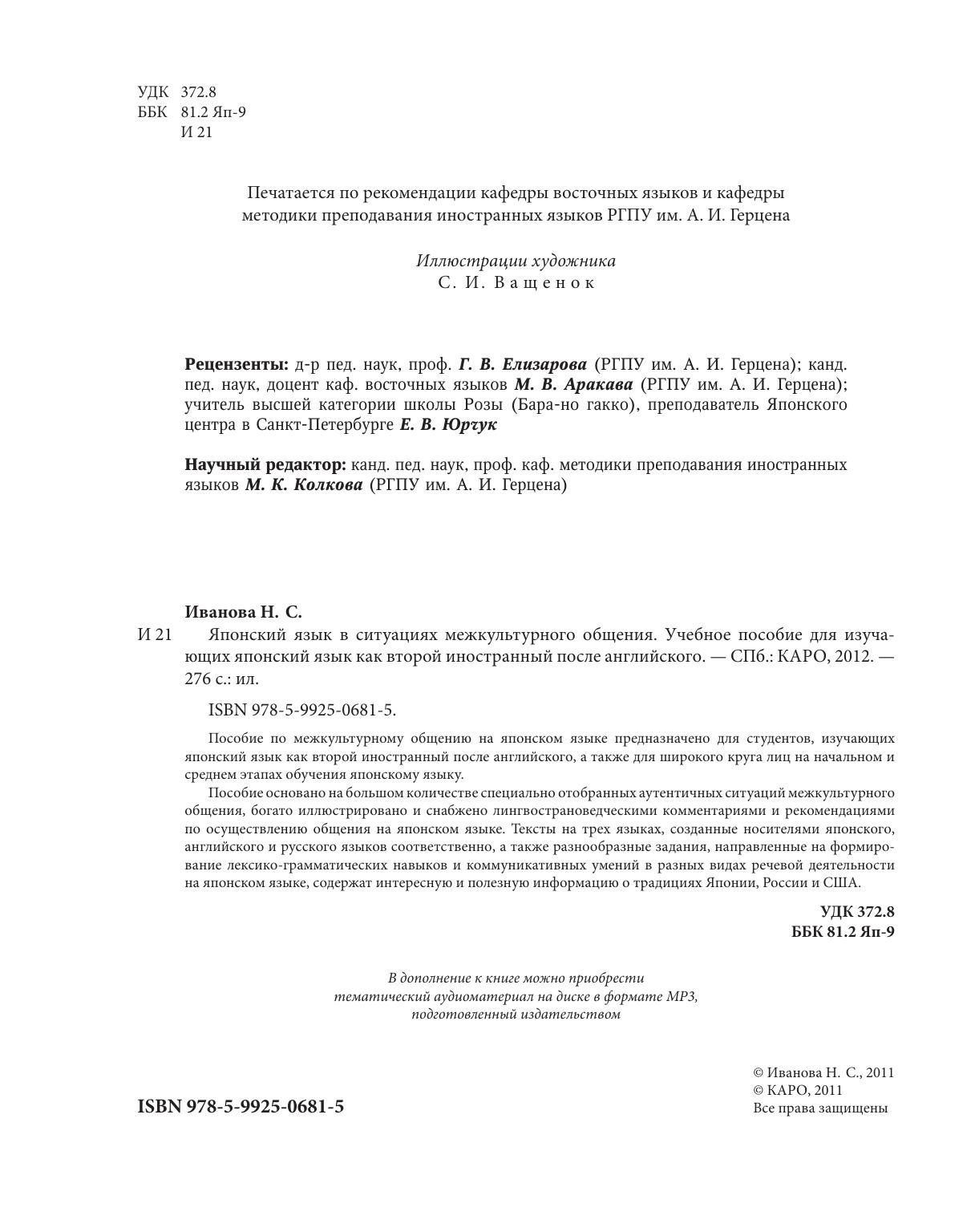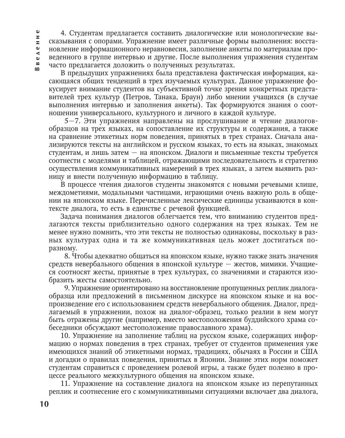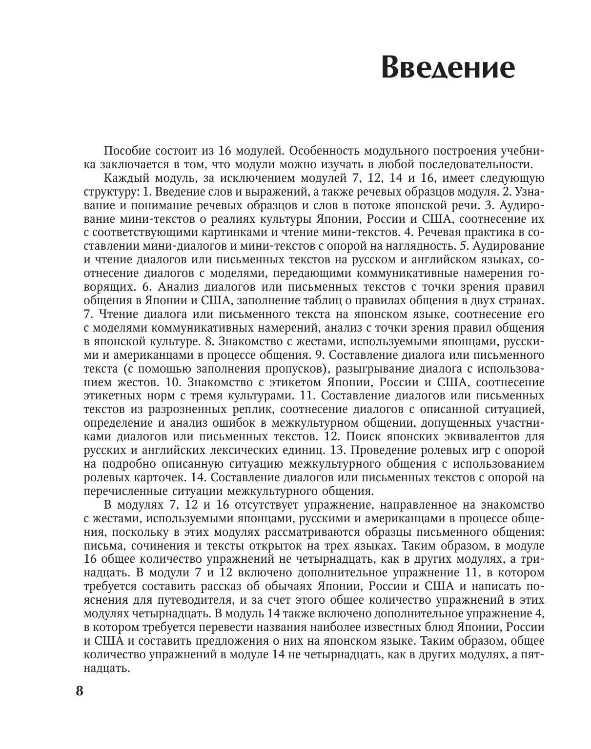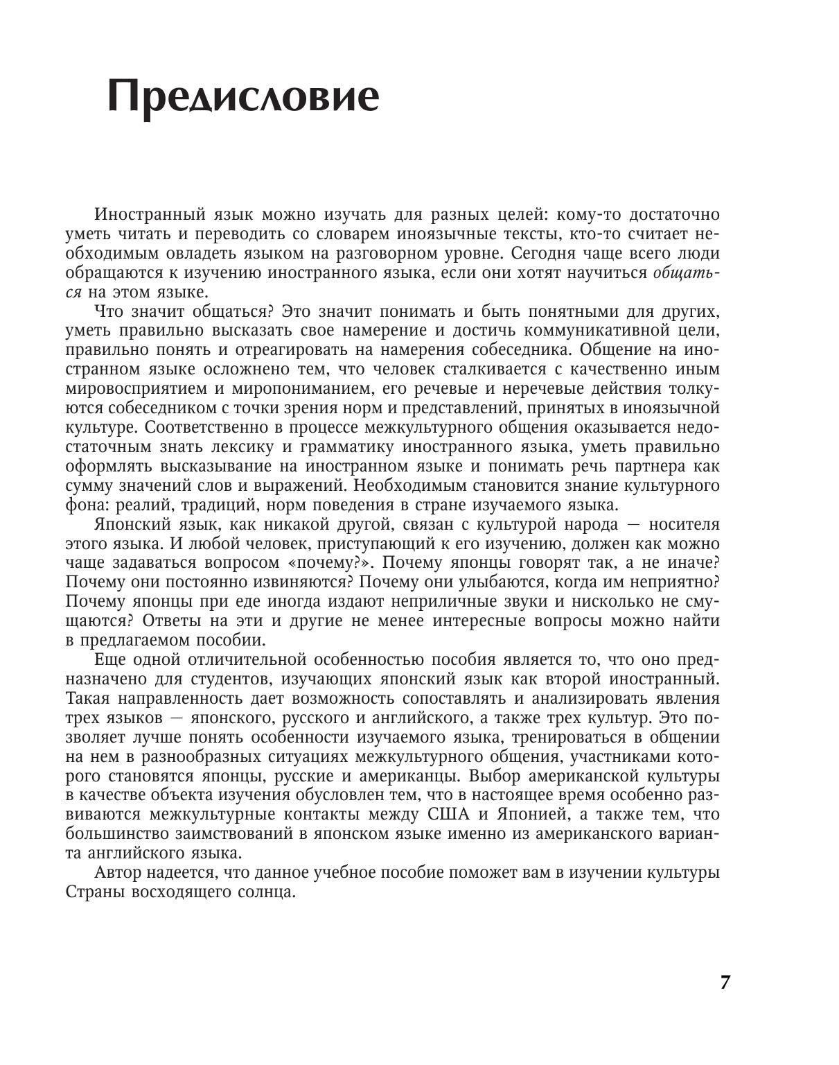 Пособие по межкультурному общению на японском языке предназначено для студентов, изучающих японский язык как второй иностранный после английского, а также для широкого круга лиц на начальном и среднем этапах обучения японскому языку.Пособие основано на большом количестве специально отобранных аутентичных ситуаций межкультурного общения, богато иллюстрировано и снабжено лингвострановедческими комментариями и рекомендациями по осуществлению общения на японском языке. Тексты на трех языках, созданные носителями японского, английского и русского языков соответственно, а также разнообразные задания, направленные на формирование лексико-грамматических навыков и коммуникативных умений в разных видах речевой деятельности на японском языке, содержат интересную и полезную информацию о традициях Японии, России и США.