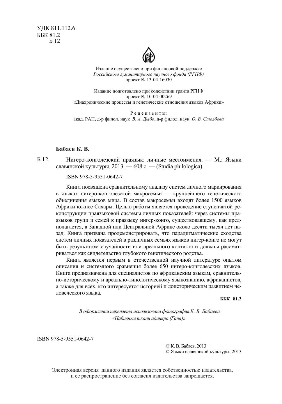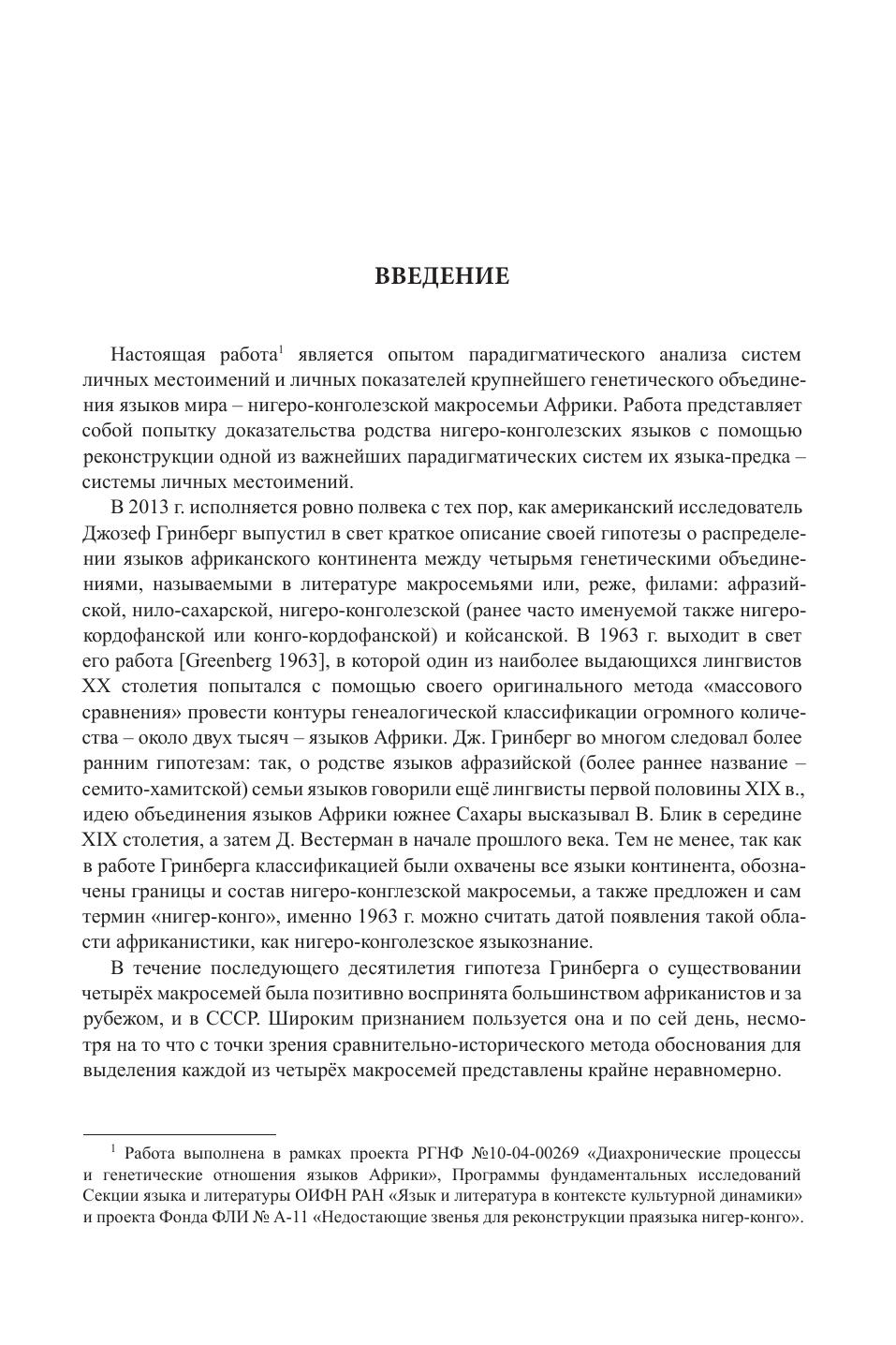 Книга посвящена сравнительному анализу систем личного маркирования в языках нигеро-конголезской макросемьи – крупнейшего генетического объединения языков мира. В состав макросемьи входят более 1500 языков Африки южнее Сахары. Основной целью работы является проведение ступенчатой реконструкции праязыковой системы личных показателей: через системы праязыков групп и семей к праязыку нигер-конго, который, как предполагается, существовал в Западной или Центральной Африке около 10 тысяч лет назад. Книга призвана продемонстрировать, что парадигматические сходства систем личных показателей в различных семьях языков нигер-конго не могут быть результатом случайности или ареального происхождения и должны рассматриваться как свидетельство глубокого генетического родства. Книга является первым в отечественной научной литературе опытом описания и системного сравнения более 650 нигеро-конголезских языков, а также реконструкции праязыка крупнейшей языковой семьи Африки. Книга предназначена для специалистов по африканским языкам, сравнительно-историческому и ареально-типологическому языкознанию, африканистов и всех, кто интересуется историей и доисторическим развитием человеческого языка.