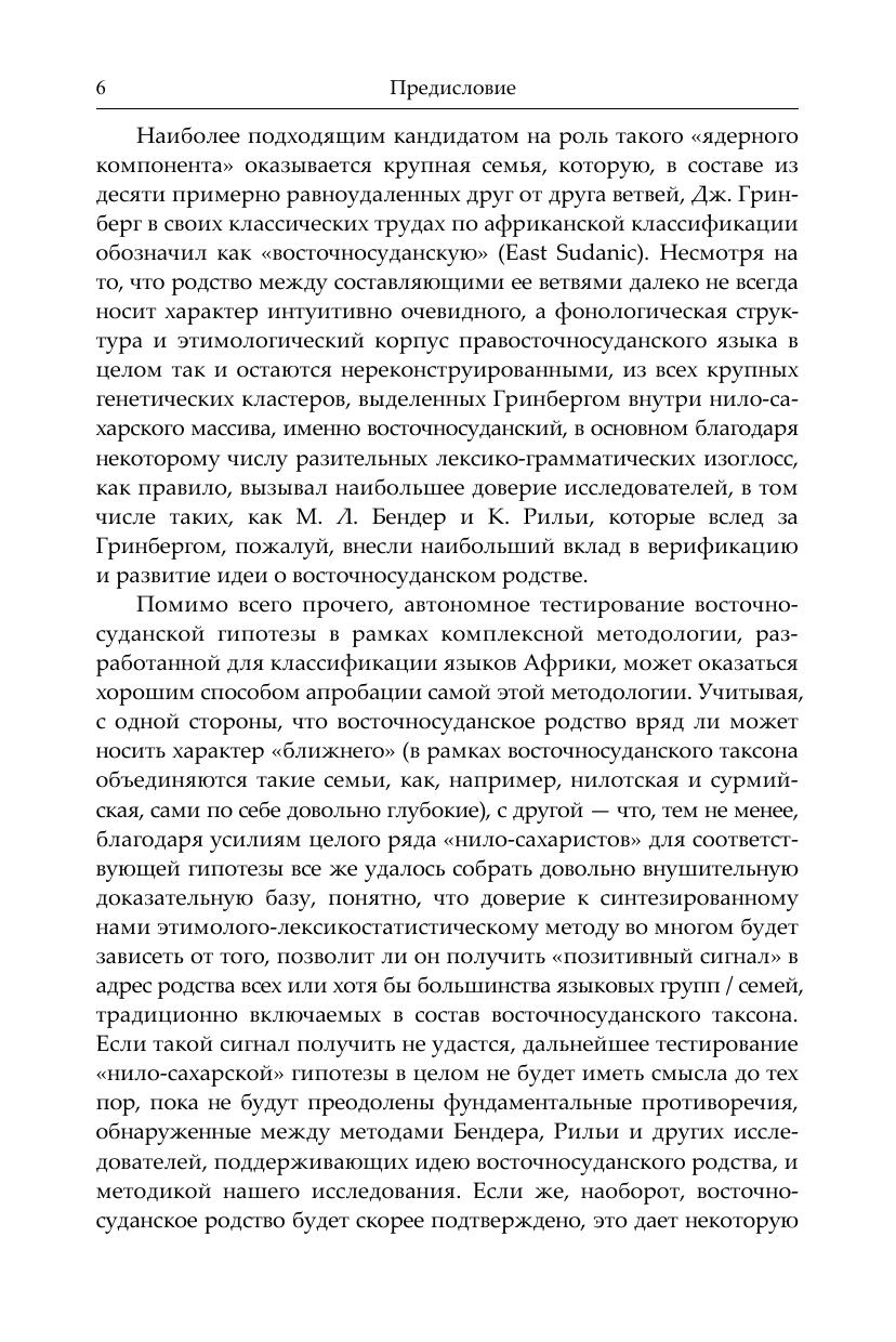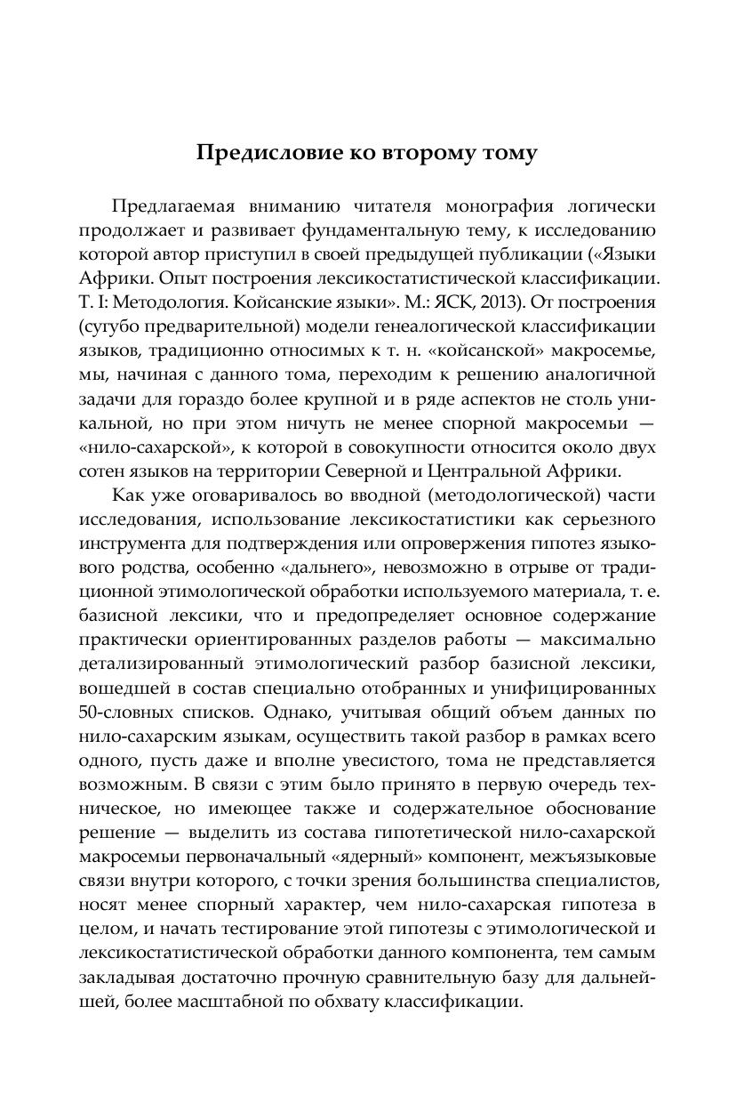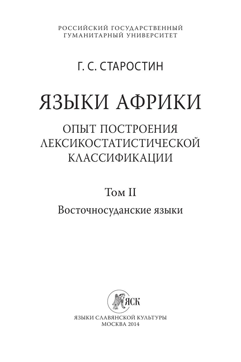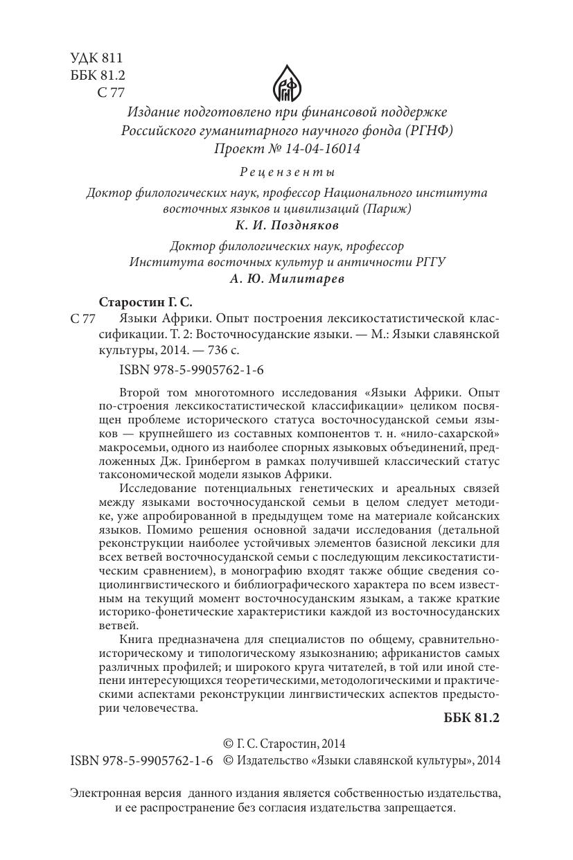 Второй том многотомного исследования «Языки Африки. Опыт по-строения лексикостатистической классификации» целиком посвящен проблеме исторического статуса восточносуданской семьи языков — крупнейшего из составных компонентов т. н. «нило-сахарской» макросемьи, одного из наиболее спорных языковых объединений, предложенных Дж. Гринбергом в рамках получившей классический статус таксономической модели языков Африки. Исследование потенциальных генетических и ареальных связей между языками восточносуданской семьи в целом следует методике, уже апробированной в предыдущем томе на материале койсанских языков. Помимо решения основной задачи исследования (детальной реконструкции наиболее устойчивых элементов базисной лексики для всех ветвей восточносуданской семьи с последующим лексикостатистическим сравнением), в монографию входят также общие сведения социолингвистического и библиографического характера по всем известным на текущий момент восточносуданским языкам, а также краткие историко-фонетические характеристики каждой из восточносуданских ветвей. Книга предназначена для специалистов по общему, сравнительно-историческому и типологическому языкознанию, африканистов самых различных профилей, и широкого круга читателей, в той или иной степени интересующихся теоретическими, методологическими и практическими аспектами реконструкции лингвистических аспектов предыстории человечества.