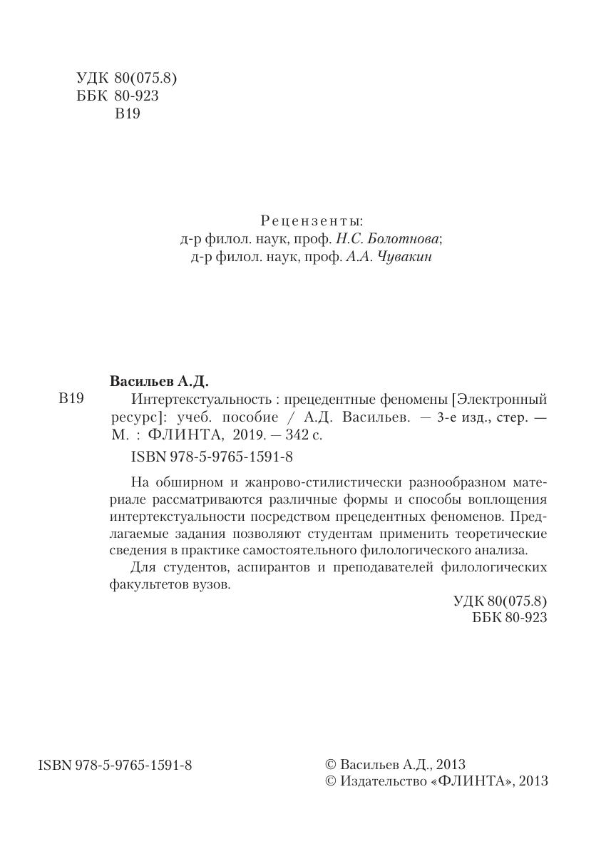 На обширном и жанрово-стилистически разнообразном материале рассматриваются различные формы и способы воплощения интертекстуальности посредством прецедентных феноменов. Предлагаемые задания позволяют студентам применить теоретические сведения в практике самостоятельного филологического анализа. Для студентов, аспирантов и преподавателей филологических факультетов вузов