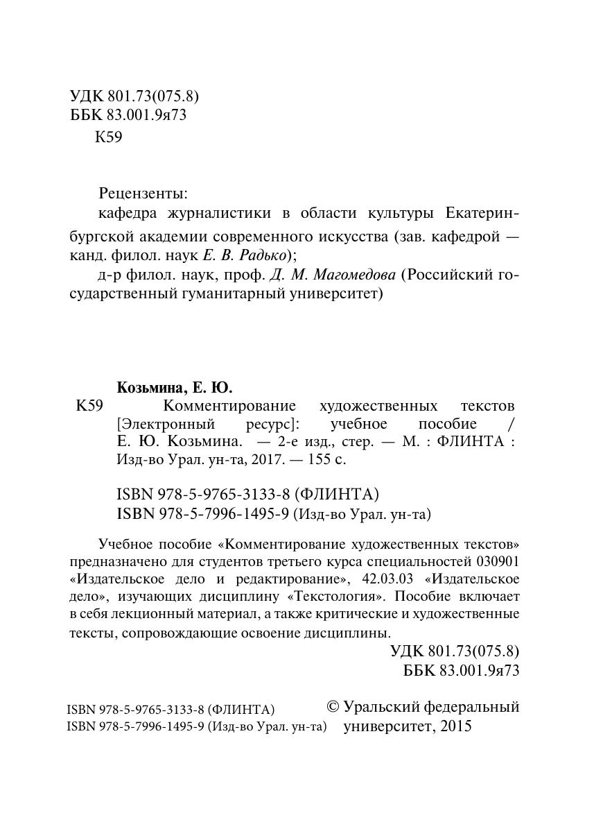 Учебное пособие «Комментирование художественных текстов» предназначено для студентов третьего курса специальностей 030901 «Издательское дело и редактирование», 42.03.03 «Издательское дело», изучающих дисциплину «Текстология». Пособие включает в себя лекционный материал, а также критические и художественные тексты, сопровождающие освоение дисциплины.