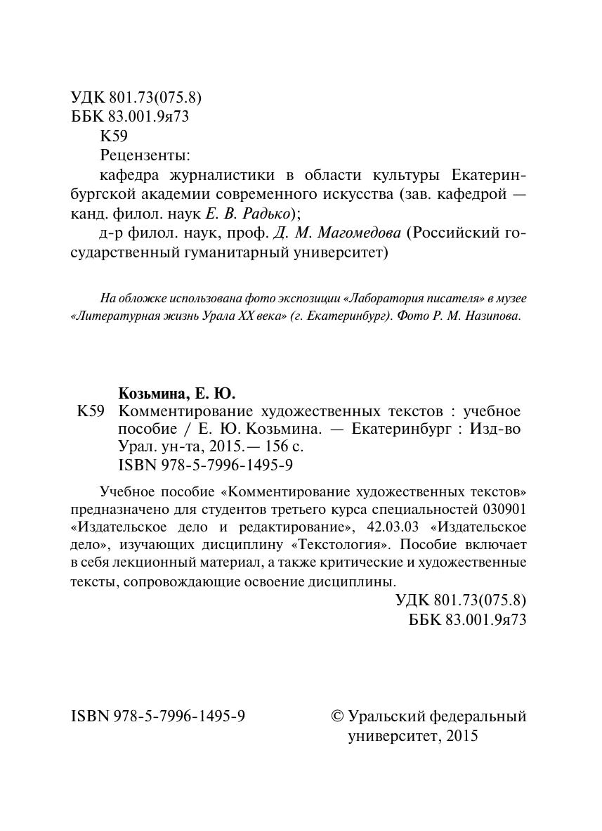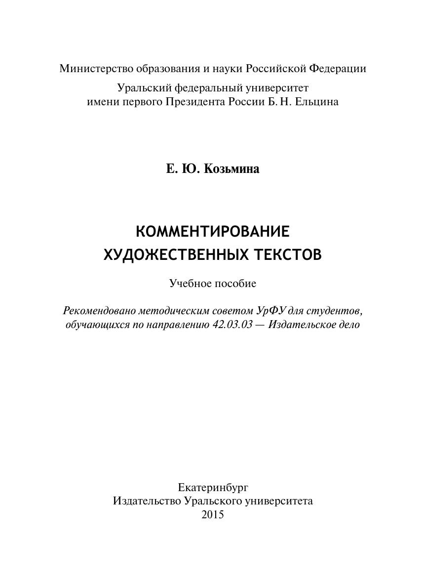 Учебное пособие «Комментирование художественных текстов» предназначено для студентов третьего курса специальностей 030901 «Издательское дело и редактирование», 42.03.03 «Издательское дело», изучающих дисциплину «Текстология». Пособие включает в себя лекционный материал, а также критические и художественные тексты, сопровождающие освоение дисциплины.