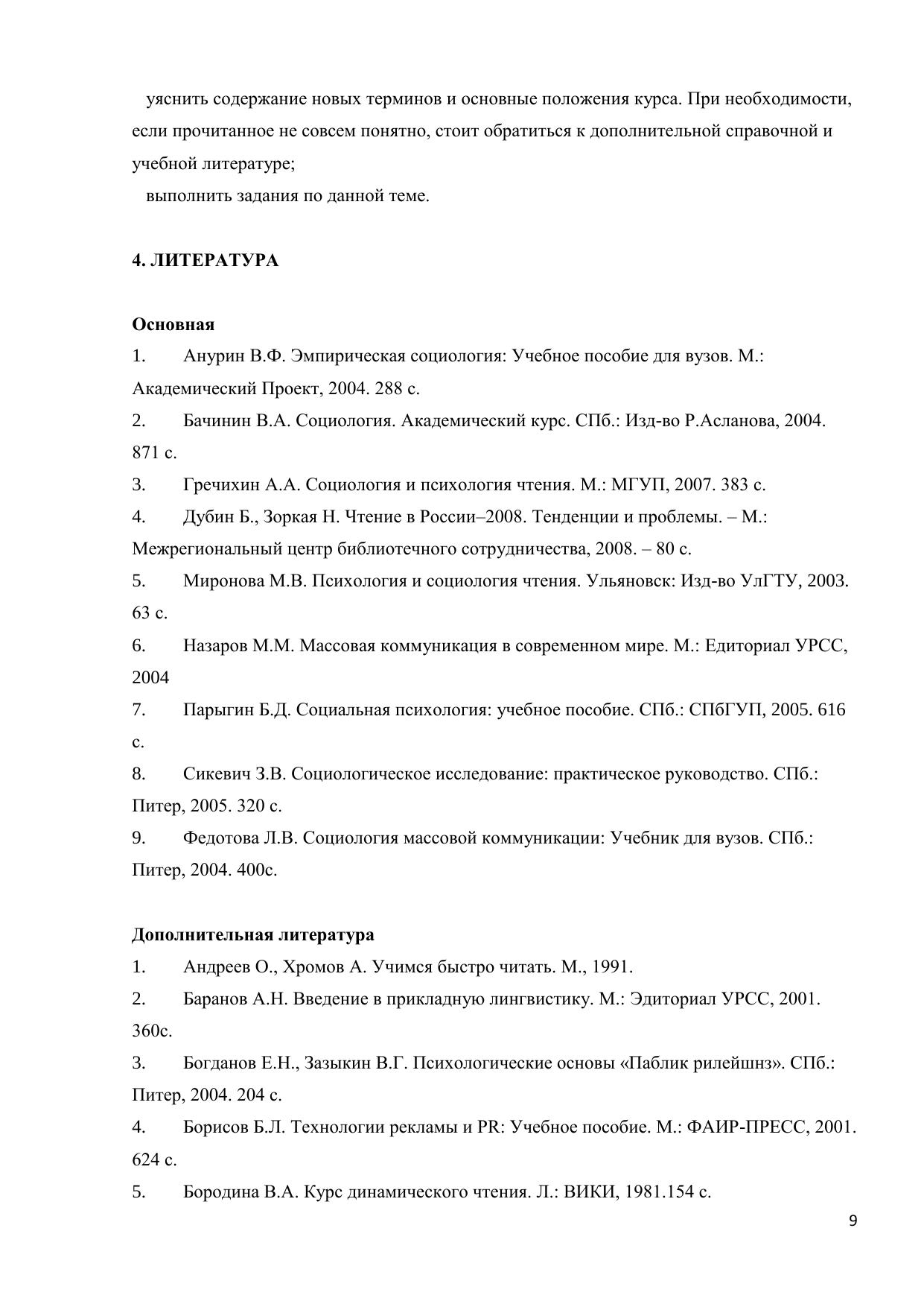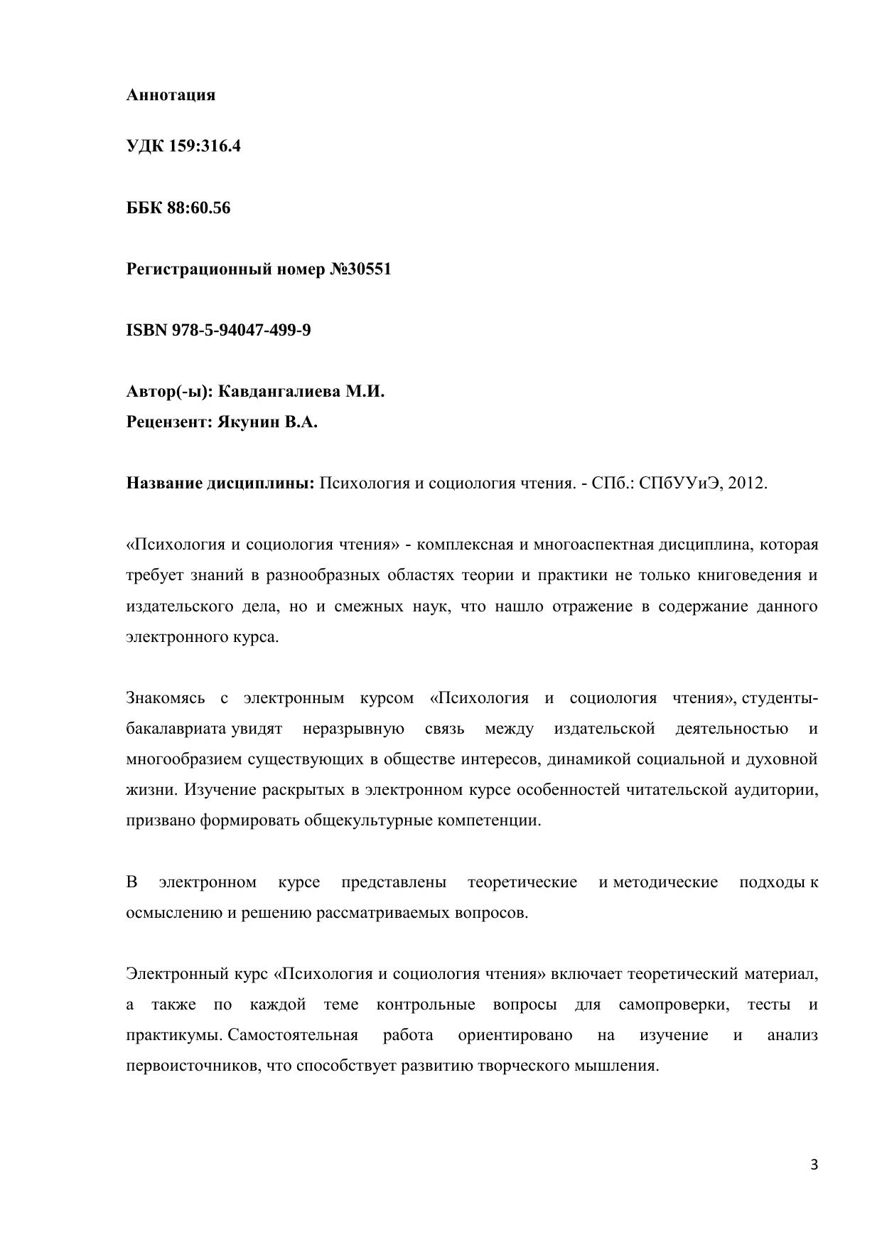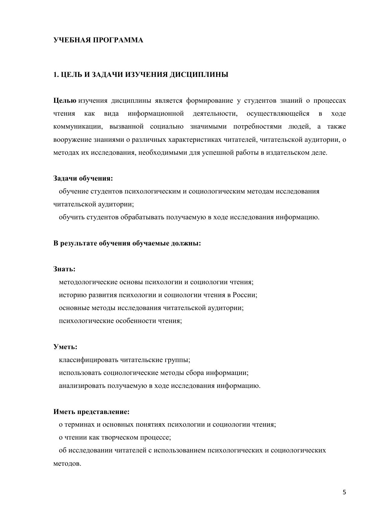 «Психология и социология чтения» - комплексная и многоаспектная дисциплина, которая требует знаний в разнообразных областях теории и практики не только книговедения и издательского дела, но и смежных наук, что нашло отражение в содержание данного электронного курса. Знакомясь с электронным курсом «Психология и социология чтения», студенты-бакалавриата увидят неразрывную связь между издательской деятельностью и многообразием существующих в обществе интересов, динамикой социальной и духовной жизни. Изучение раскрытых в электронном курсе особенностей читательской аудитории, призвано формировать общекультурные компетенции. В электронном курсе представлены теоретические и методические подходы к осмыслению и решению рассматриваемых вопросов. Электронный курс «Психология и социология чтения» включает теоретический материал, а также по каждой теме контрольные вопросы для самопроверки, тесты и практикумы. Самостоятельная работа ориентировано на изучение и анализ первоисточников, что способствует развитию творческого мышления. Курс предназначен для студентов-бакалавриата, обучающихся по направлению «Издательское дело».