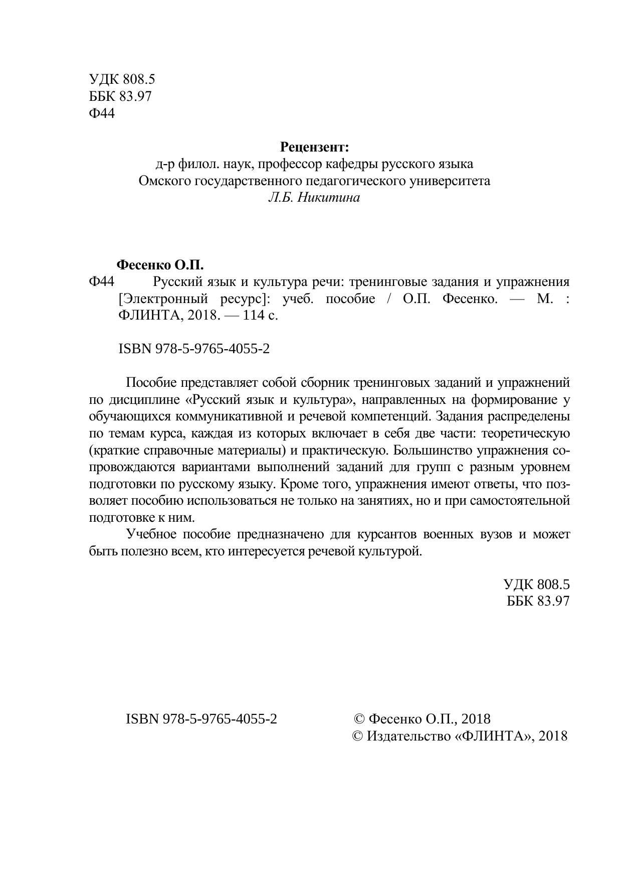 Пособие представляет собой сборник тренинговых заданий и упражнений по дисциплине «Русский язык и культура», направленных на формирование у обучающихся коммуникативной и речевой компетенций. Задания распределены по темам курса, каждая из которых включает в себя две части: теоретическую (краткие справочные материалы) и практическую. Большинство упражнения сопровождаются вариантами выполнений заданий для групп с разным уровнем подготовки по русскому языку. Кроме того, упражнения имеют ответы, что позволяет пособию использоваться не только на занятиях, но и при самостоятельной подготовке к ним.